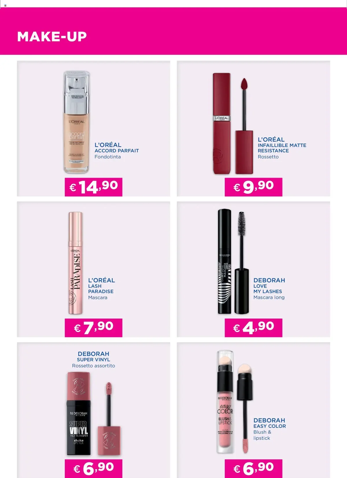 Tra le proposte più allettanti, spiccano le offerte sul make-up. Potrete trovare il rinomato L'ORÉAL ACCORD PARFAIT Fondotinta a soli €14,90, ideale per una base perfetta. Per le labbra, non mancano opzioni come il L'ORÉAL INFAILLIBLE MATTE RESISTANCE Rossetto a €9,90 o il DEBORAH SUPER VINYL Rossetto assortito a €6,90. Gli occhi saranno protagonisti con il L'ORÉAL LASH PARADISE Mascara a €7,90 e il DEBORAH LOVE MY LASHES Mascara long a €4,90. E per un tocco di colore sulle unghie, approfittate del ROYAL BEAUTY Smalto 40 Colori da 5 ml a un incredibile SUPER PREZZO di €1,00, o l'Ombretto assortito DEBORAH 24 ORE COLOR POWER a €6,90 per completare il look.