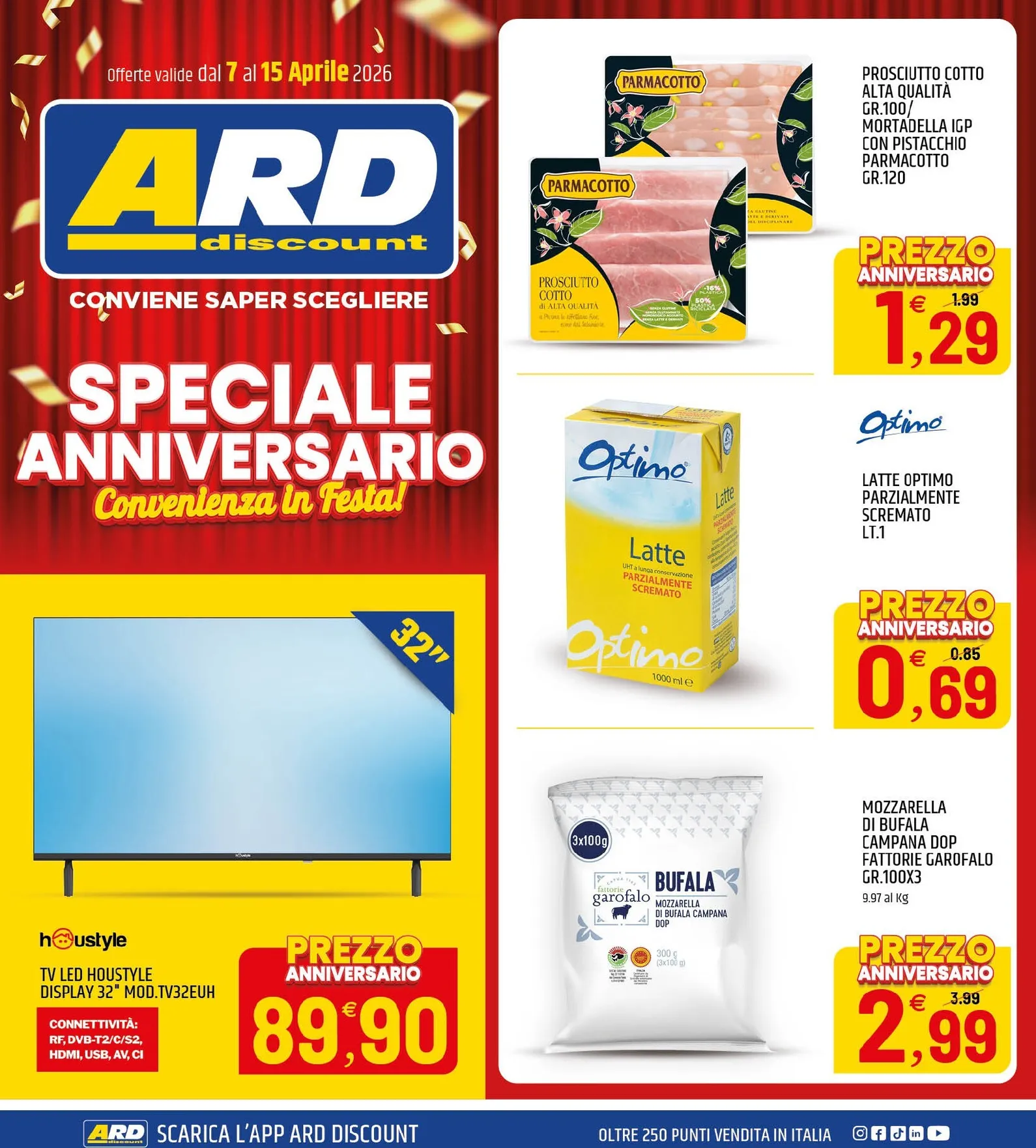 Ard Discount festeggia il suo anniversario con nuovo offerte eccezionali, valide dal 7 al 15 Aprile 2026. Tra le nuove offerte spicca il TV LED Houstyle da 32 pollici a soli 89,90€. Nel banco frigo, il Prosciutto Cotto Parmacotto (120g) è proposto a 1,99€. Queste occasioni dimostrano come Ard Discount Volantino dal 07/04/2026 possa garantire un grande risparmio sulla spesa. È il momento perfetto per approfittare di queste fantastiche opportunità per la famiglia.