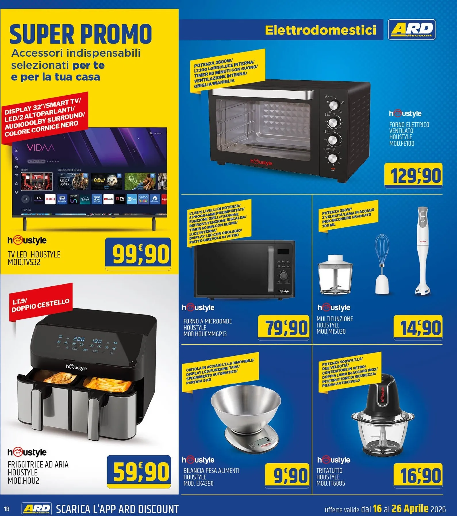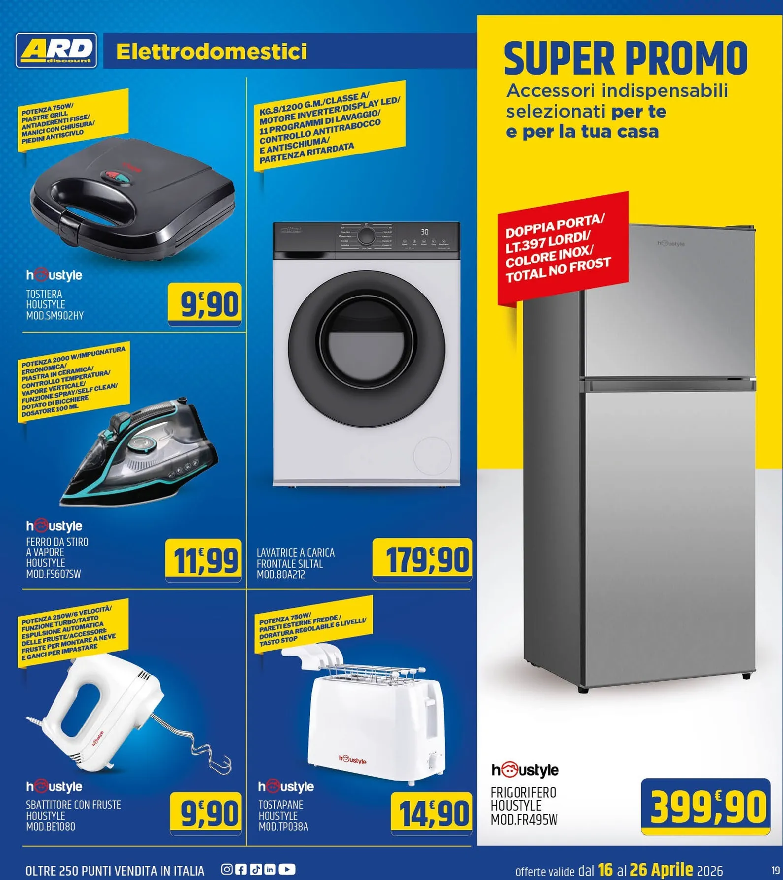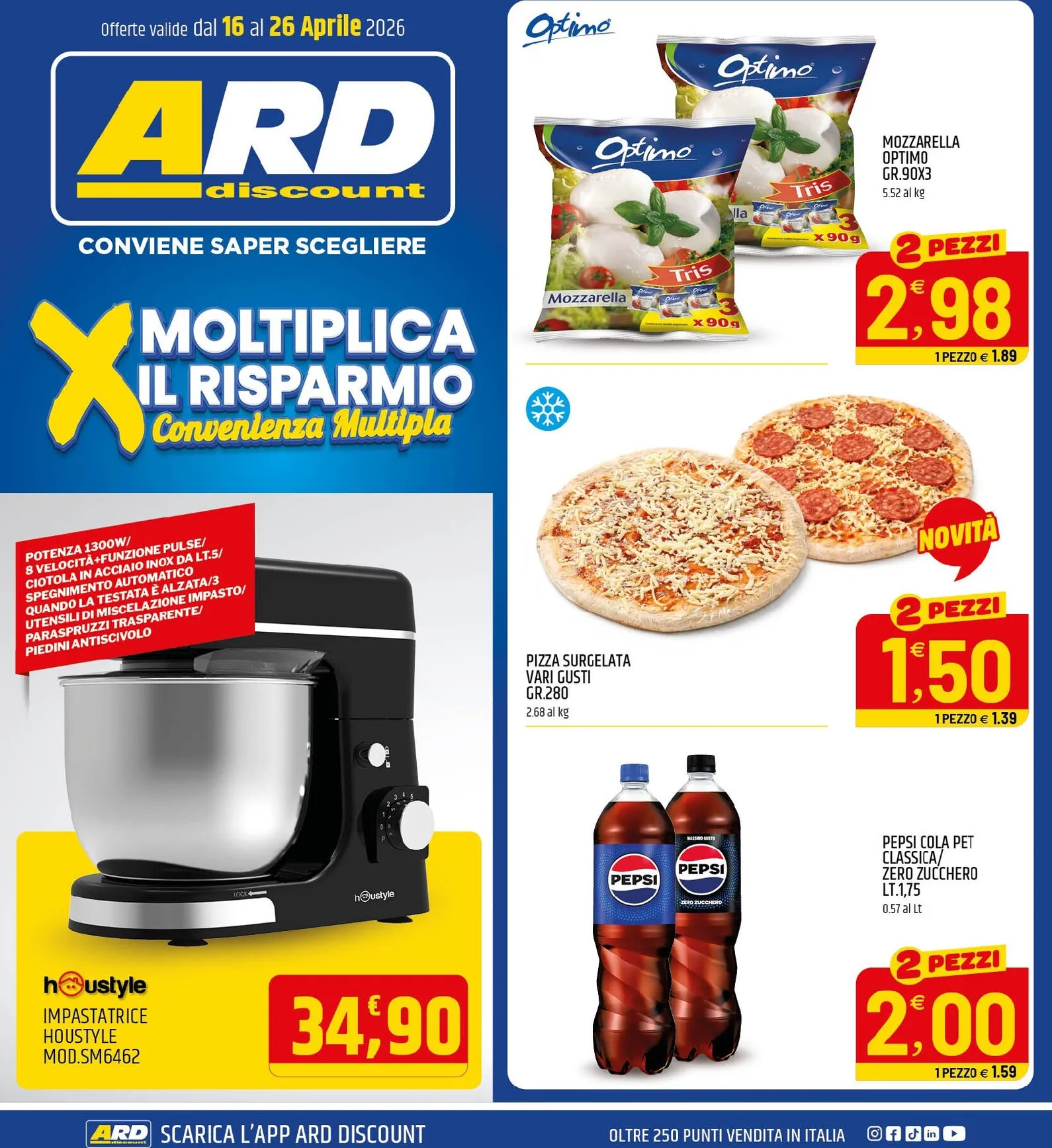 Dal 16 al 26 Aprile 2026, il nuovo volantino Ard Discount invita a moltiplicare il risparmio. In copertina spicca l’impastatrice Houstyle a soli 34,90€, un’occasione imperdibile. Per la spesa quotidiana, la mozzarella Optimo in confezione da tre pezzi è proposta a 2,98€. Queste nuovo offerte sono pensate per offrire massima convenienza, e il nostro Ard Discount Volantino dal 16/04/2026 vi guiderà tra le migliori proposte della settimana.