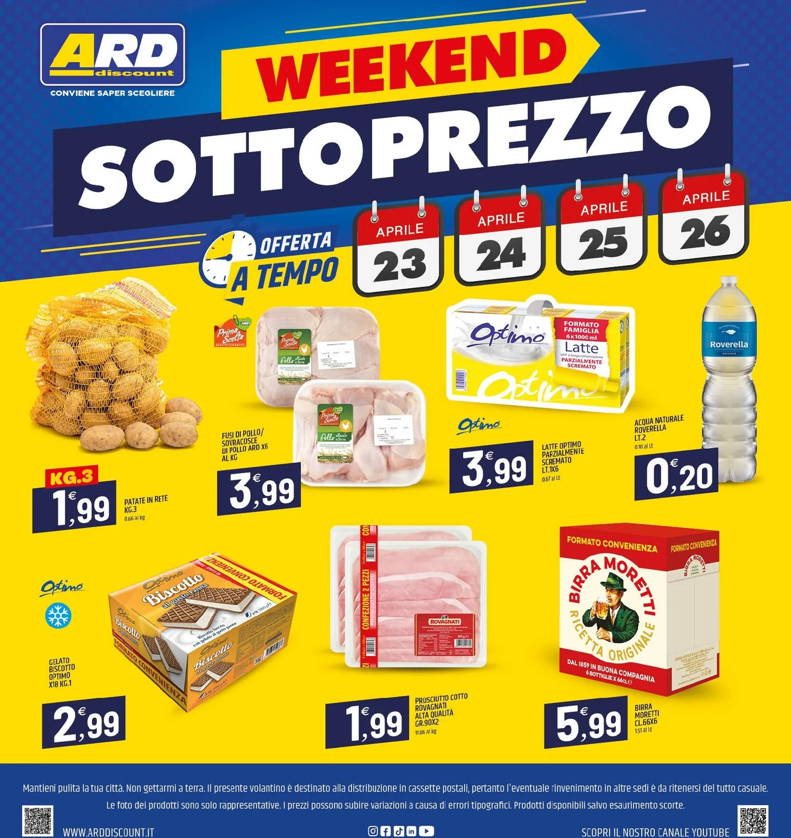 Il gran finale è riservato al “Weekend Sottoprezzo”, con sconti dal 23 al 26 Aprile. Tra le migliori occasioni, la rete da 3 kg di patate a 1,99€ e l’acqua naturale Roverella a soli 0,20€. La Birra Moretti in formato convenienza è a 5,99€. Esplorare queste nuovo offerte è semplice; il nostro Ard Discount Volantino dal 16/04/2026 è lo strumento perfetto per scoprirne i dettagli. Consultate il Ard Discount Volantino completo.