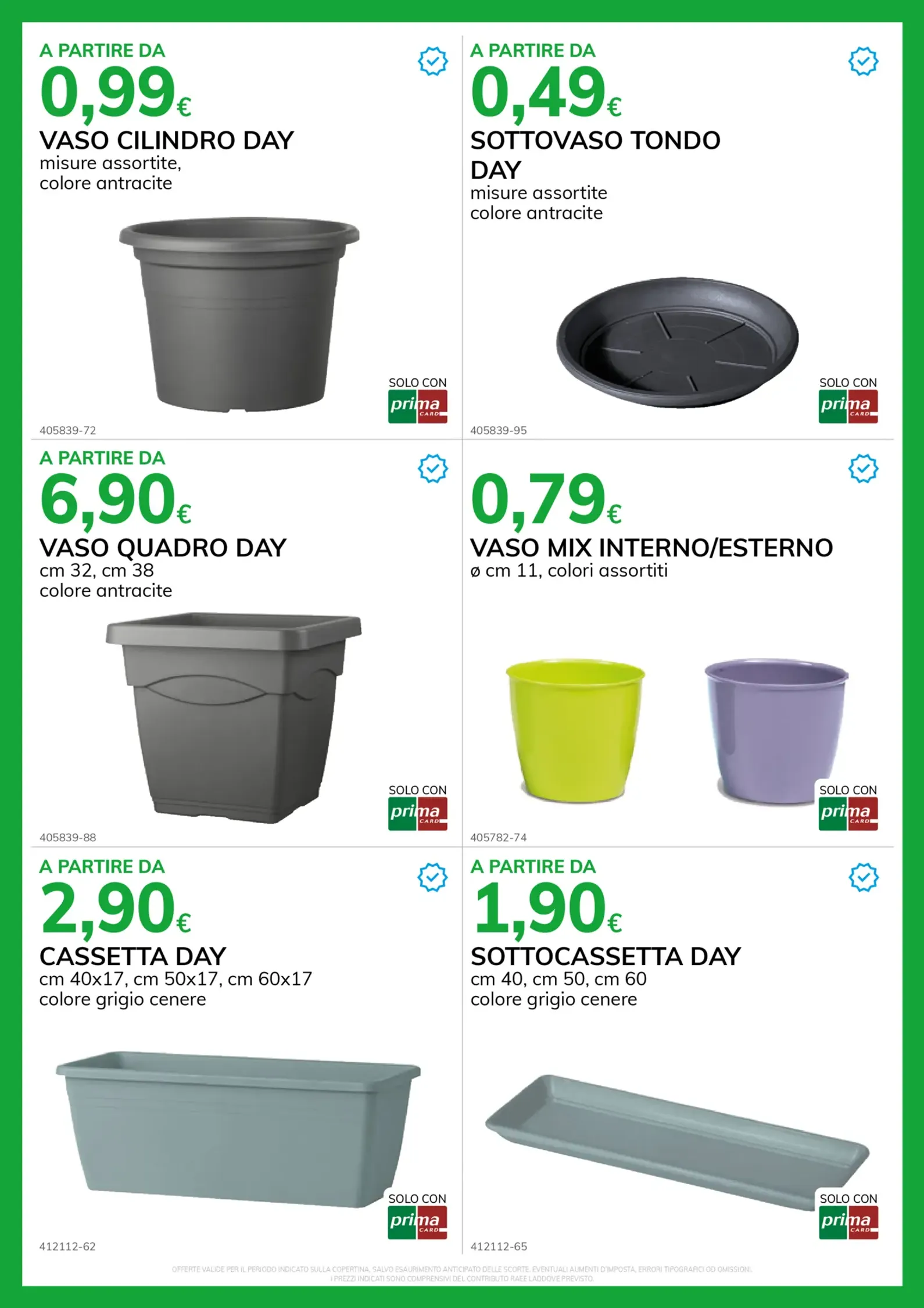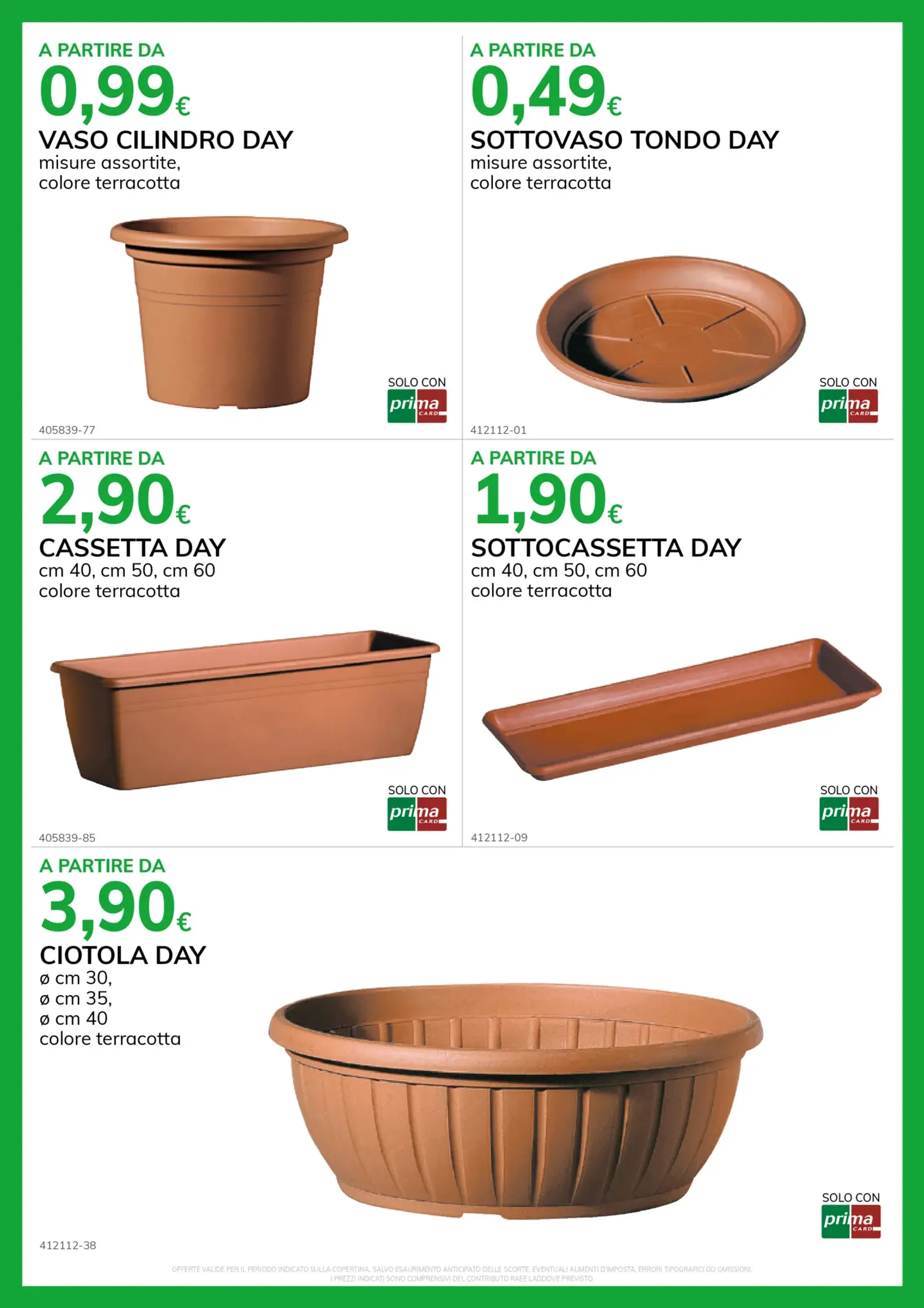 L’assortimento di vasi è vasto e conveniente. Si parte dal Vaso Cilindro Day, disponibile in varie misure a soli 0,99€. Per spazi più grandi, la Cassetta Day da 40, 50 o 60 cm è proposta da 2,90€, mentre la Ciotola Day, con diametri fino a 40 cm, parte da 3,90€. Non mancano i relativi sottovasi, come il Sottovaso Tondo da 0,49€. Tutti gli articoli sono nel classico colore terracotta, perfetti per ogni stile.