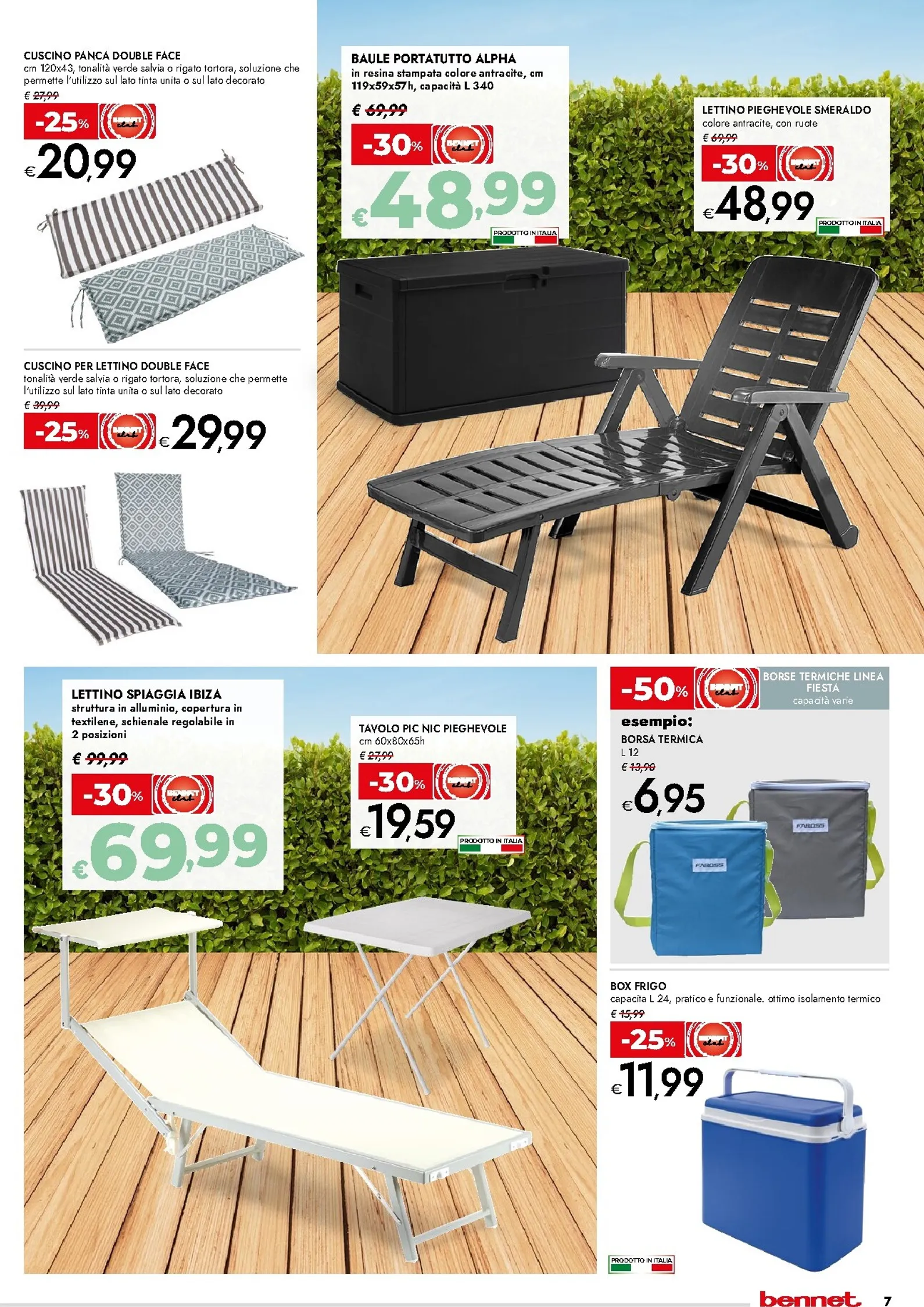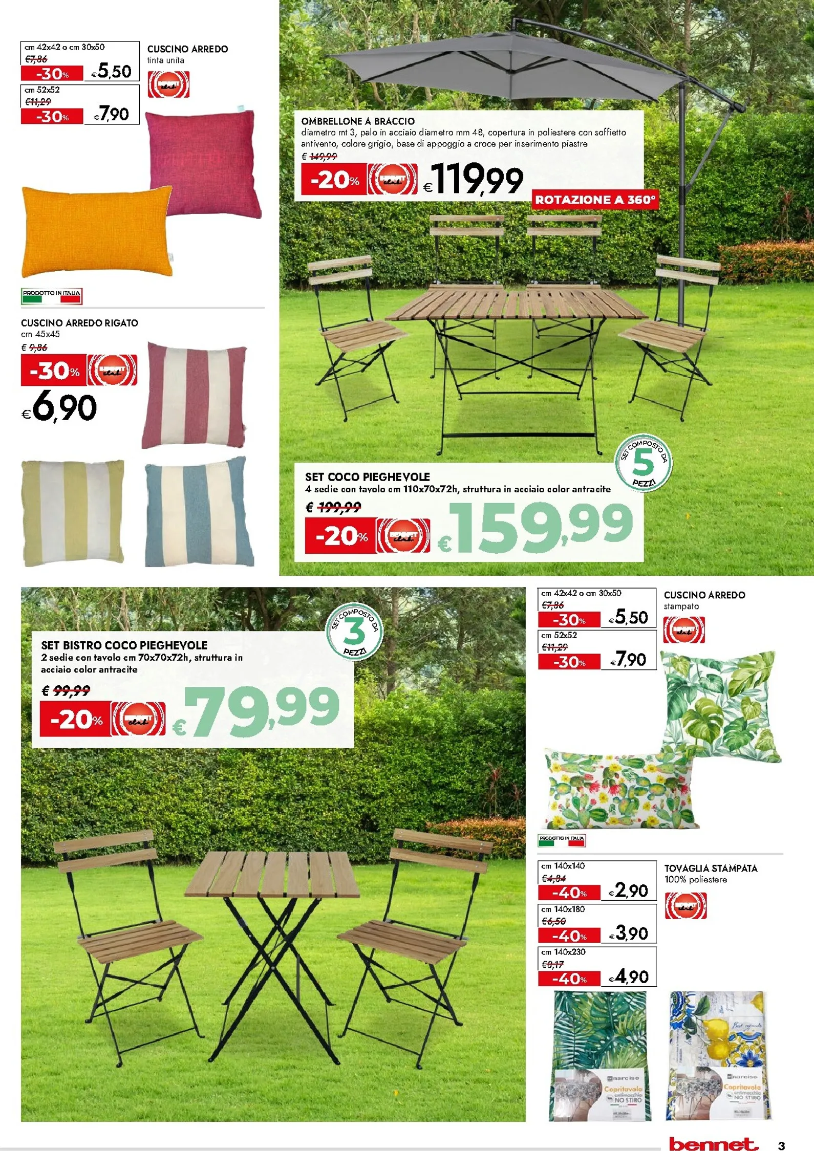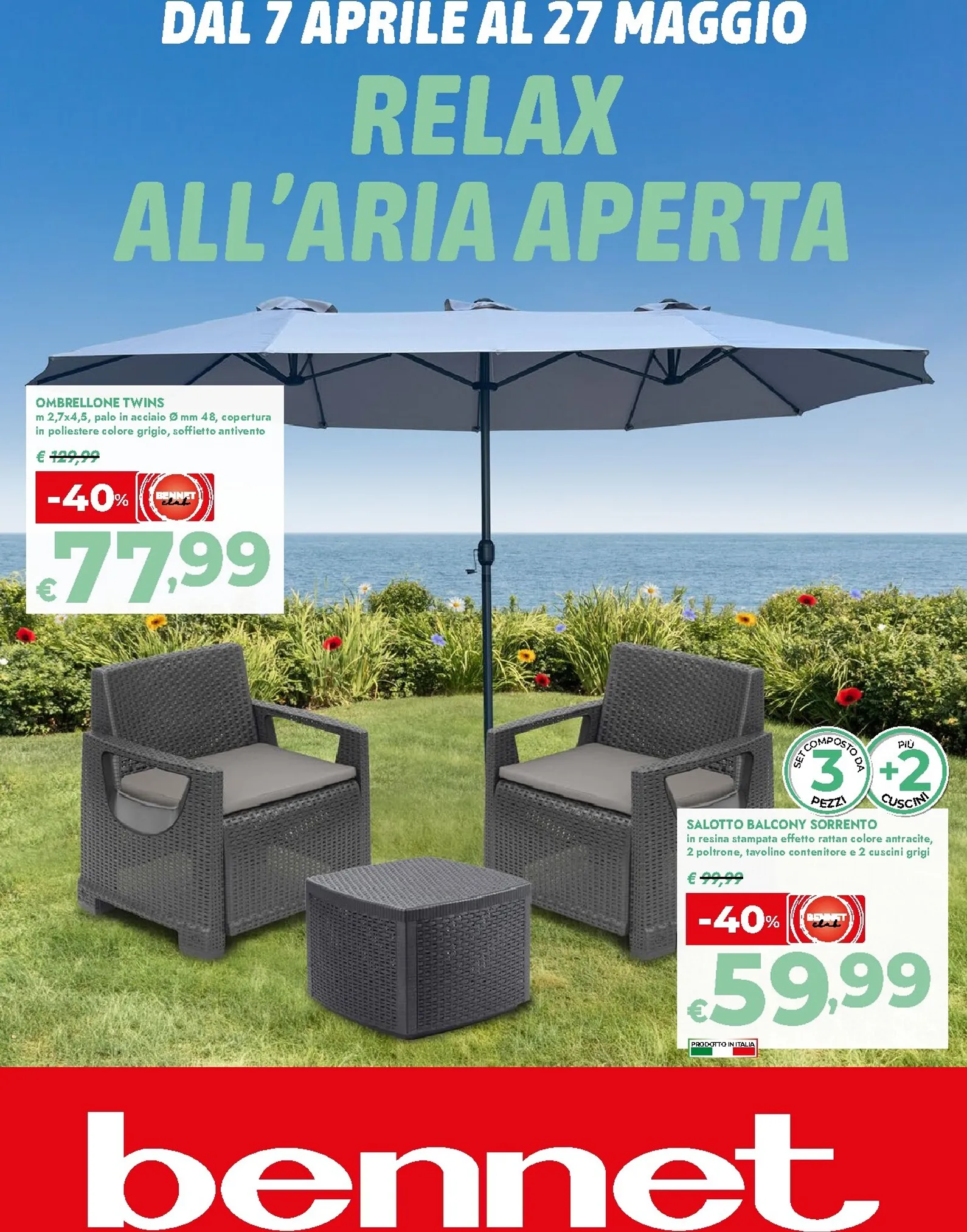 La bella stagione si avvicina e Bennet dedica il suo nuovo volantino al relax all’aria aperta, con una selezione di arredi da giardino pensati per trasformare ogni spazio esterno in un’oasi di pace. Le catalogo e offerte, valide dal 7 Aprile al 27 Maggio, offrono l’opportunità perfetta per rinnovare balconi, terrazzi e giardini. Sfogliando questo catalogo si scoprono tantissime offerte imperdibili per godersi il sole e le giornate più lunghe, grazie a Bennet Volantino dal 07/04/2026 che unisce qualità e convenienza. Dagli ombrelloni più ampi ai salottini compatti, ogni soluzione è studiata per garantire il massimo comfort e stile, permettendovi di creare l’atmosfera desiderata per i vostri momenti di svago.