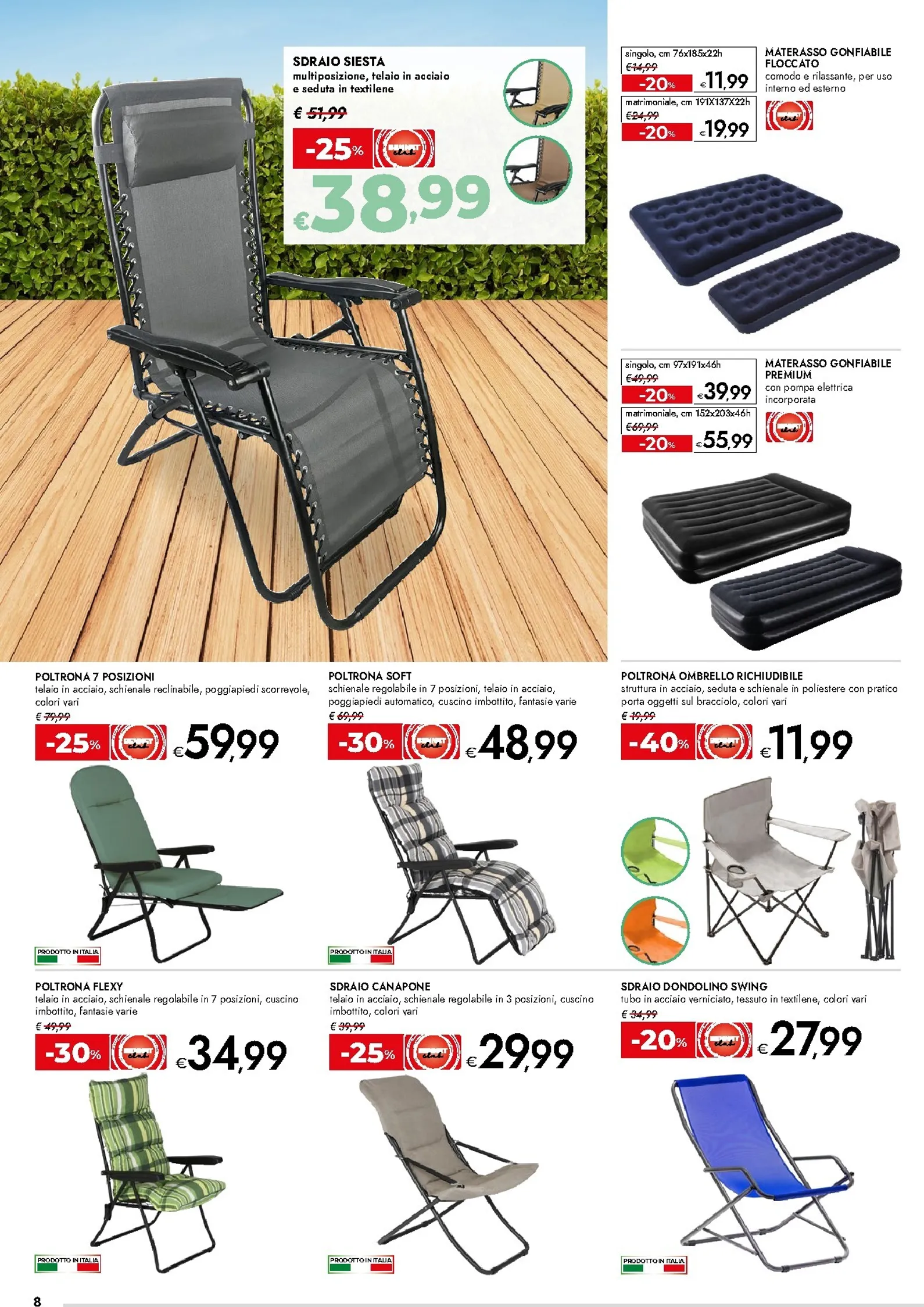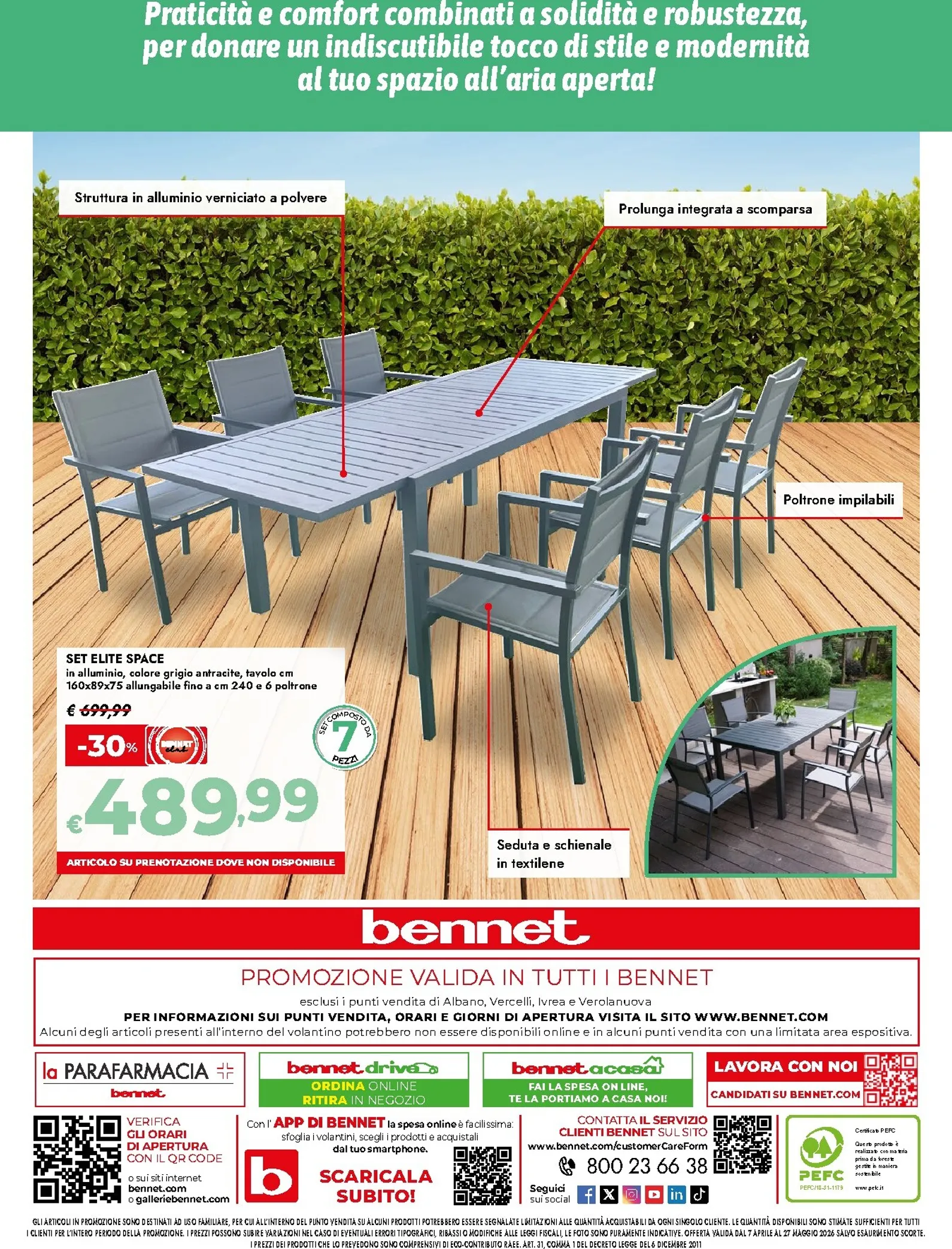 Per chi desidera il massimo in termini di design e capienza, il Set Elite Space è la scelta premium del catalogo. Composto da un tavolo allungabile fino a 240 cm e sei poltrone impilabili, è perfetto per ospitare amici e famiglia in grande stile, al prezzo speciale di 489,99€. La struttura in alluminio garantisce robustezza e modernità. Questo volantino presenta davvero soluzioni per ogni esigenza, e per scoprire tutte le catalogo e offerte disponibili, basta consultare il nuovo Bennet Volantino. Approfittate subito di Bennet Volantino dal 07/04/2026 per preparare il vostro spazio esterno alla bella stagione e vivere momenti indimenticabili.