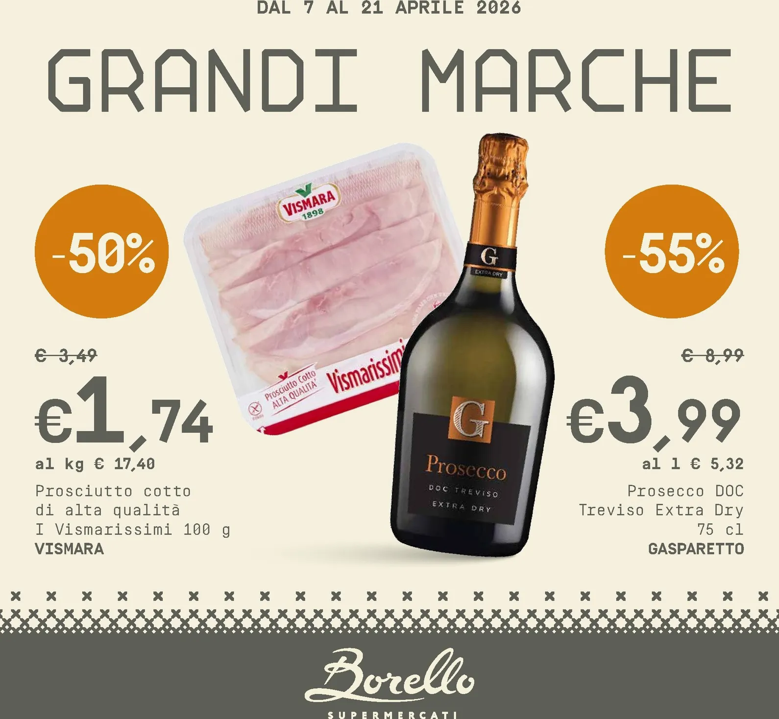 Dal 7 al 21 aprile 2026, Borello lancia una promozione imperdibile sulle grandi marche. Questo nuovo volantino offre sconti eccezionali fino al 55%, un’ottima occasione per fare scorta di prodotti di qualità. Le Borello Supermercati Volantino dal 07/04/2026 di questa quindicina sono state selezionate per garantire il massimo risparmio. In copertina, il Prosciutto Cotto Vismara è a metà prezzo, soli 1,74€, mentre il Prosecco DOC Gasparetto scende a 3,99€ (-55%).