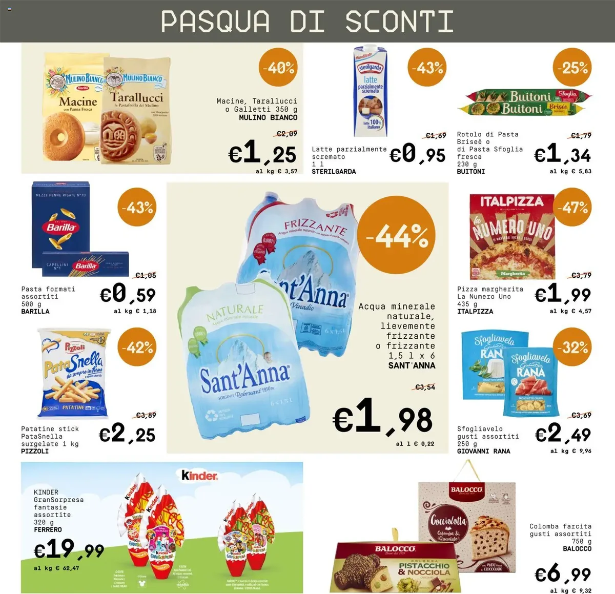 Ma le sorprese non finiscono qui. Per la colazione o la merenda, troverai le Macine, Tarallucci o Galletti 350 g MULINO BIANCO con il 40% di sconto a €1,25, e il Latte parzialmente scremato 1 l STERILGARDA a soli €0,95, con un risparmio del 43%. Per i tuoi piatti veloci o le preparazioni più elaborate, non perdere la Pasta formati assortiti 500 g BARILLA a soli €0,59, anch'essa con un 43% di sconto, o la Pizza margherita La Numero Uno 435 g ITALPIZZA a €1,99, scontata del 47%. E per i più piccoli, o per un dolce pensiero, la KINDER GranSorpresa fantasie assortite 320 g FERRERO è disponibile a €19,99.