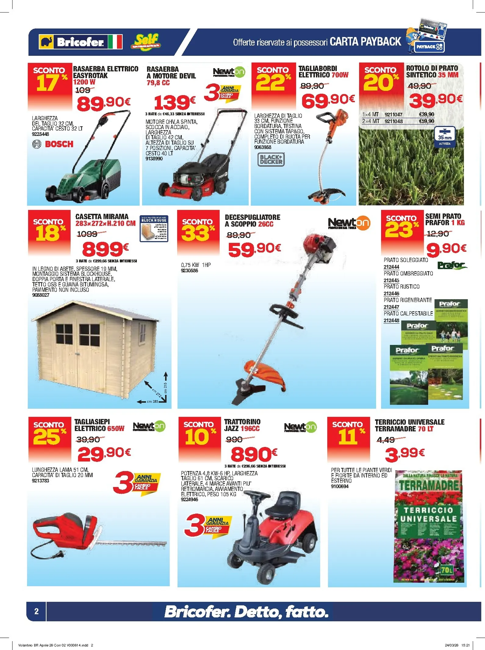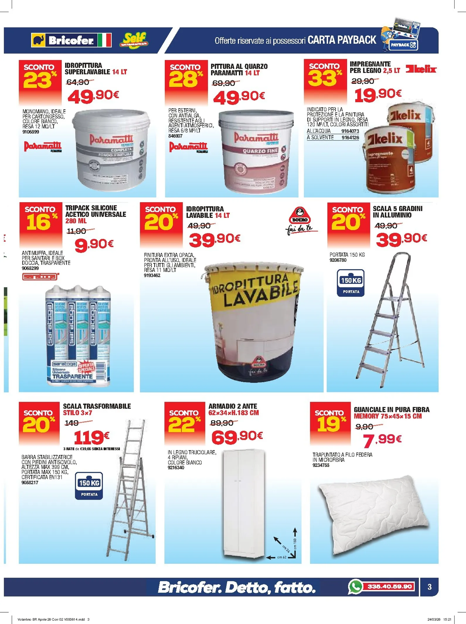 Sfogliando le pagine, le nuovo offerte continuano. Per la cura del verde, il rasaerba a motore Devil è offerto a 139€, mentre il decespugliatore a scoppio è proposto a 59,90€. Per rinfrescare le pareti, l’idropittura traspirante da 14 litri è a 29,90€ e la pittura al quarzo è perfetta per gli esterni. Questo nuovo catalogo è ideale per ogni progetto. Per l’organizzazione interna, l’armadio a due ante è scontato a 69,90€.