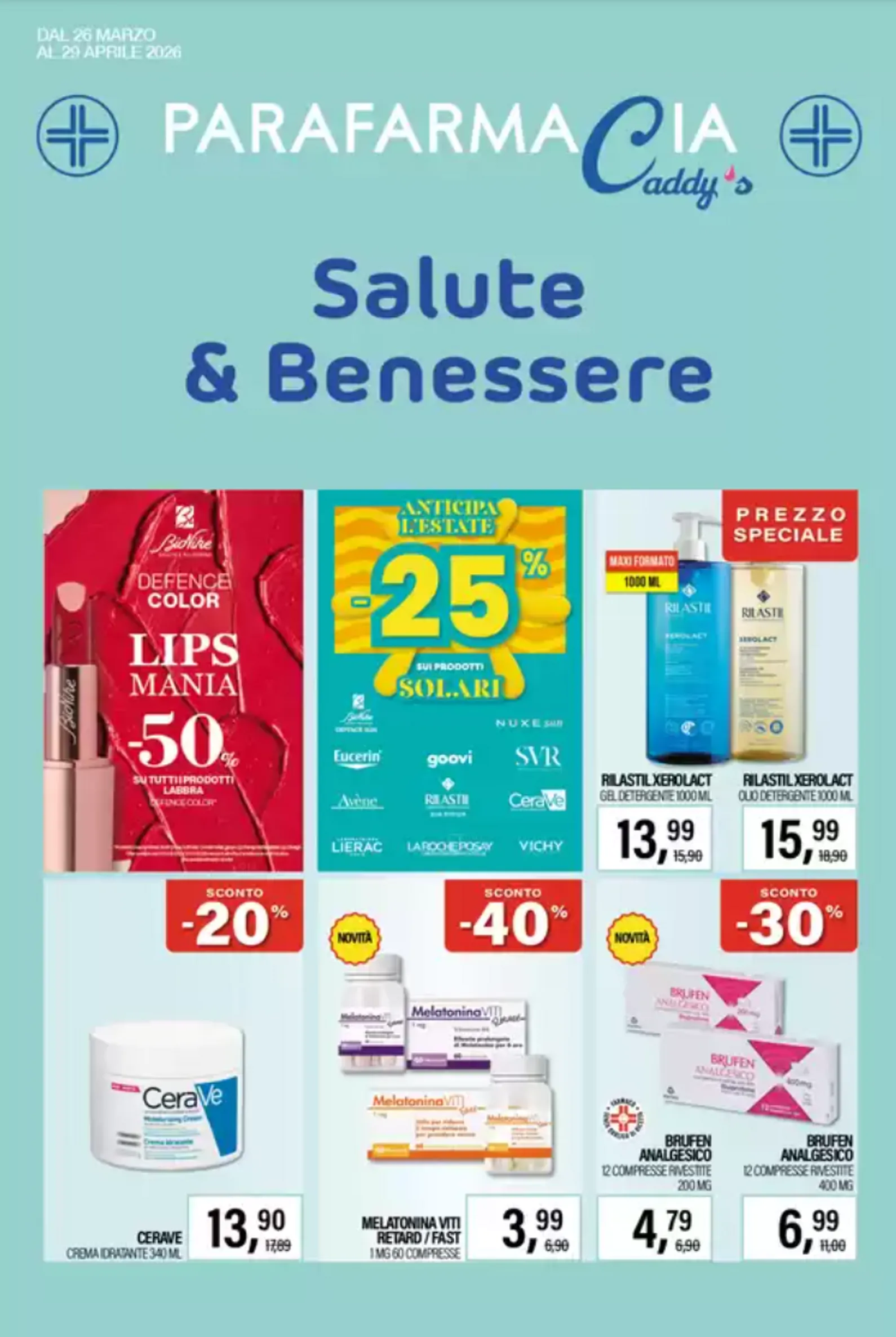 Il nuovo volantino Parafarmacia Caddy’s, valido dal 26 Marzo al 29 Aprile 2026, celebra la salute e il benessere. Con la primavera, questo catalogo si riempie di catalogo e offerte per la cura della persona. Le offerte disponibili sono un’occasione perfetta per prepararsi alla nuova stagione, e la nostra analisi di Caddys Volantino dal 26/03/2026 vi aiuterà a navigare tra gli sconti più vantaggiosi. Scoprite come prendervi cura di voi stessi risparmiando su una vasta selezione di articoli.