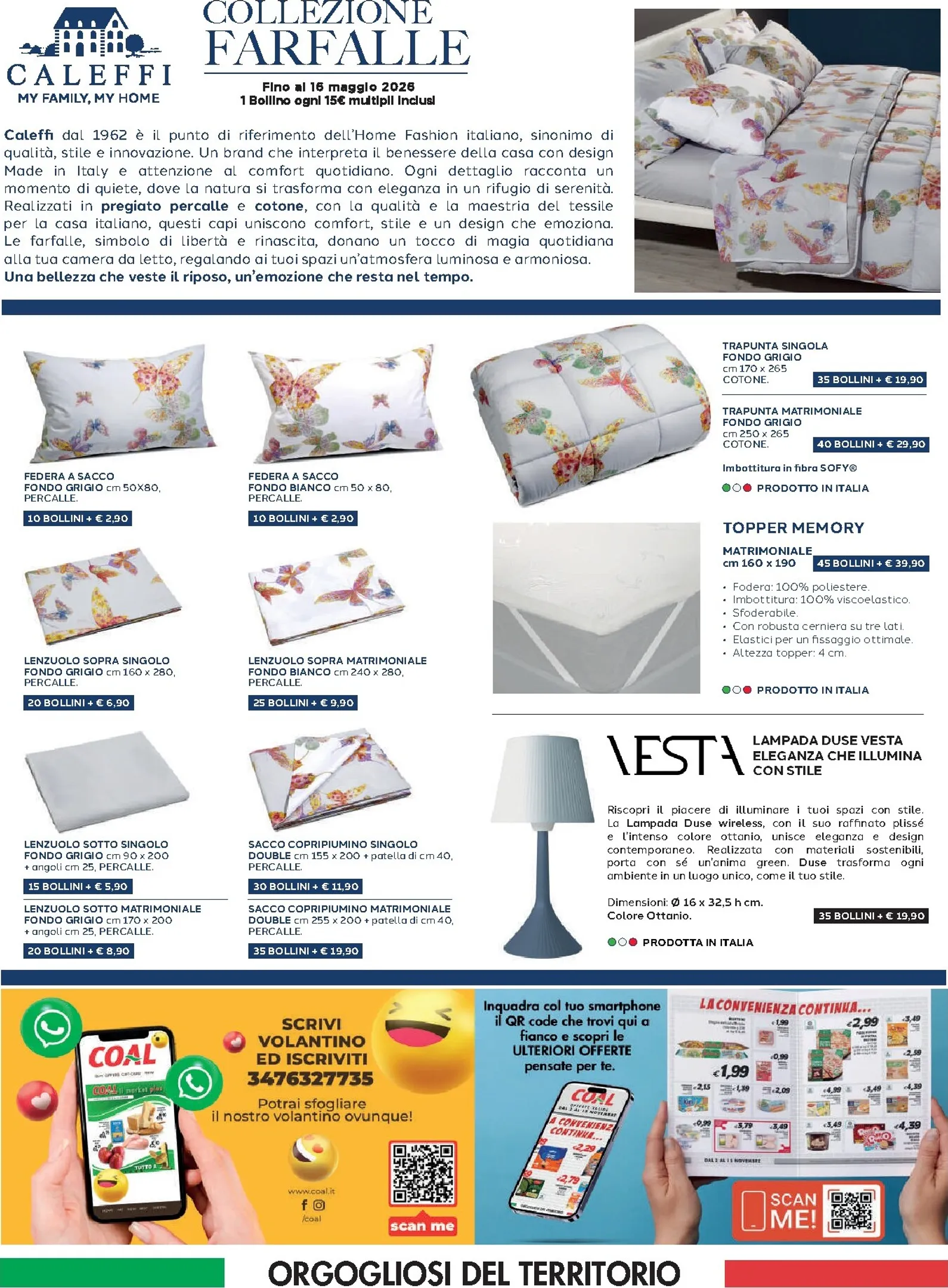 Oltre agli alimentari, il volantino propone la “Collezione Farfalle” di Califfi, con lenzuola e trapunte per la casa. Queste offerte della settimana speciali arricchiscono l’offerta settimanale. Per scoprire ogni dettaglio e non perdere neanche un’occasione, Coal Volantino dal 09/04/2026 è la risorsa ideale. Consultate subito il nuovo Coal Volantino per approfittare di tutte le migliori offerte.