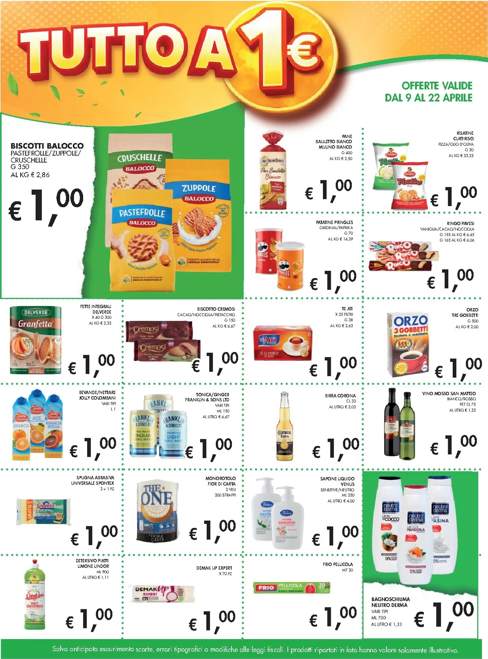 Nella sezione a 1 euro troviamo tantissime occasioni: la Mozzarella Coal, il Pesto Viva La Mamma e gli Gnocchi De Cecco. Per uno snack ci sono i Wurstel Wuber e le Pringles. Non mancano prodotti per la cura personale come il bagnoschiuma Neutro Derma. Le offerte di questa settimana permettono di fare una spesa completa e intelligente, riempiendo il carrello senza svuotare il portafoglio.
