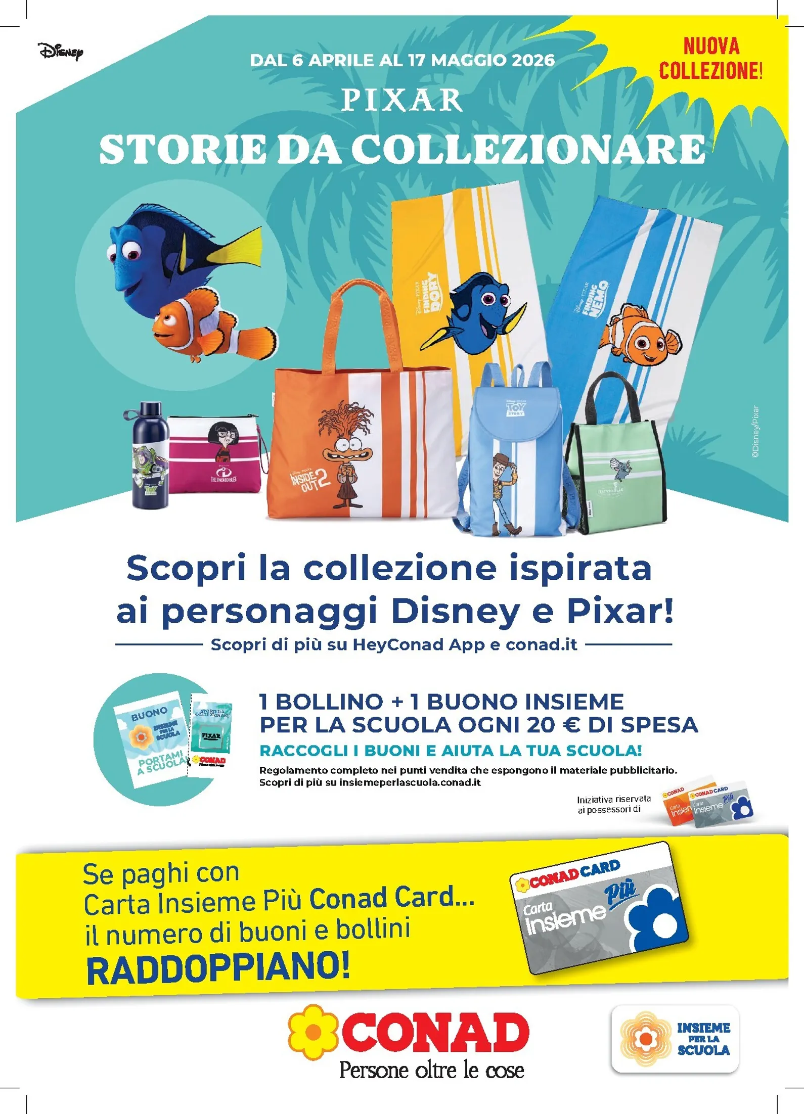 La nuova iniziativa Conad, valida dal 6 aprile al 17 maggio 2026, porta la magia Disney Pixar nelle vostre case con la collezione “Storie da Collezionare”. Ogni 20 euro di spesa danno diritto a un bollino, rendendo ogni acquisto un passo verso premi esclusivi. Questa è una delle migliori opportunità della settimana per unire la spesa al divertimento. Le Conad Volantino dal 06/04/2026 presenti nel volantino sono pensate per accontentare tutti, trasformando la routine in un’avventura.