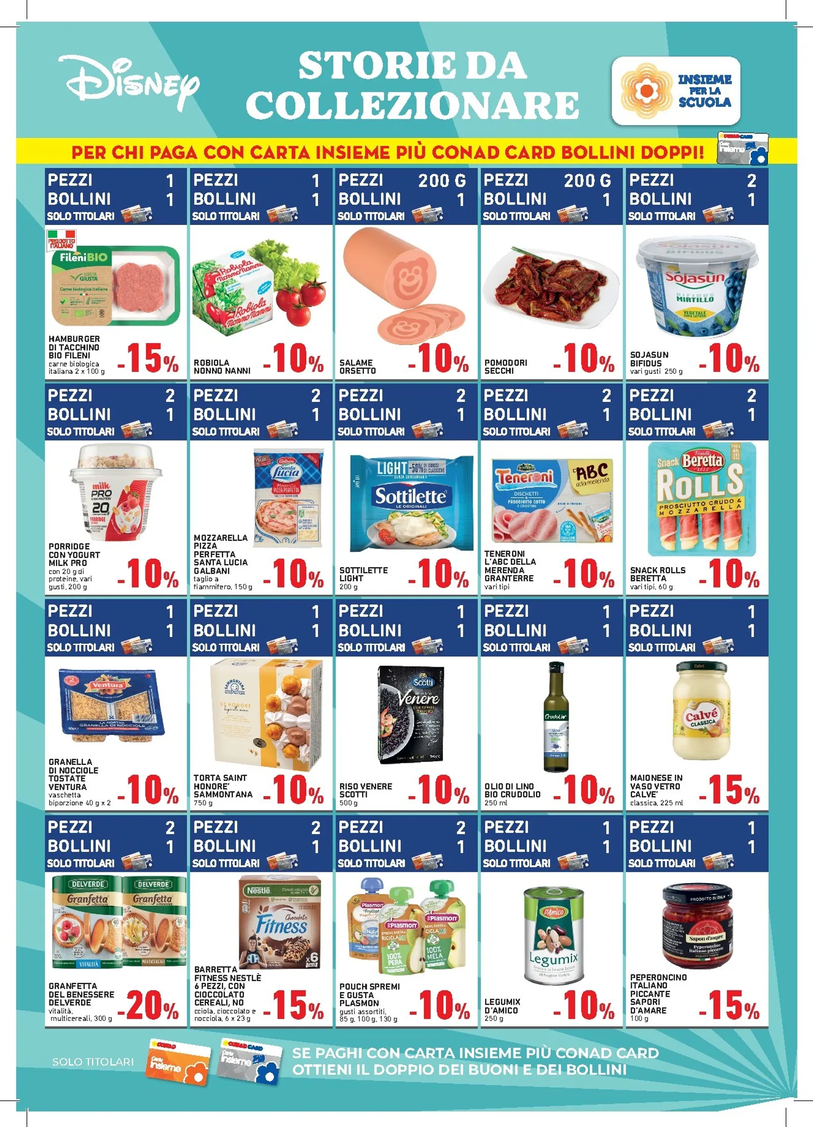 Per completare la collezione più in fretta, Conad propone una selezione di prodotti sponsor che accelerano la raccolta. Acquistando articoli come gli Hamburger Fileni Bio (-15%) o la Mozzarella Pizza Perfetta Galbani (-10%), riceverete bollini aggiuntivi. Tra le tante offerte valide in questo periodo spiccano anche le Sottilette Light e i Pomodori Pelati Mutti. Questa selezione speciale vi permette di fare scorta dei vostri prodotti preferiti e guadagnare più punti per la fantastica raccolta.
