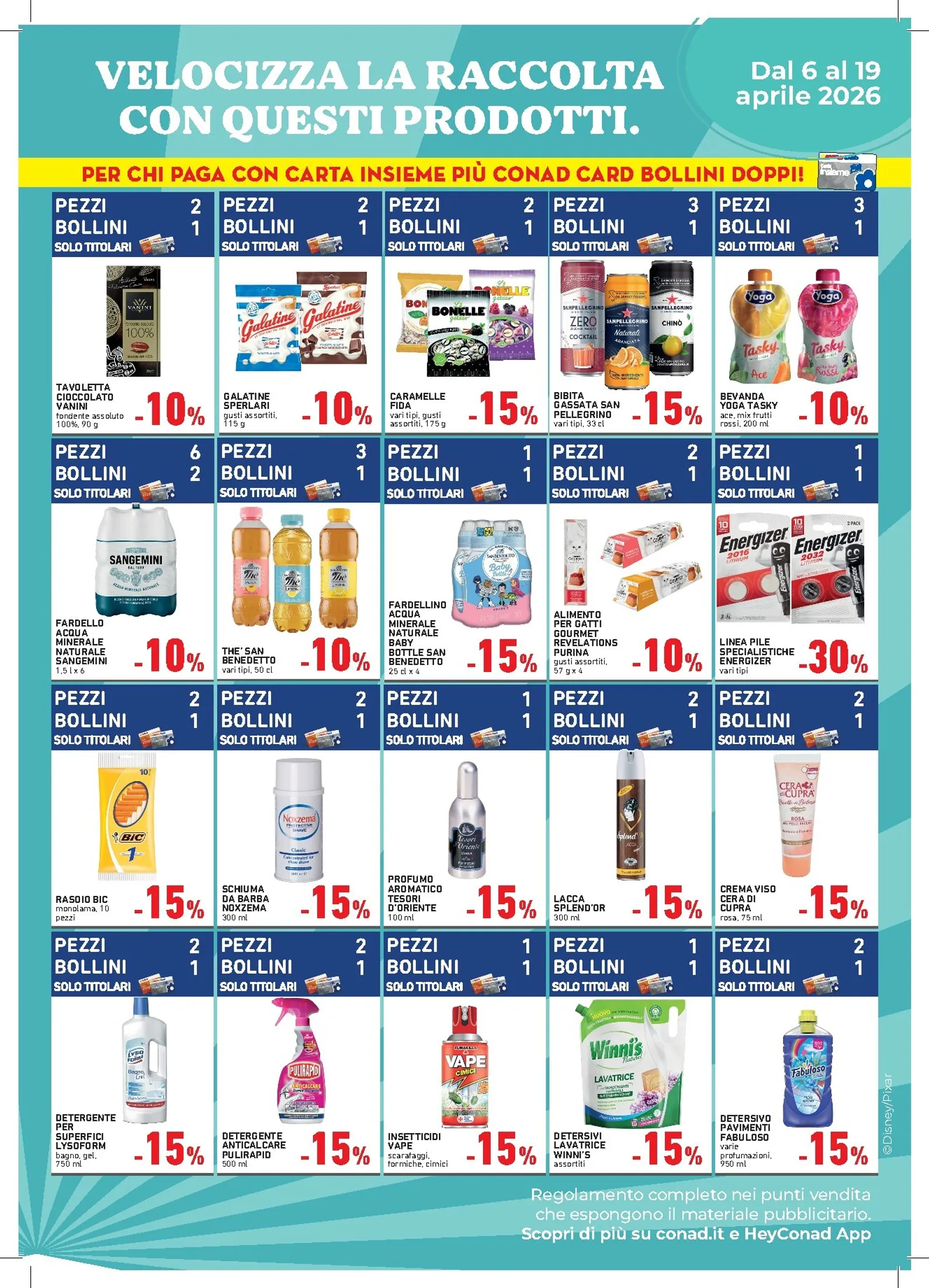 Utilizzando la Carta Insieme Più Conad Card, i vantaggi raddoppiano: buoni e bollini vengono duplicati. Questa settimana potrete approfittare di sconti su articoli come le Barrette Fitness Nestlé (-15%) e il Detersivo Fabuloso (-15%). Per scoprire tutte le offerte della settimana, consultate il nuovo Conad Volantino dal 06/04/2026 e non perdete l’occasione di risparmiare. Trovate le informazioni aggiornate visitando la pagina del Conad Volantino per pianificare al meglio la vostra spesa settimanale.