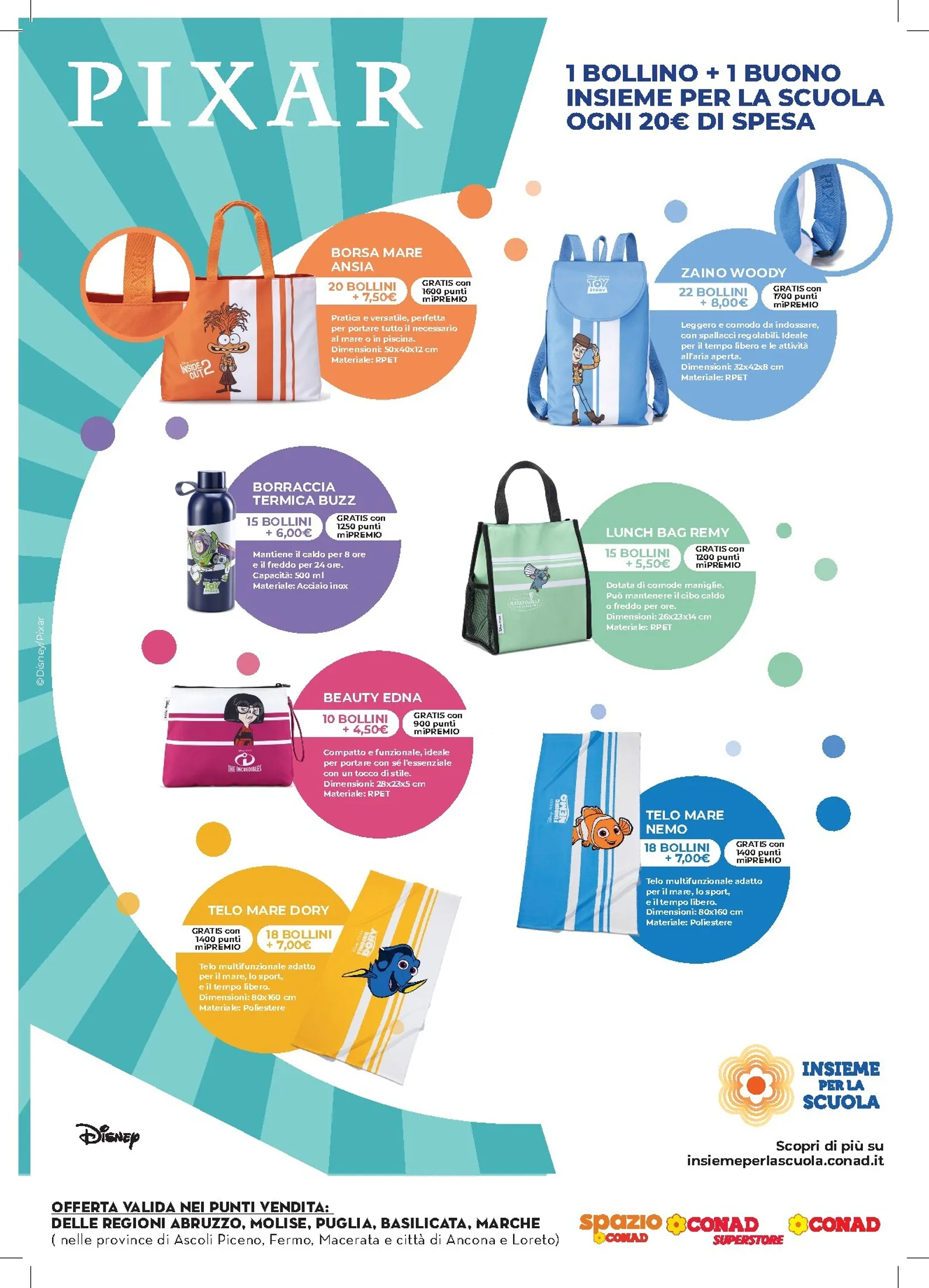 I premi di questa collezione sono ispirati ai personaggi più amati. Con 10 bollini e un contributo potrete avere il beauty case di Edna, mentre con 18 bollini sarà vostro il telo mare di Dory. Per i più avventurosi, la borraccia termica di Buzz si ottiene con 15 bollini. Non mancano la borsa mare di Darla e lo zainetto di Woody. Ogni articolo unisce stile e sostenibilità, essendo realizzato con materiali come RPET e poliestere, perfetti per l’uso quotidiano.