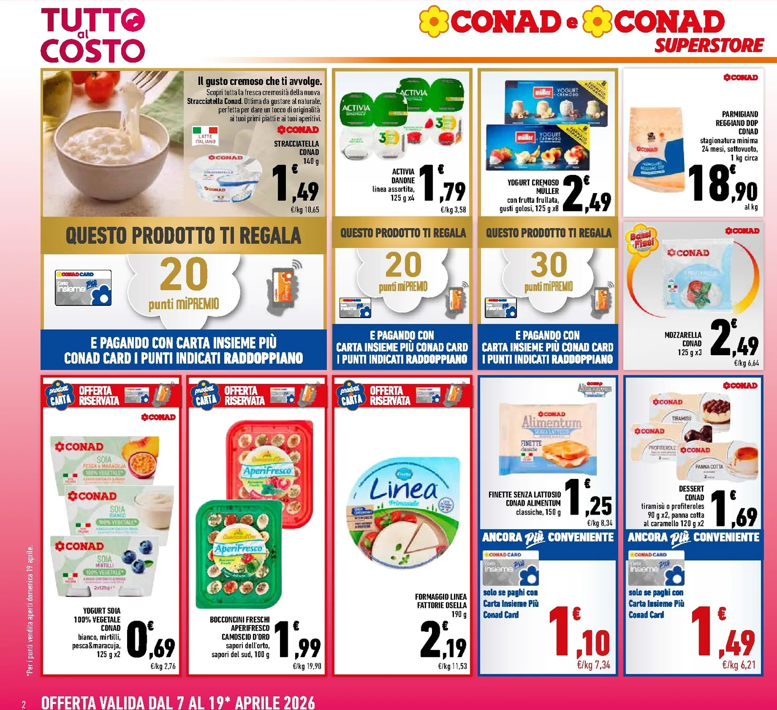 Conad lancia la sua promozione “Tutto al Costo”, valida dal 7 al 19 aprile 2026. Questo nuovo catalogo è ricco di offerte per una spesa all’insegna del risparmio. Tra le occasioni spiccano prodotti freschi come la Stracciatella Conad a 1,49 € e il Parmigiano Reggiano DOP a 18,90 € al kg. Consultare questo Conad Volantino dal 07/04/2026 è il primo passo per approfittare di prezzi competitivi e pianificare acquisti intelligenti.