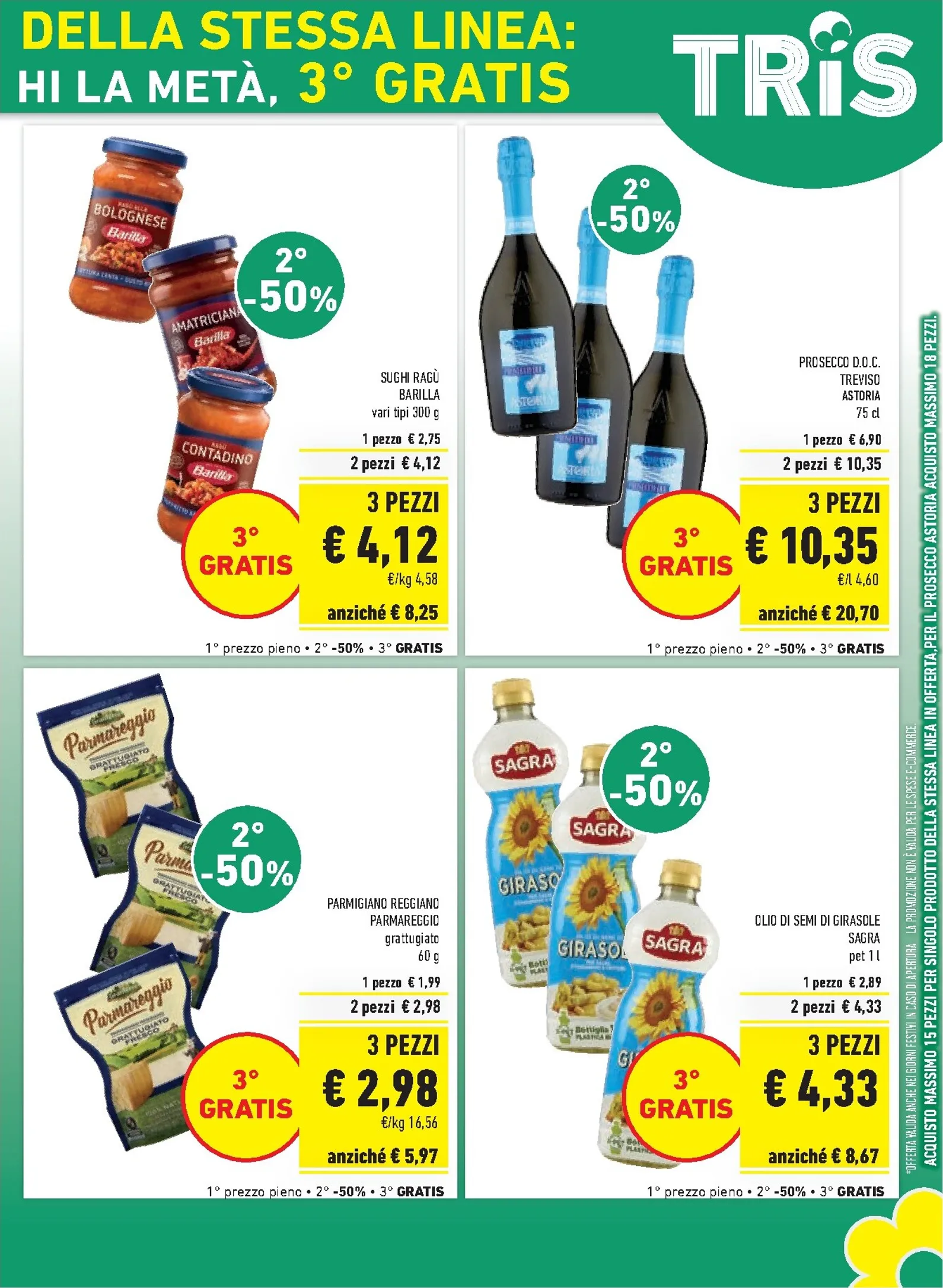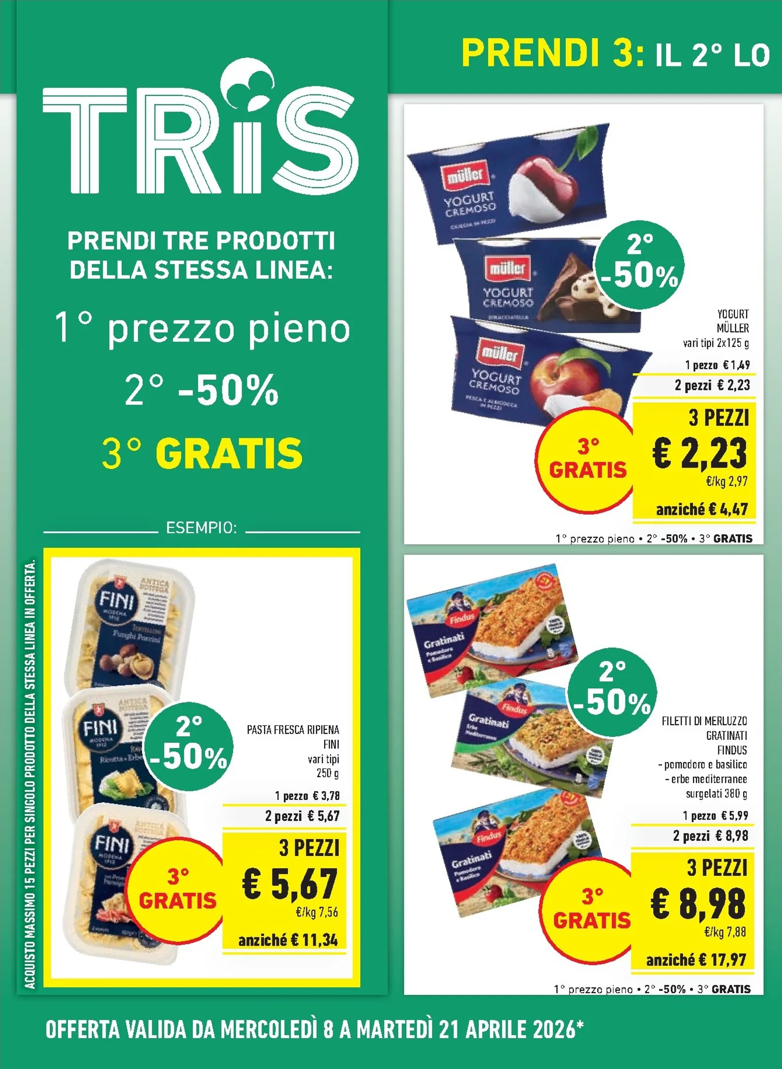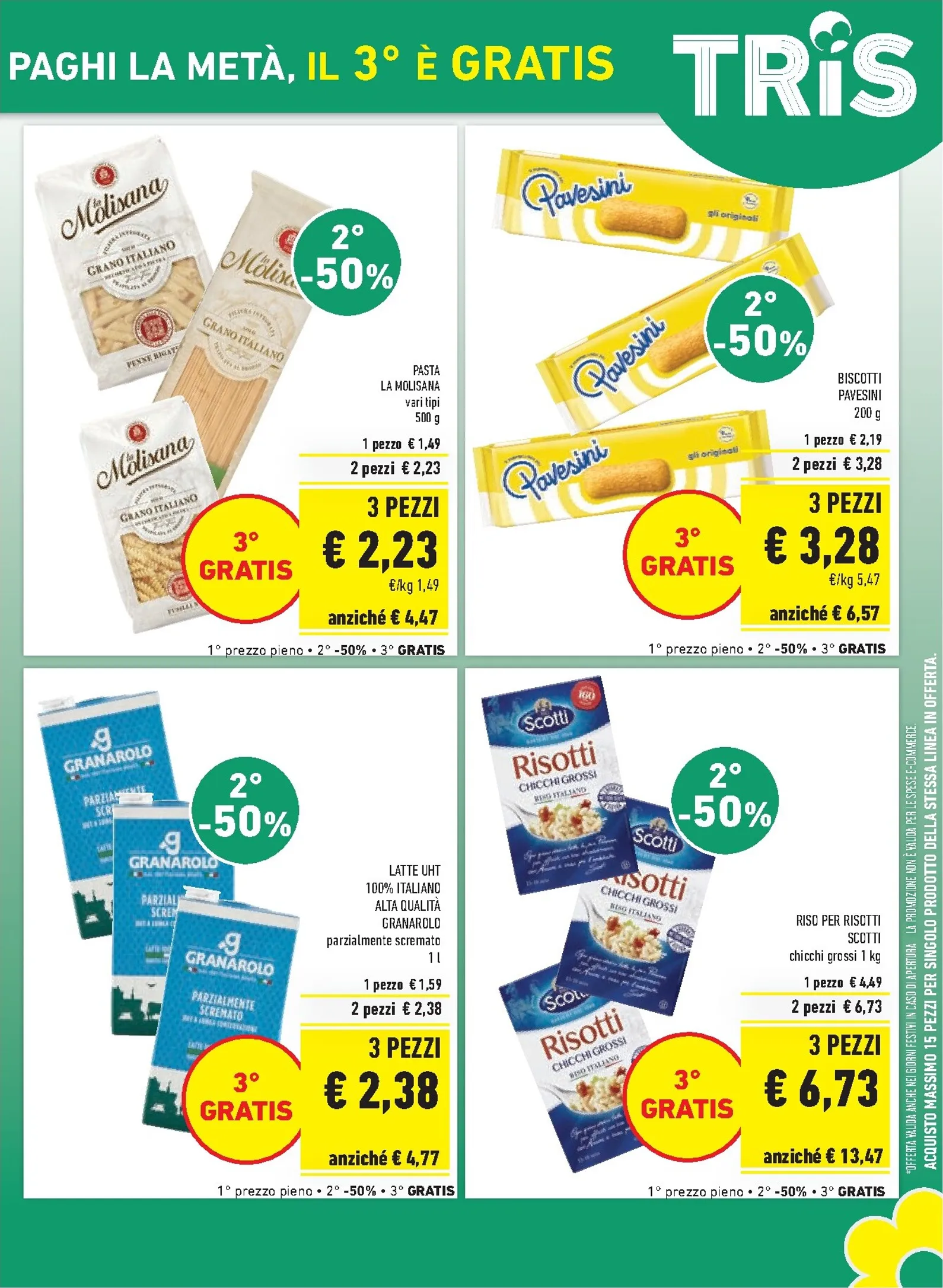 La promozione Tris include una vasta gamma di prodotti di marchi amati. Potrai scegliere tra la pasta fresca Fini, gli yogurt Müller, i filetti di merluzzo Findus e i biscotti Pavesini. L’offerta si estende anche a beni di prima necessità come la pasta La Molisana, il latte UHT Granarolo e il riso Scotti. Riempire la dispensa con articoli di qualità diventa così un’operazione estremamente vantaggiosa.