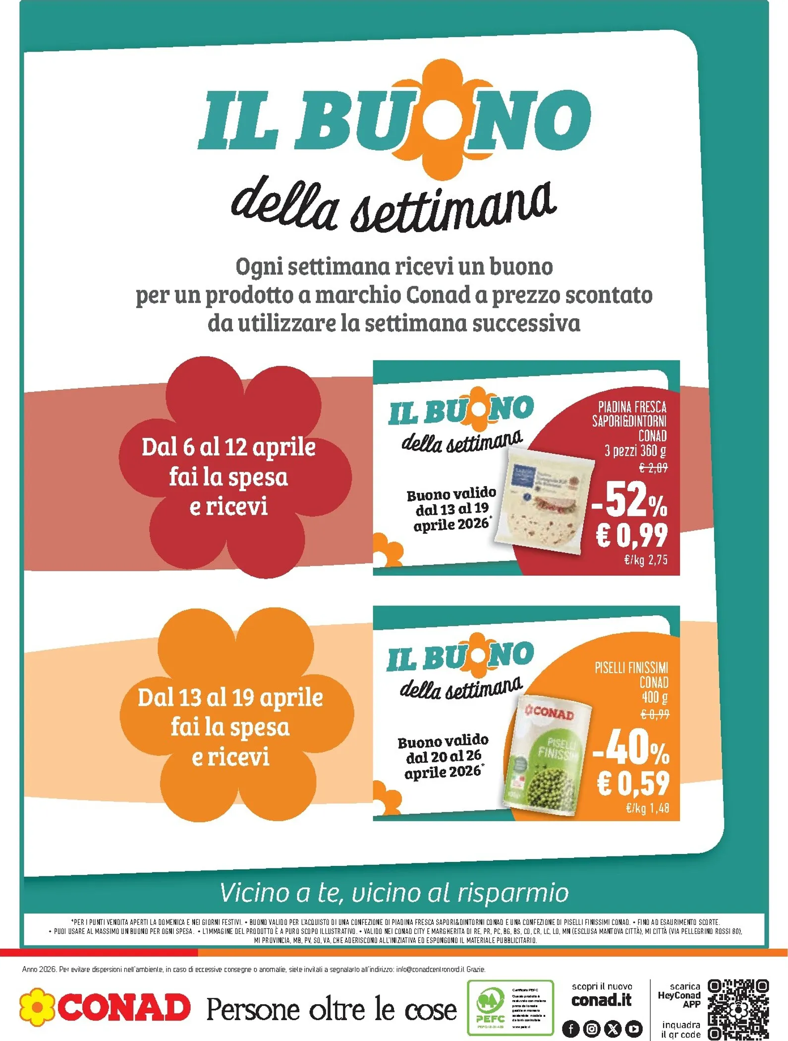 L’iniziativa continua: con la spesa dal 13 al 19 aprile, il buono sarà per i Piselli Finissimi Conad a 0,59€. Questo volantino è ricco di sconti. Per rimanere aggiornato su ogni offerta valida, visita il nostro portale e consulta l’ultimo Conad Volantino. Ricorda che il Conad Volantino dal 08/04/2026 è la tua guida per una spesa intelligente e piena di risparmio.