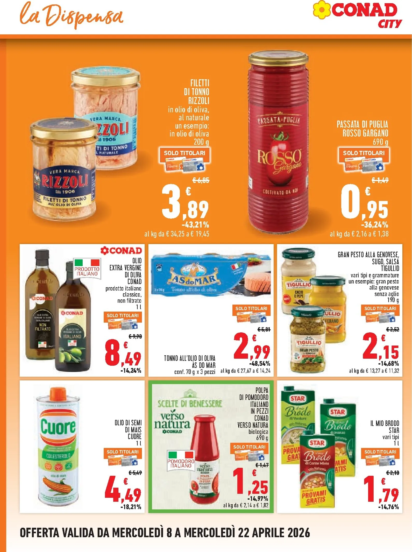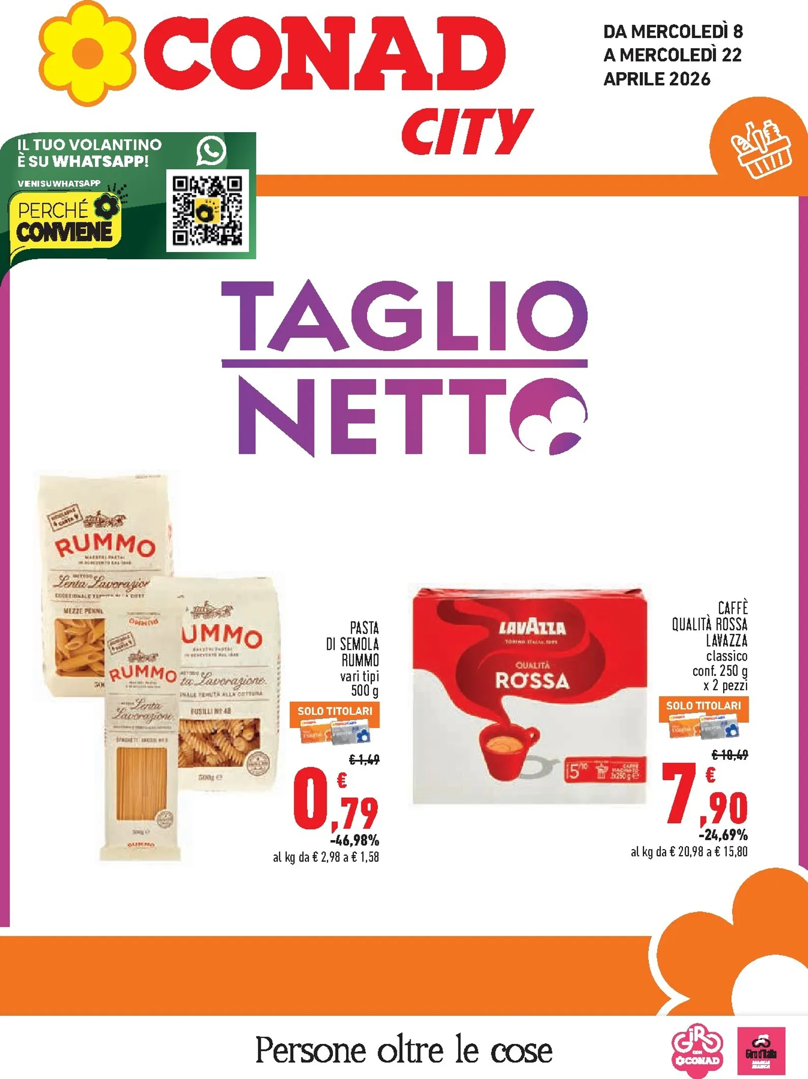 Dall’8 al 22 aprile 2026, Conad City lancia la promozione “Taglio Netto” con sconti eccezionali. In copertina troviamo la pasta Rummo a soli 0,79€ e il caffè Lavazza Qualità Rossa (2x250g) a 7,90€. Queste sono occasioni perfette per fare scorta di prodotti essenziali. Sfruttare Conad Volantino dal 08/04/2026 è il modo migliore per unire risparmio e qualità, garantendosi articoli di marca a prezzi ridotti, tra le ultime proposte del mese.