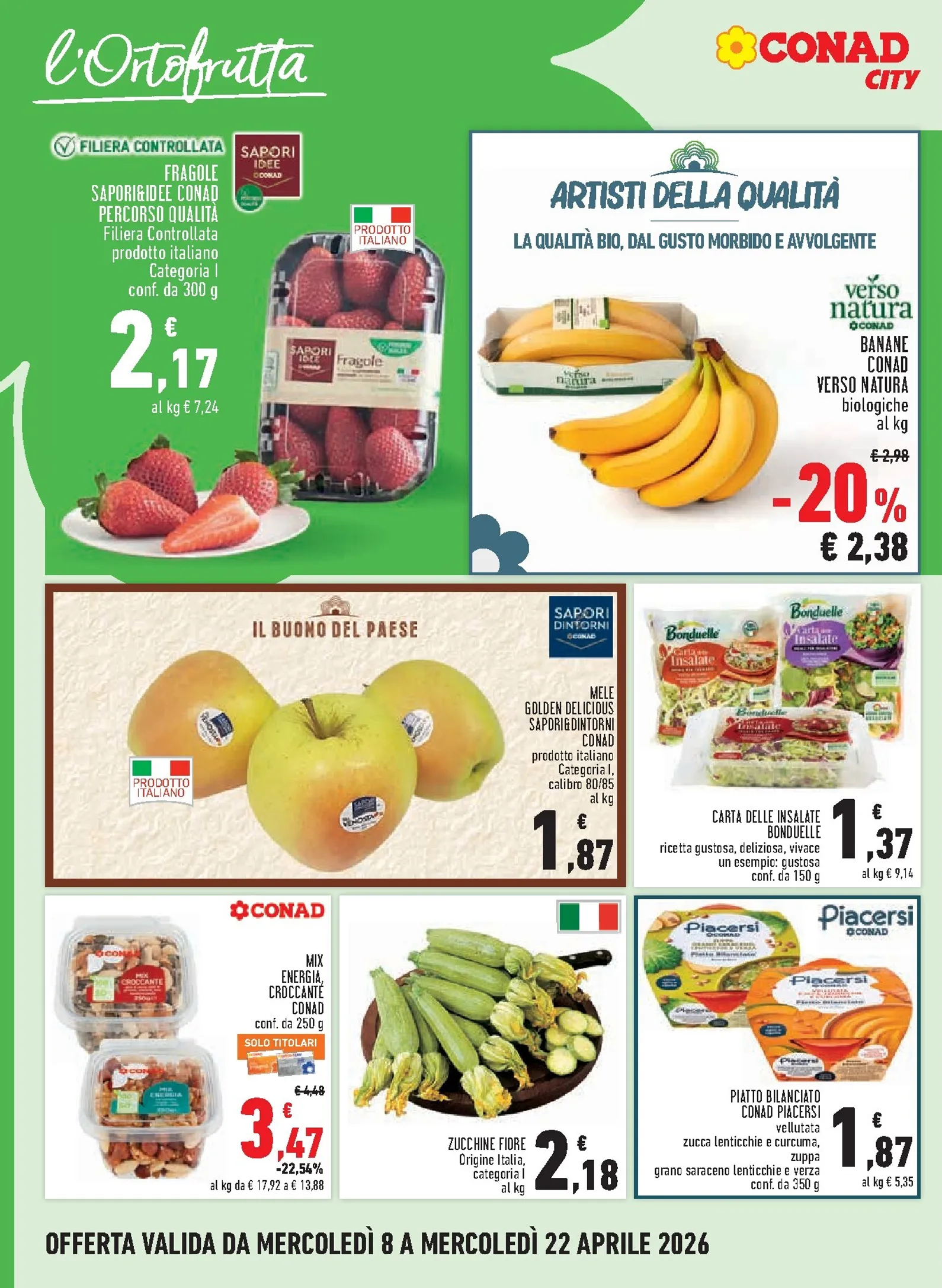 Questo volantino è ricco di opportunità per una spesa completa. Non mancano soluzioni per un pasto sano come i piatti bilanciati Piacersi a 1,87€. Per non perdere nessuna promozione e scoprire tutte le Conad Volantino dal 08/04/2026 disponibili, consultate il Conad Volantino ufficiale. Affrettatevi a scoprire tutte le ultime offerte pensate per voi, valide fino al 22 aprile, per una spesa che unisce qualità e un grande risparmio.