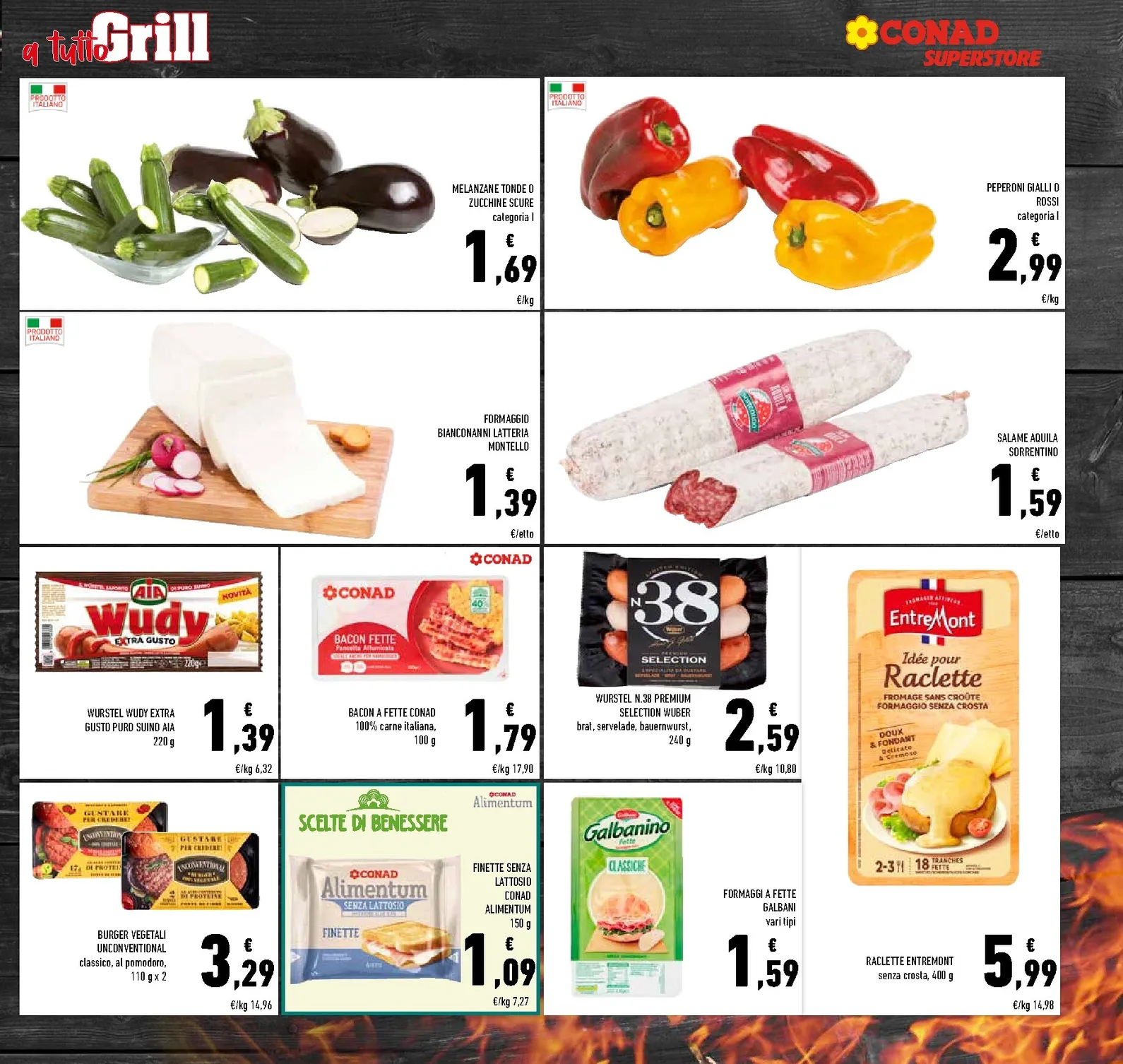 Un barbecue che si rispetti inizia con degli ottimi antipasti. Tra le ultime novità in volantino, troviamo i würstel Wudy Extra Gusto a 1,39 € e il bacon a fette Conad a 1,79 €, ideali da cuocere sulla griglia per un aperitivo sfizioso. Per gli amanti dei formaggi, le opzioni sono tantissime: dal classico Galbanino a 1,59 € al formaggio Biancovanni Latteria Montello a 1,39 €. Una menzione speciale va alla Raclette Entremont a 5,99 €, perfetta per creare un momento conviviale e originale. Non può mancare un buon salame, come l’Aquila Sorrentino a 1,59 € all’etto, per arricchire il vostro tagliere e deliziare gli ospiti prima della portata principale.