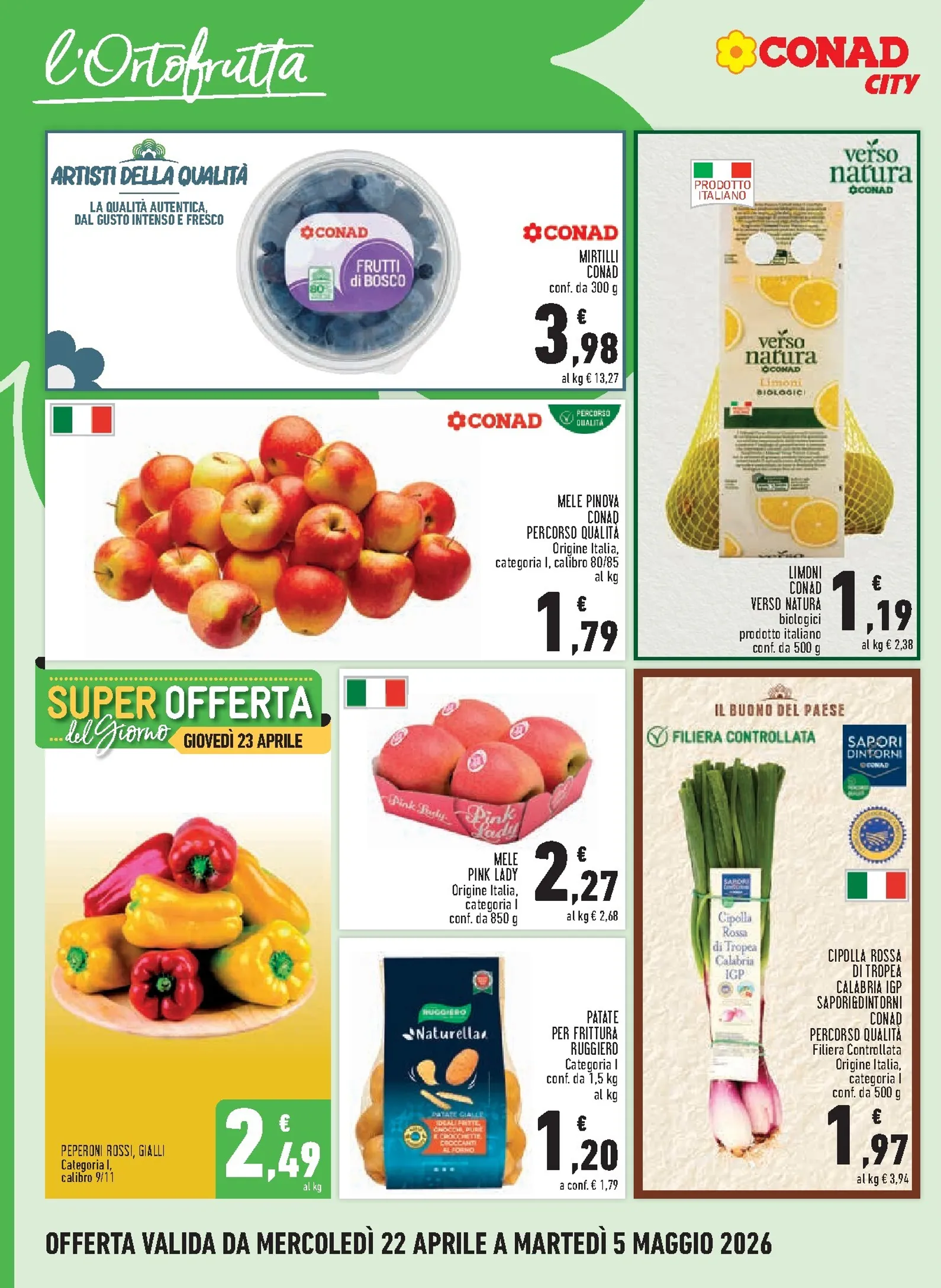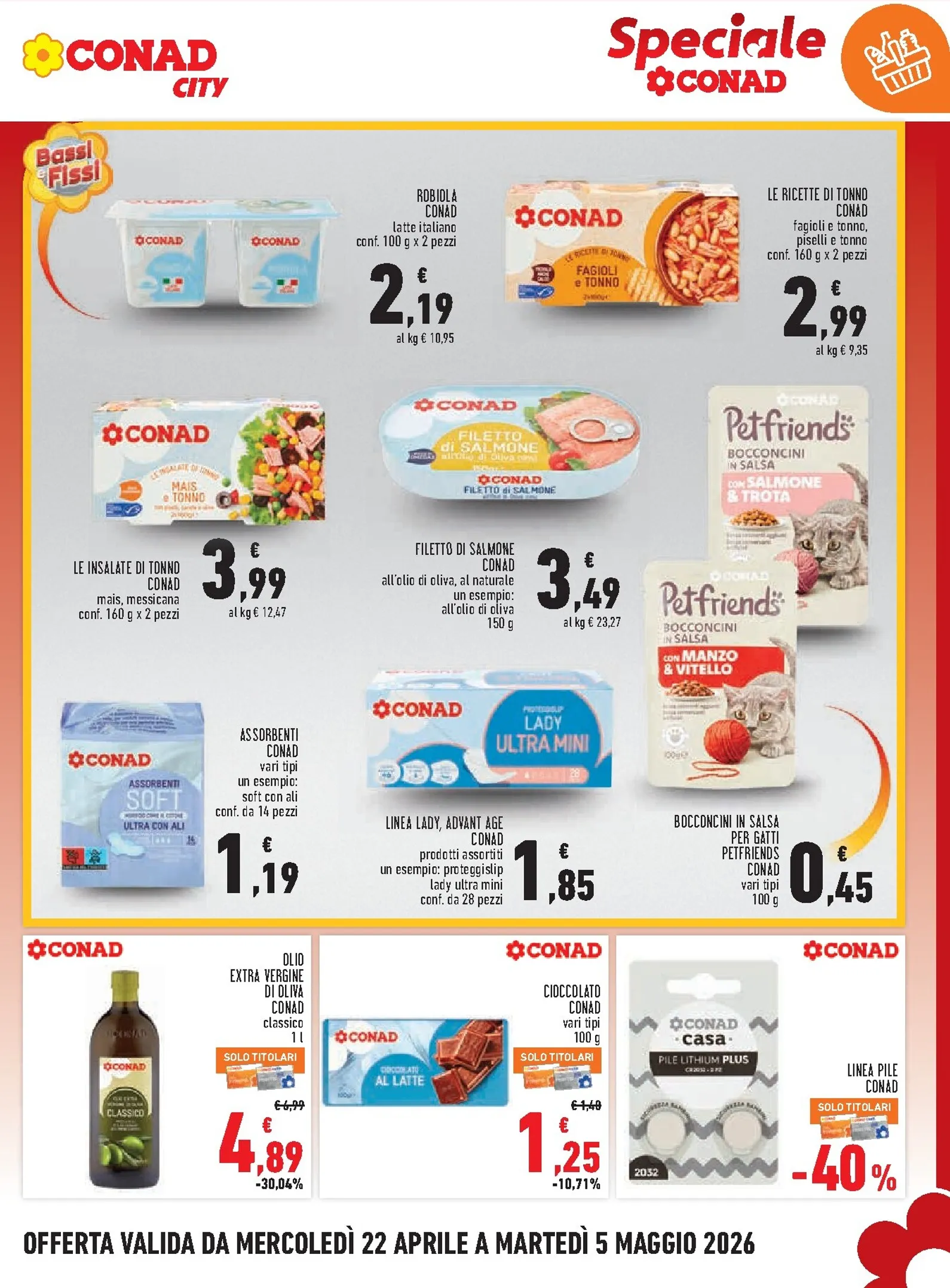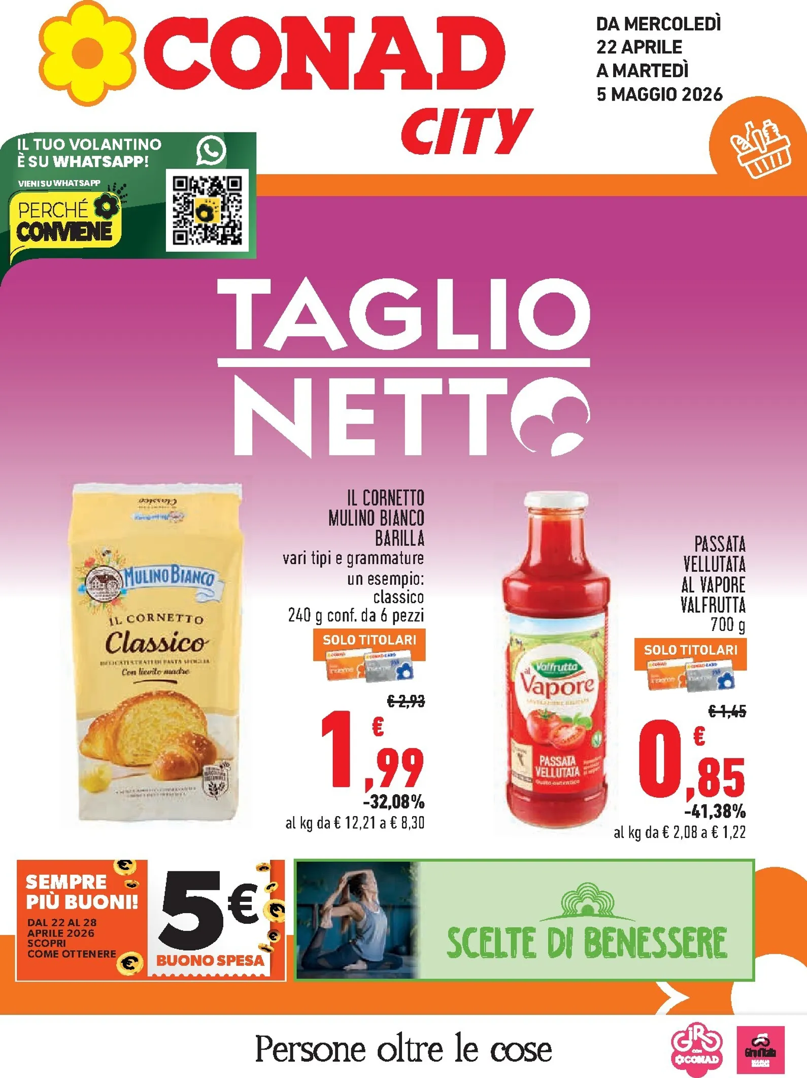 Il nuovo volantino Conad City, valido dal 22 aprile al 5 maggio 2026, lancia la promozione “Taglio Netto” con sconti imperdibili. Tra le offerte di punta troviamo il Cornetto Mulino Bianco a 1,99€ e la Passata Valfrutta a 0,85€, con ribassi fino al 41%. Sono occasioni perfette per una spesa di qualità. Per orientarvi tra le migliori catalogo valido, il nostro Conad Volantino dal 22/04/2026 è lo strumento ideale per voi.