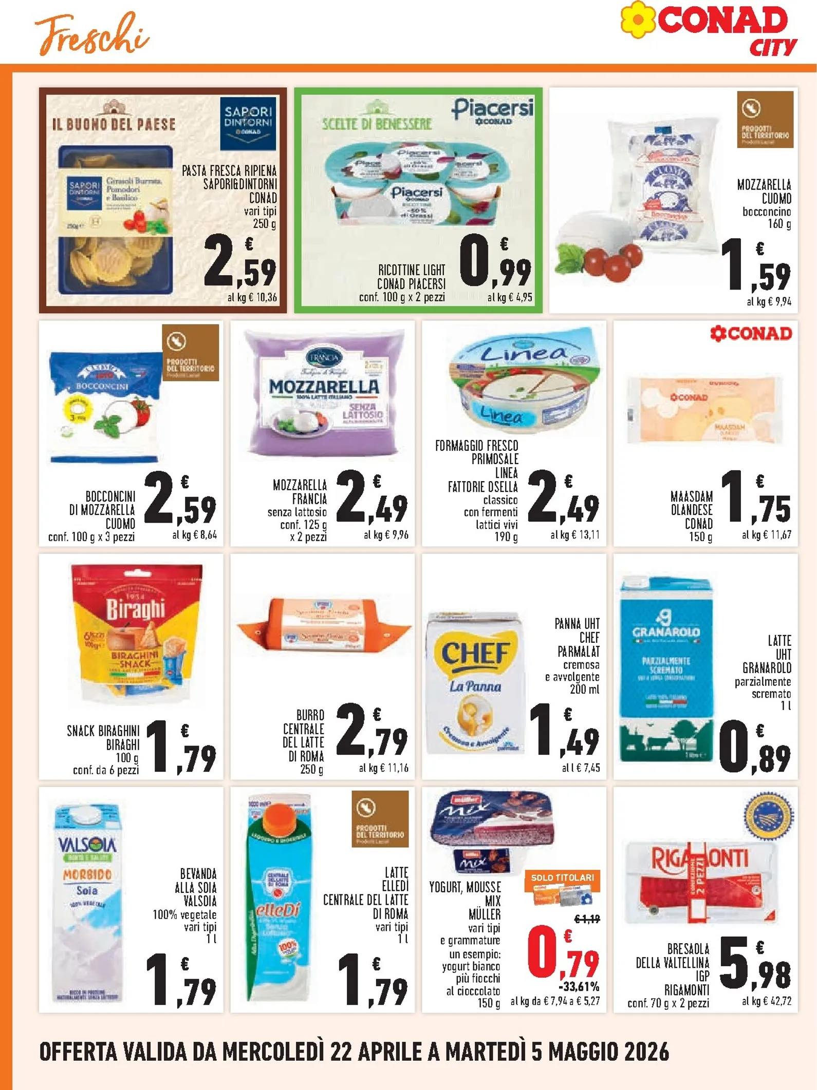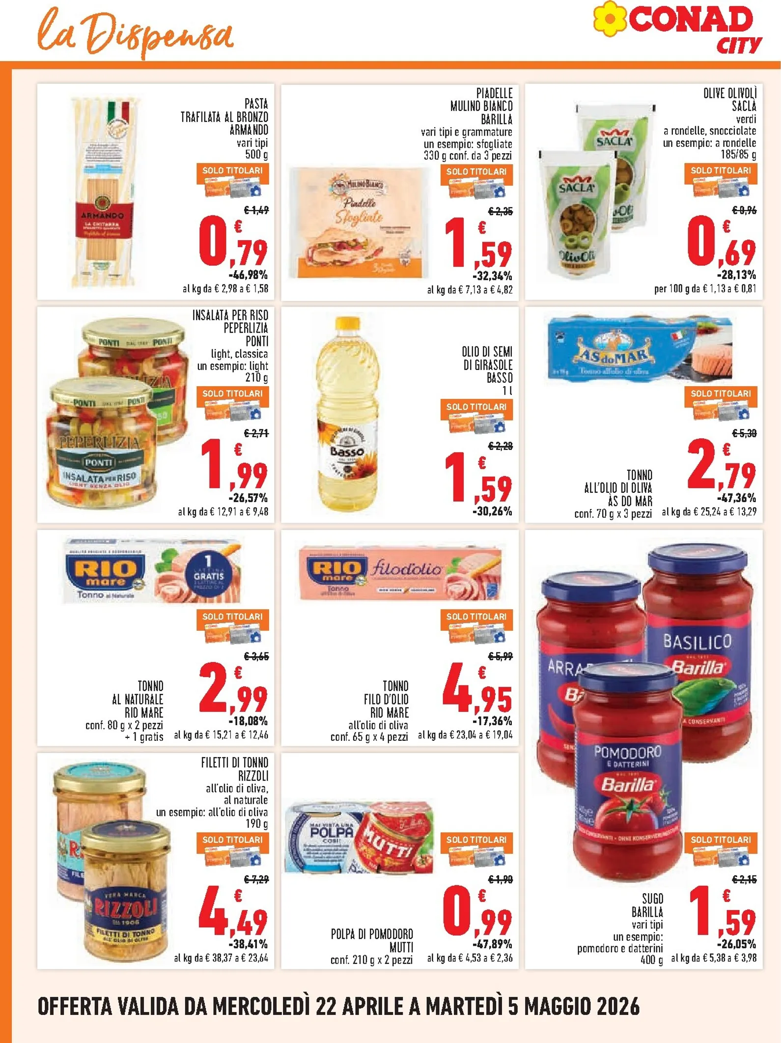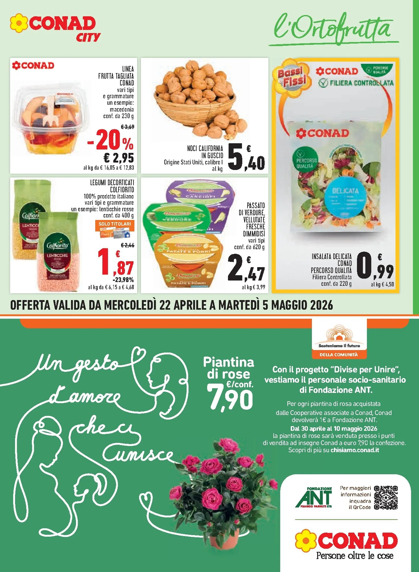 Il nuovo volantino Conad City, valido dal 22 aprile al 5 maggio 2026, lancia la promozione “Taglio Netto” con sconti imperdibili. Tra le offerte di punta troviamo il Cornetto Mulino Bianco a 1,99€ e la Passata Valfrutta a 0,85€, con ribassi fino al 41%. Sono occasioni perfette per una spesa di qualità. Per orientarvi tra le migliori catalogo valido, il nostro Conad Volantino dal 22/04/2026 è lo strumento ideale per voi.