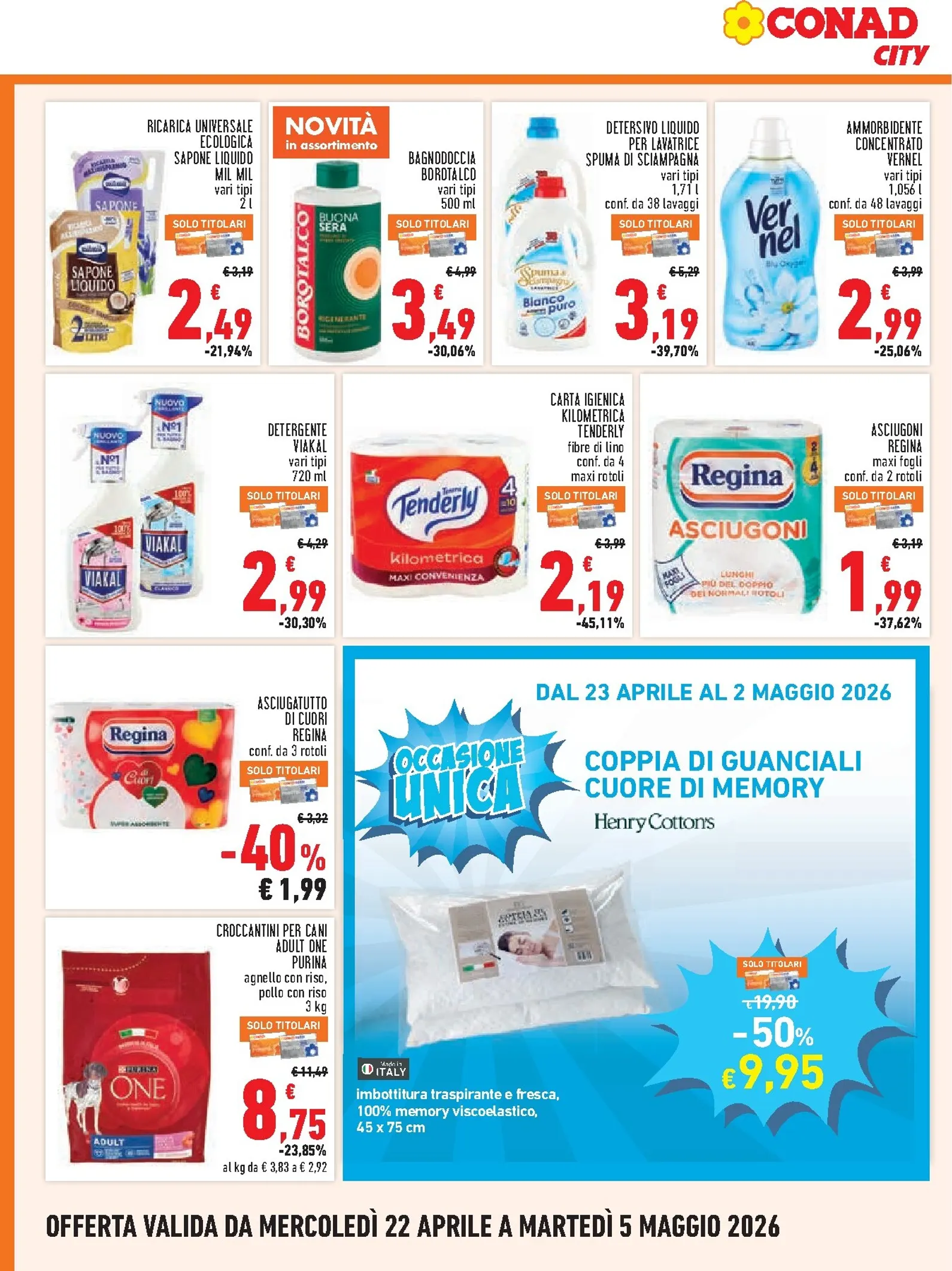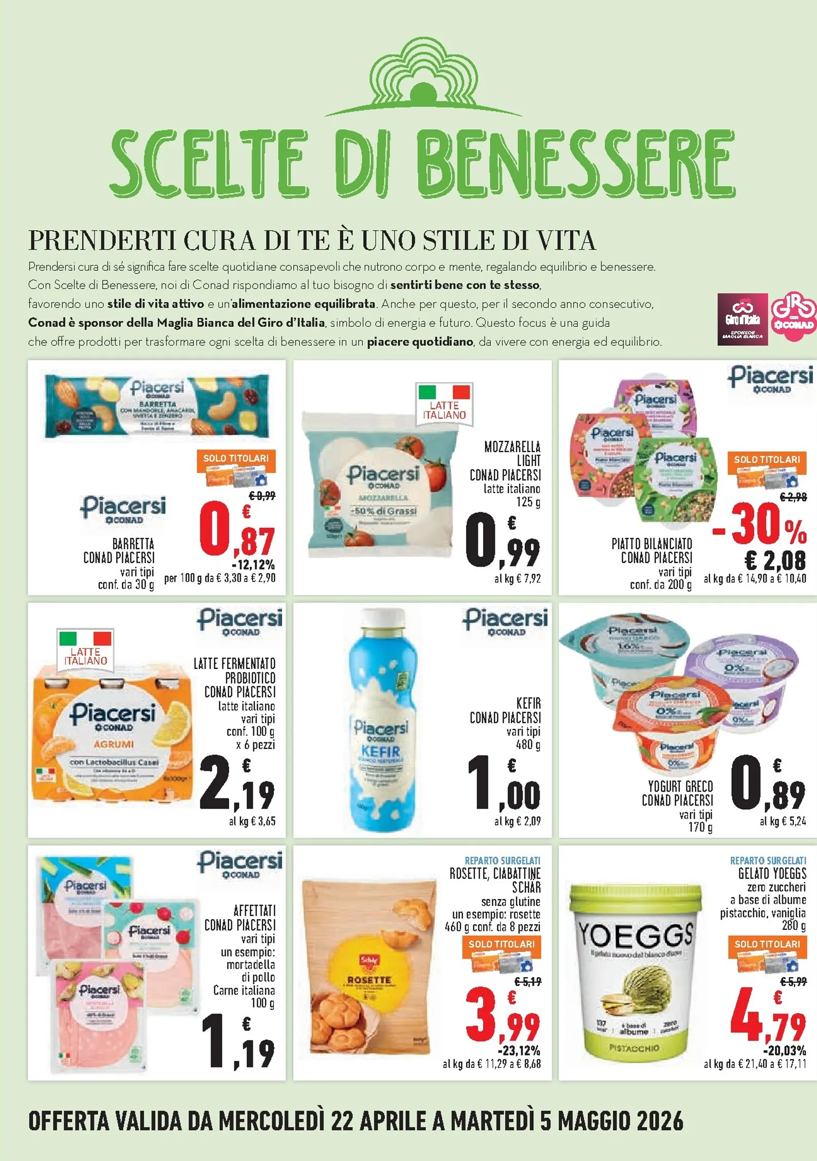 Le opportunità continuano con l’Olio Extra Vergine di Oliva Classico Conad, scontato del 30%, e il Cioccolato al Latte a 1,25€. Questo volantino è valido e ricco di proposte per ogni necessità, confermando l’attenzione del marchio verso i clienti. Consultate sempre il Conad Volantino dal 22/04/2026 per non perdere nessuna occasione. Per una visione completa, visitate la nostra sezione dedicata al Conad Volantino.