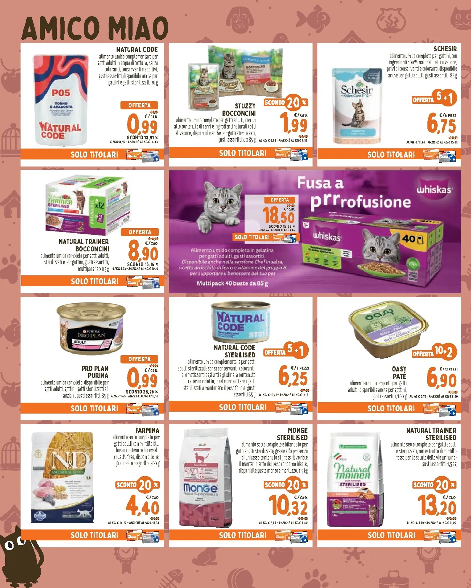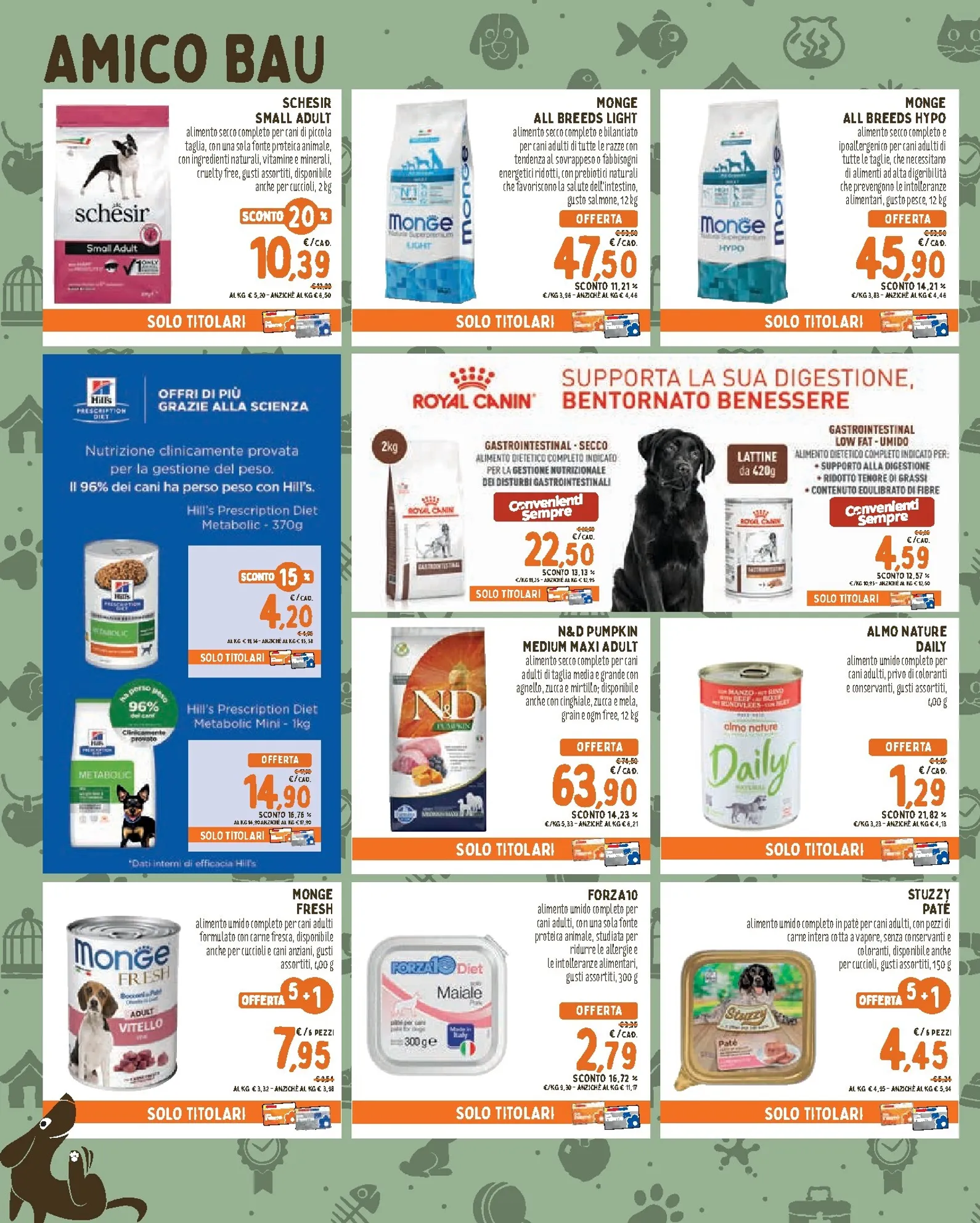 L’alimentazione è protagonista con sconti su marchi di qualità. Per i gatti, il multipack Gourmet Gold da 24 lattine è scontato del 20%, offrendo una varietà di sapori irresistibili. Per i cani, le scelte spaziano da Schesir Small Adult a 10,39€ fino alle formule specializzate di Monge, come All Breeds Light a 47,50€. Presente anche Monge Fresh, l’alimento umido completo a 7,95€ per un pasto gustoso.