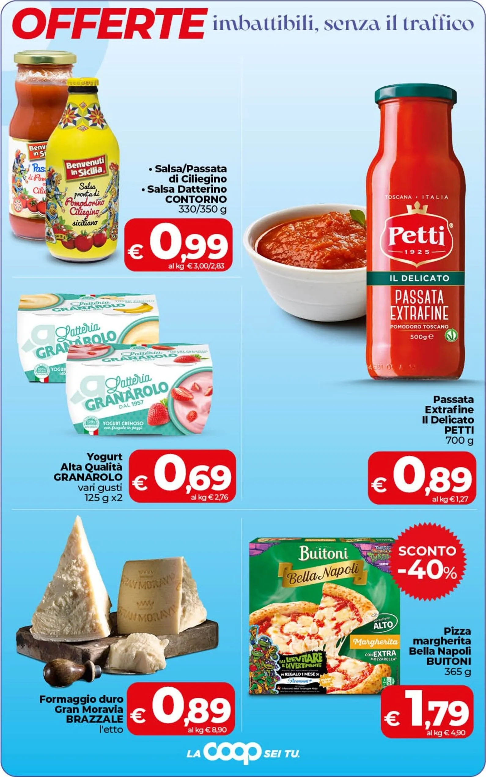 Le anteprima catalogo proseguono con freschezza e praticità. In questa anteprima di sconti troviamo lo yogurt Granarolo a 0,69 euro e il formaggio Gran Moravia a 0,89 euro l’etto. Per i condimenti, la passata Petti è a 0,89 euro. Per una cena veloce, la pizza Margherita Buitoni è scontata del 40% a soli 1,79 euro, un’opportunità imperdibile per portare la tradizione in tavola.