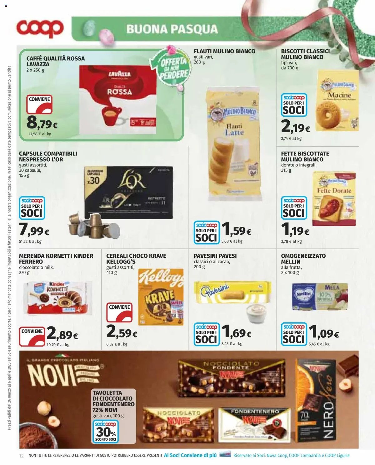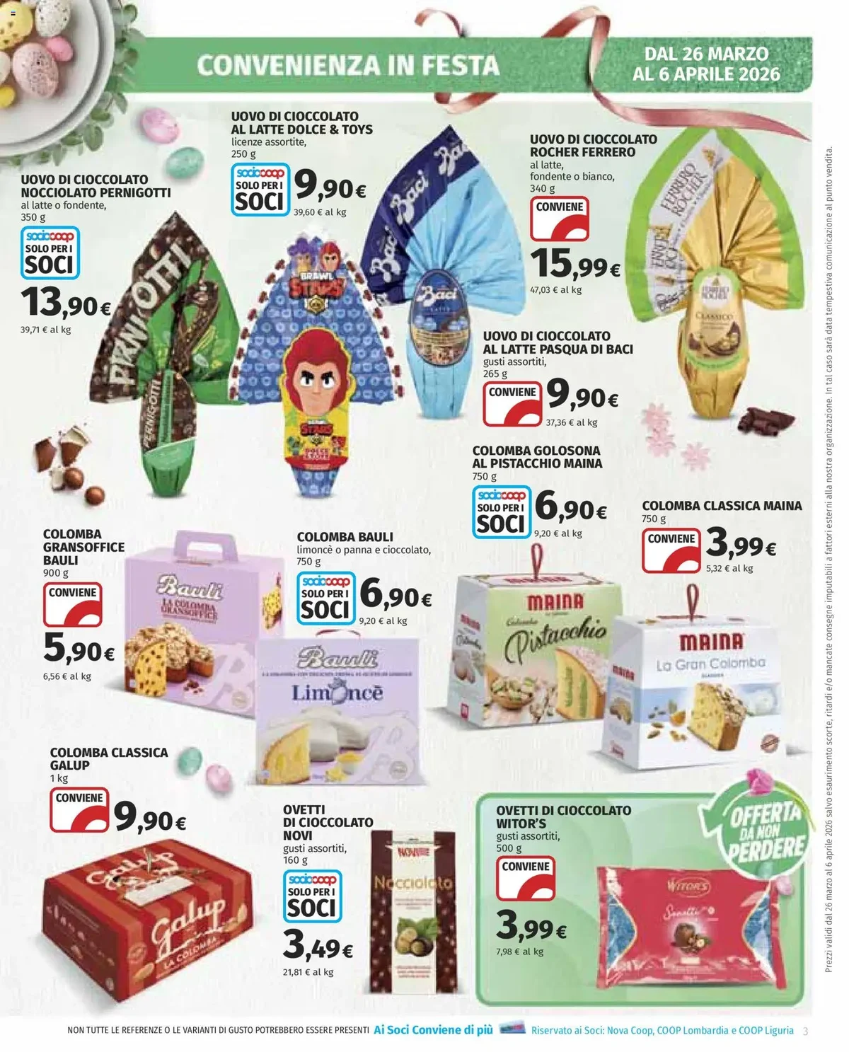 Il nuovo Volantino Coop dal 26.03.2026 è finalmente disponibile, portando con sé imperdibili Offerte Speciali dal Giovedì che anticipano le festività pasquali con una ricca selezione di prodotti. Questa edizione si concentra in particolare sulle delizie per la Pasqua, offrendo un'ampia gamma di uova di cioccolato e colombe. Tra le prime proposte spicca lo SPUMANTE PROSECCO VALDOBBIADENE SUPERIORE D.O.C.G. MARCA ORO VALDO da 750 ml a soli 4,99€, perfetto per brindare. Non mancano le golosità per i più piccoli e per gli amanti del cioccolato, con l'UOVO DI CIOCCOLATO NOVI in diverse varianti a 8,49€ e l'UOVO DI CIOCCOLATO KUCCIOLOTTI BAULI a 8,90€.