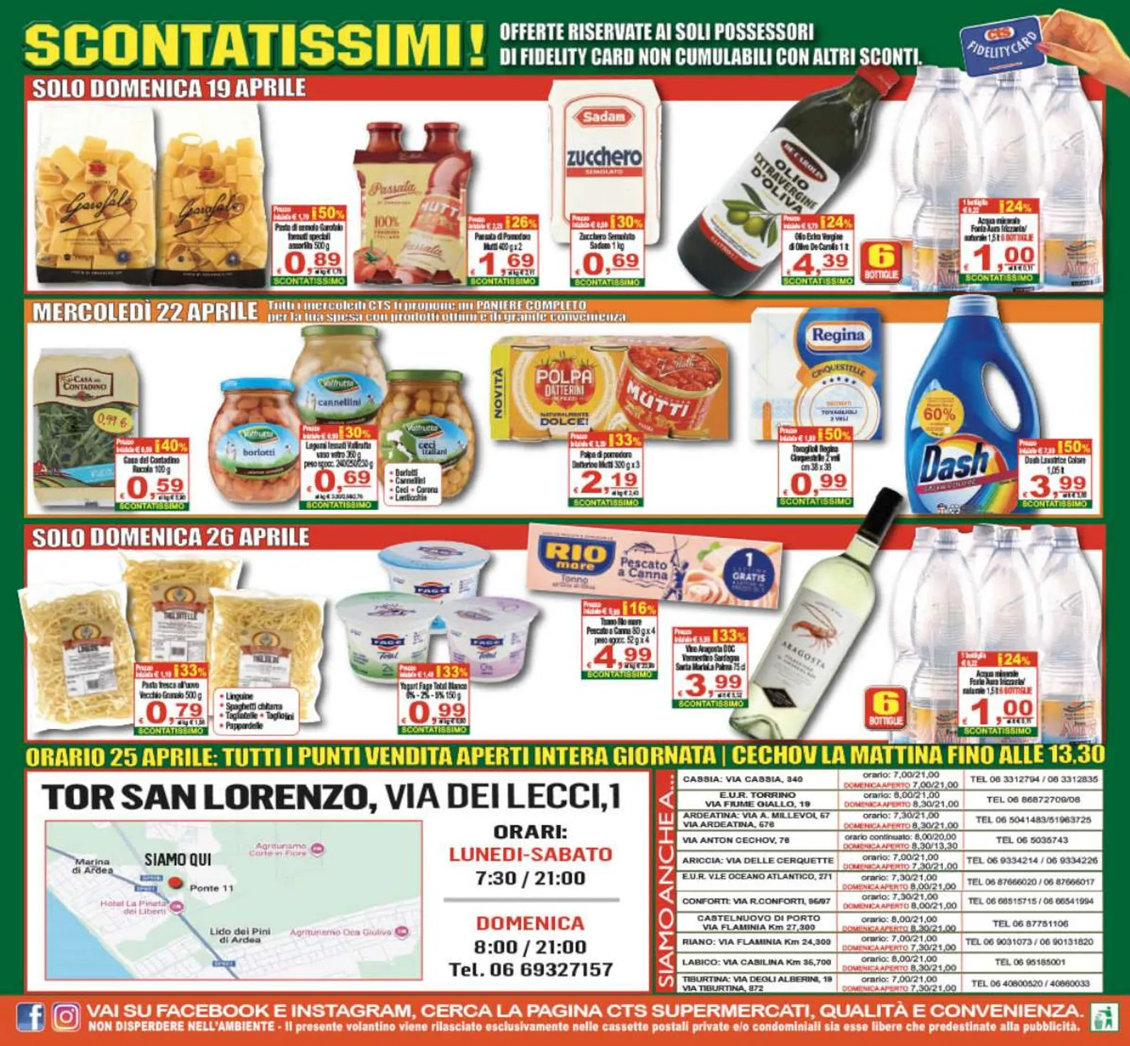 Il nuovo volantino Cts, valido dal 17 al 27 aprile, porta la convenienza a Tor San Lorenzo. La freschezza è protagonista con le orate a 8,99 € al kg e il prosciutto cotto Martelli a 0,99 € l’etto. Per essere sempre aggiornati su ogni promozione, Cts Volantino dal 17/04/2026 è la risorsa ideale. Segnate in agenda martedì 28 aprile: i possessori di Fidelity Card avranno uno sconto del 20% su tutta la spesa.