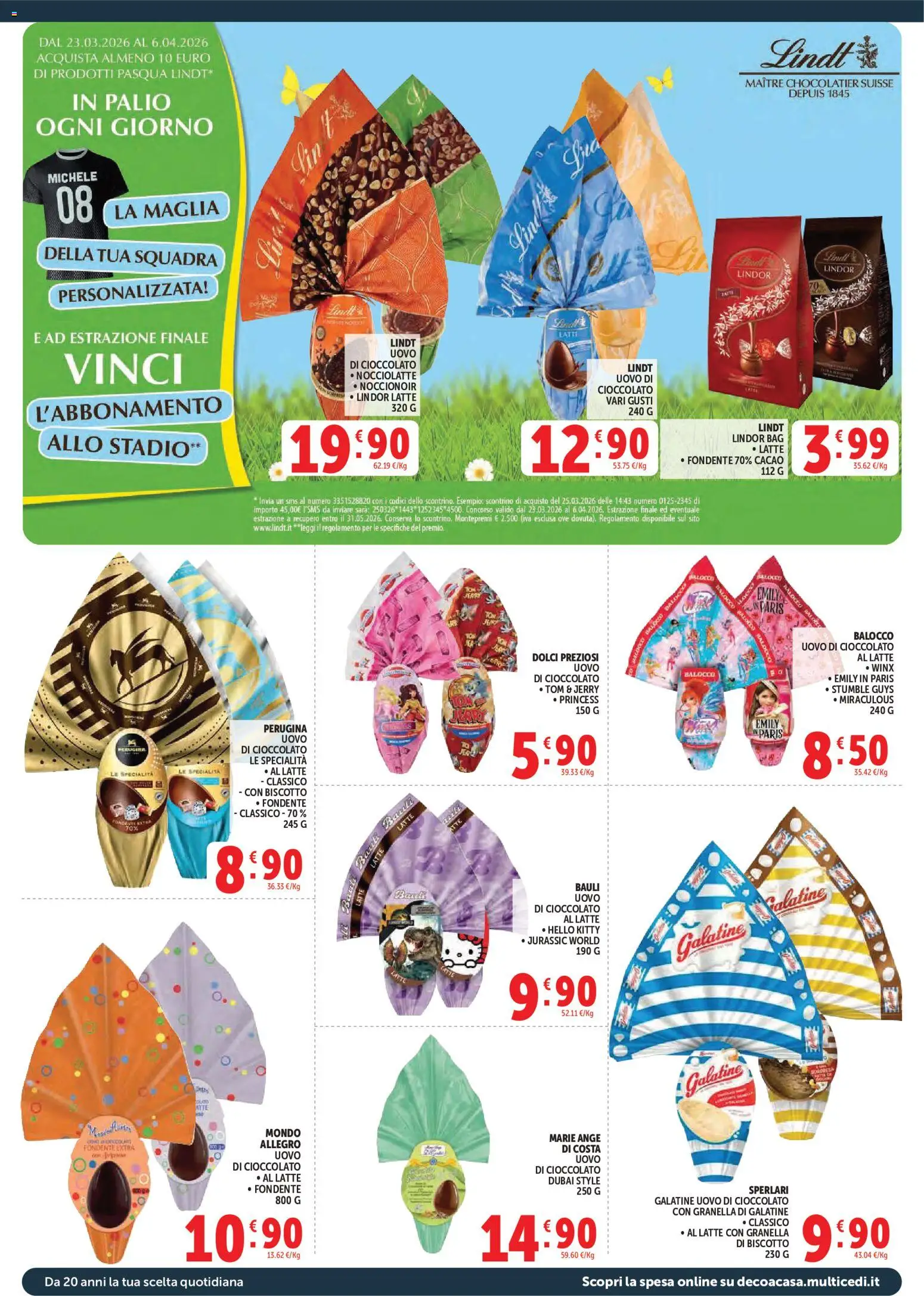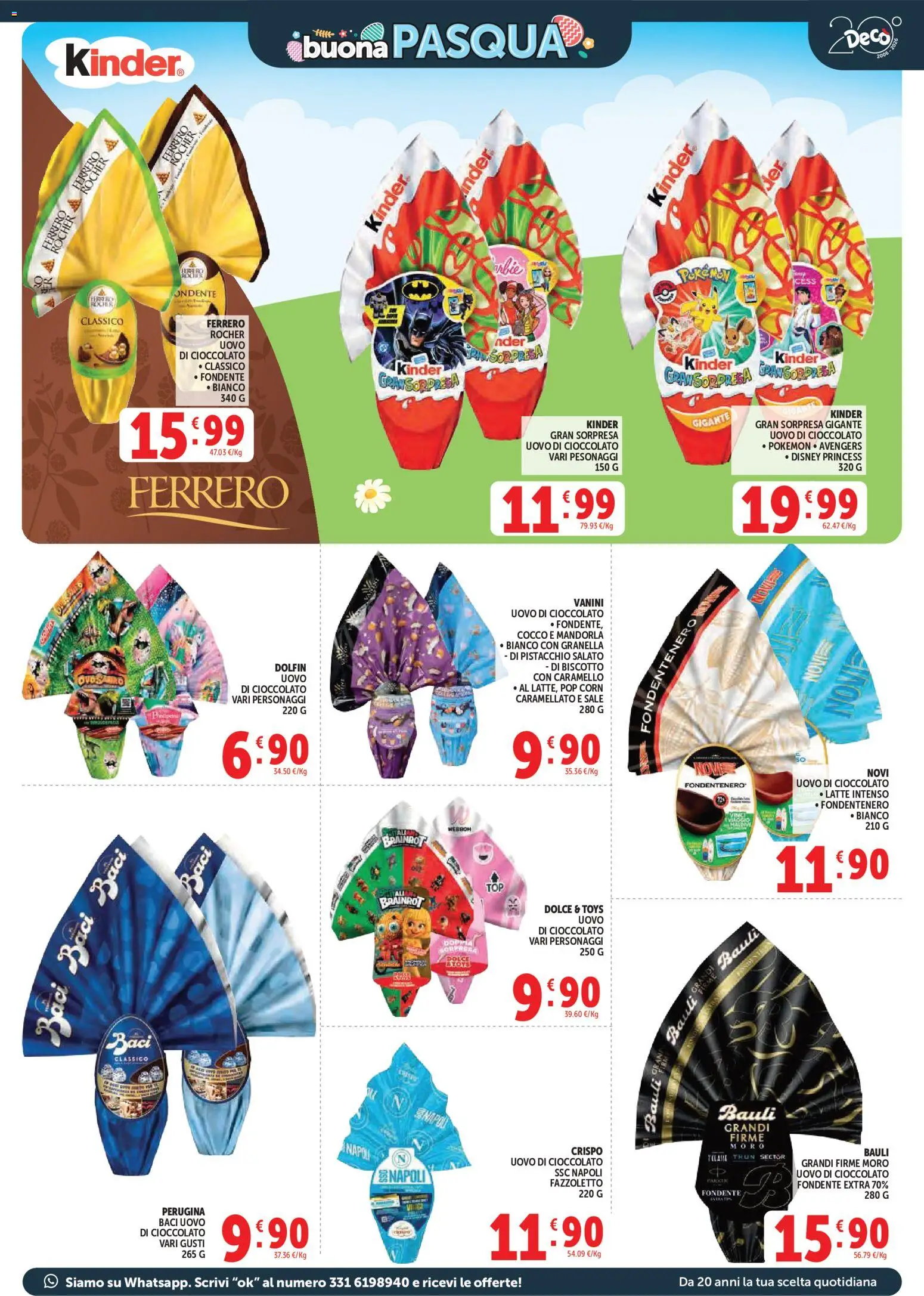 La Pasqua si avvicina e Decò ha preparato una selezione di uova di cioccolato per accontentare tutti, grandi e piccini. All’interno del volantino Deco 27 marzo al 6 aprile 2026 troviamo le proposte più amate, come l’Uovo Ferrero Rocher a 15,99€ e le golose creazioni Lindt, con l’uovo Noccior da 320g a 19,90€. Per i bambini, la scelta è vastissima con il Kinder Gran Sorpresa Gigante a 19,99€, con le sorprese di Pokémon, Avengers e delle Principesse Disney.
