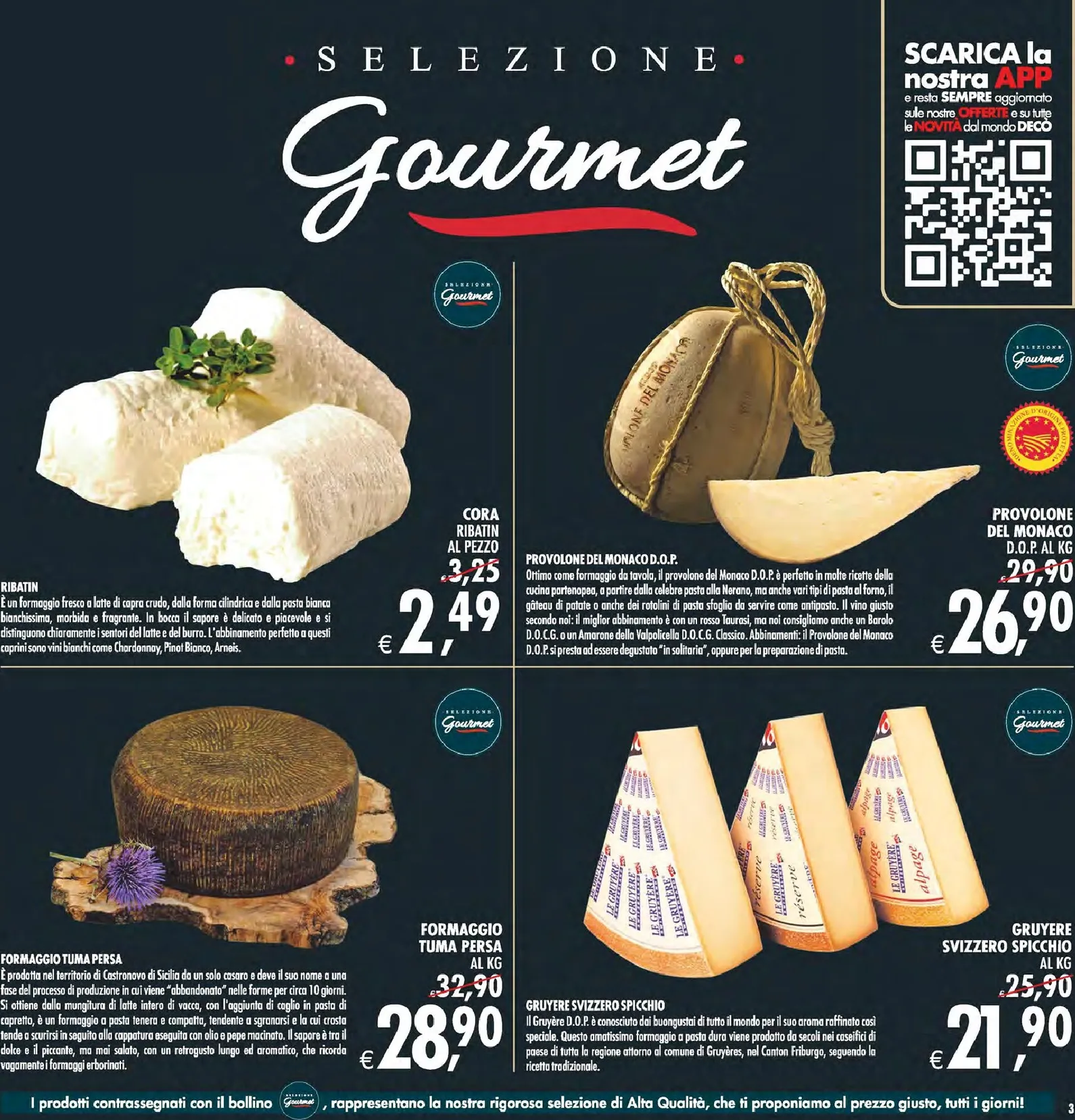 Anche il banco dei formaggi riserva sorprese eccezionali, come evidenziato in questo ricco catalogo. Il Provolone del Monaco D.O.P., stagionato e dal gusto inconfondibile, è disponibile a 26,90 € al kg. Per gli intenditori, il raro formaggio siciliano Tuma Persa è in promozione a 28,90 € al kg, un prodotto dal sapore antico e unico. Non manca un classico internazionale come il Gruyère Svizzero, offerto a 21,90 € al kg, perfetto per arricchire ogni piatto.