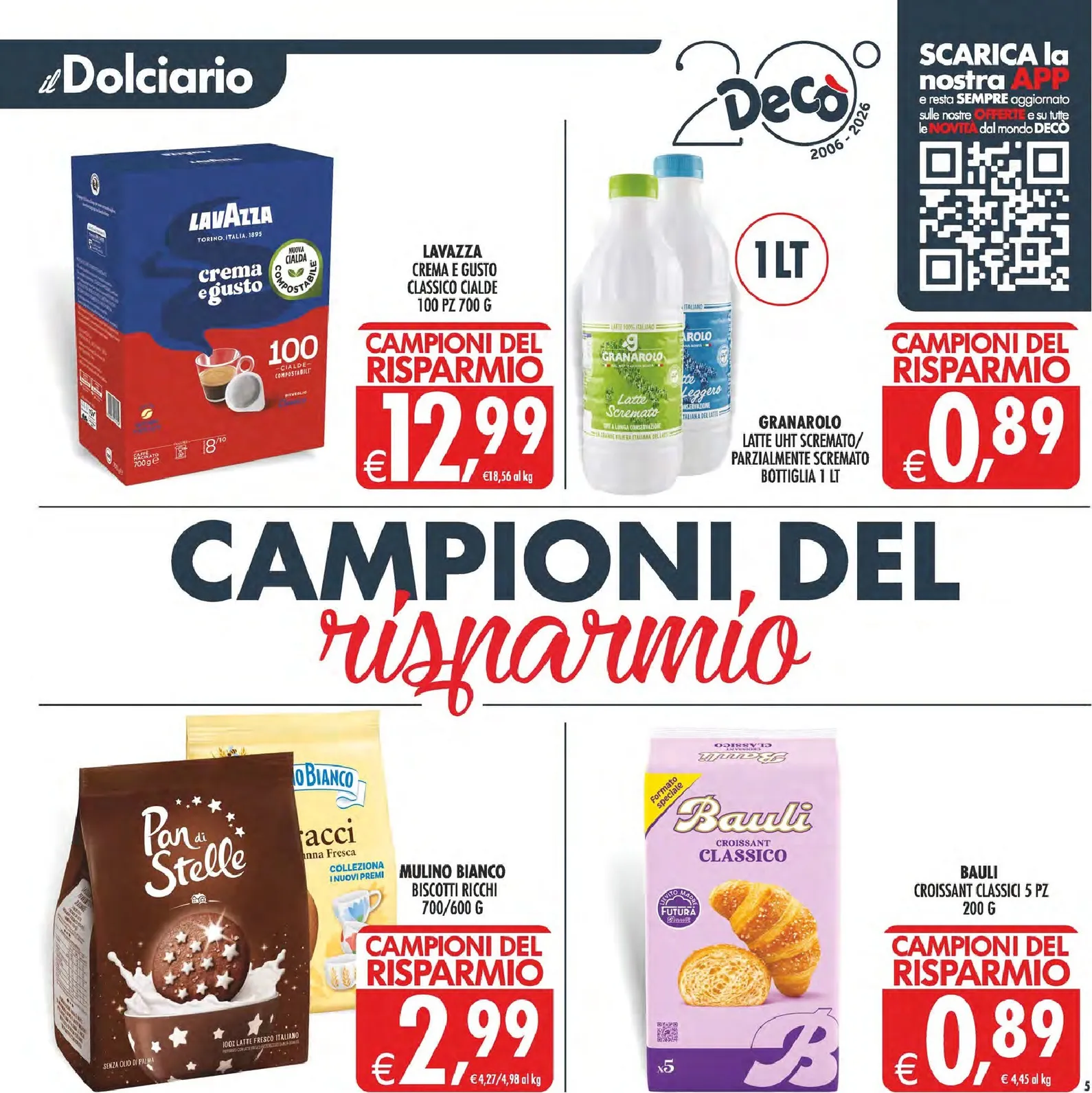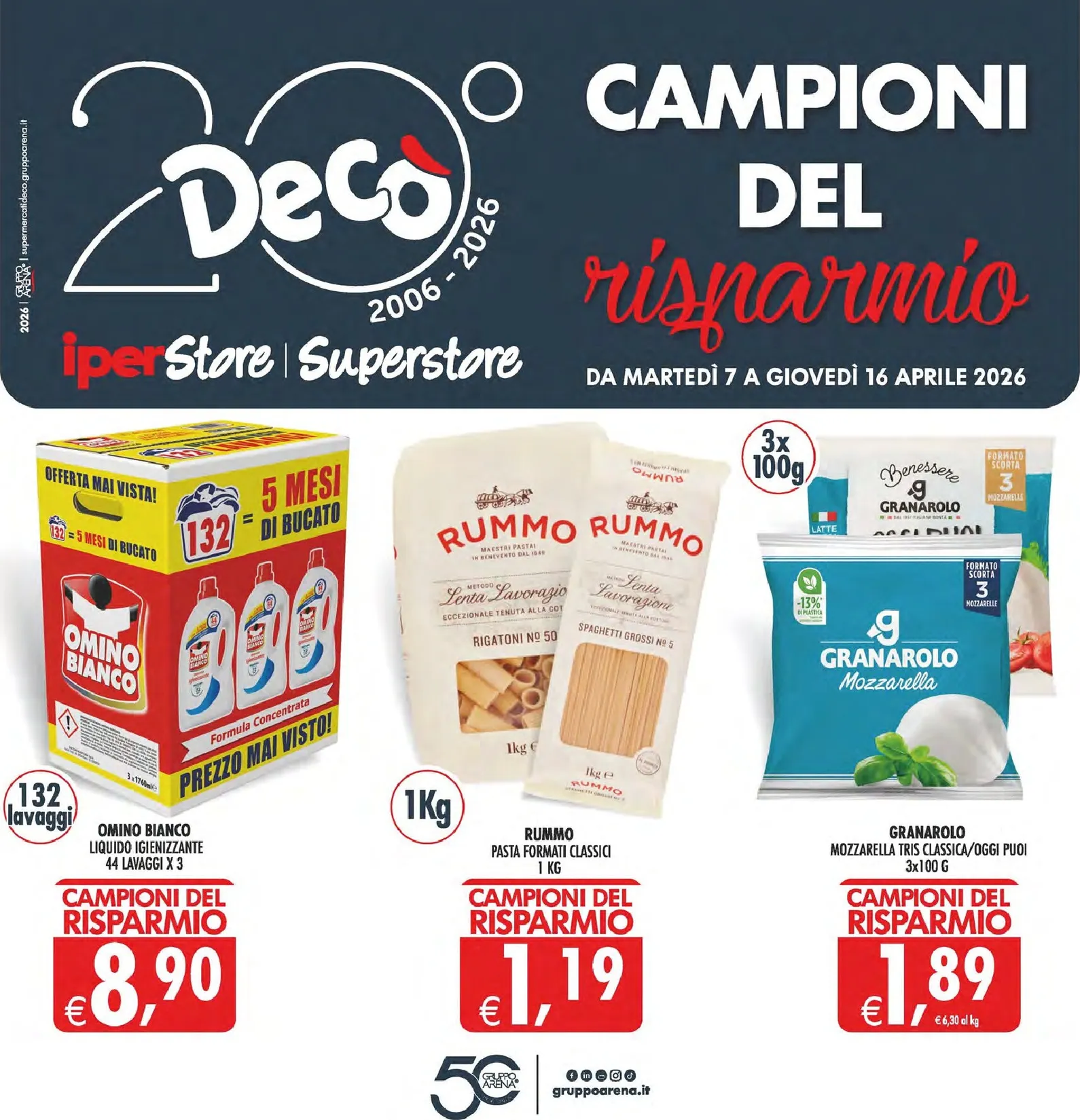 Con l’iniziativa “Campioni del Risparmio”, Decò presenta offerte incredibili. In evidenza troviamo Omino Bianco liquido (132 lavaggi) a 8,90€, la pasta Rummo da 1 kg a 1,19€ e la mozzarella Tris Granarolo a 1,89€. Queste nuovo offerte sono state create per garantire un risparmio concreto. Sfruttando Deco Volantino dal 07/04/2026 è facile fare una spesa completa e conveniente, unendo qualità e piccolo prezzo.