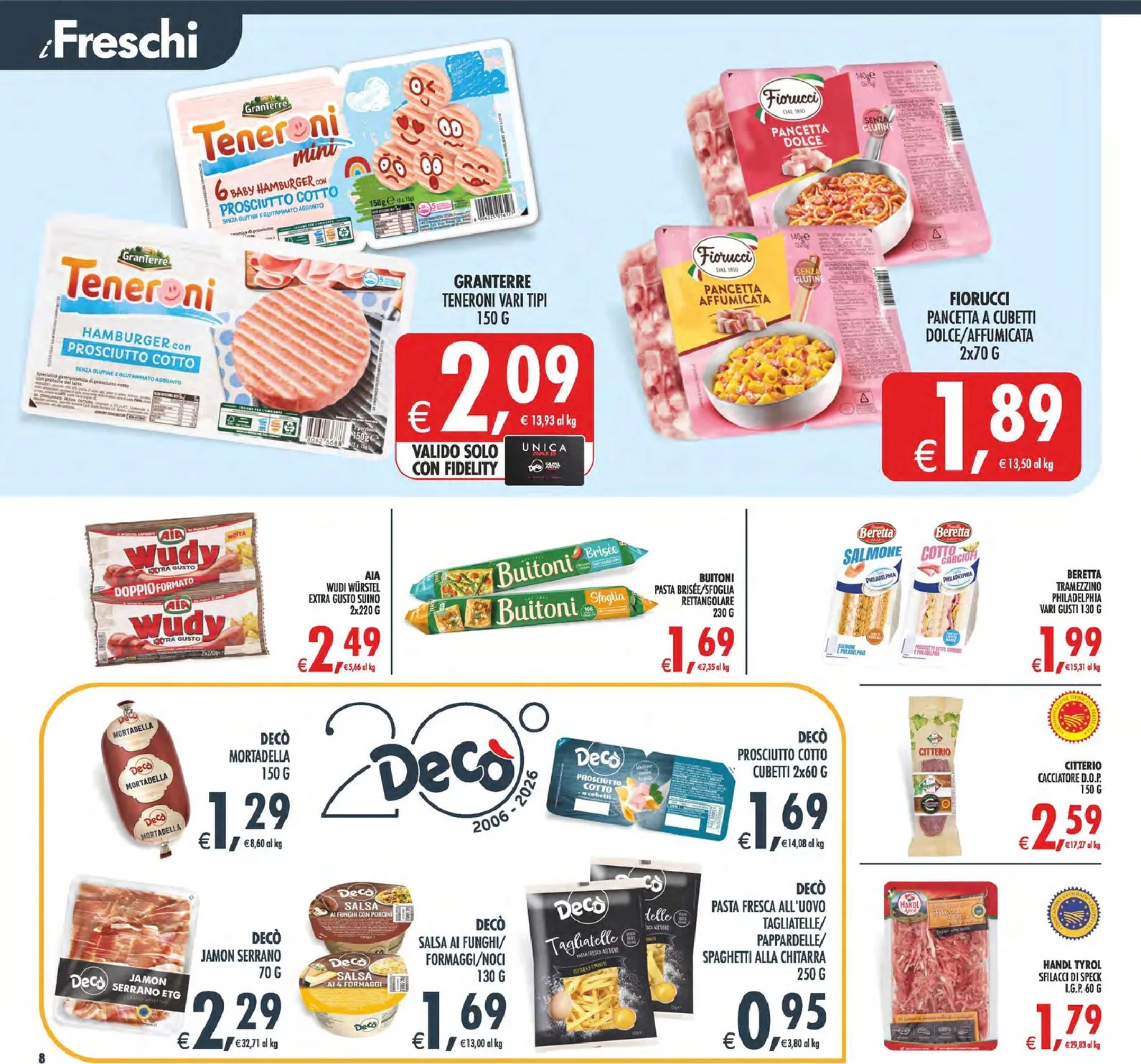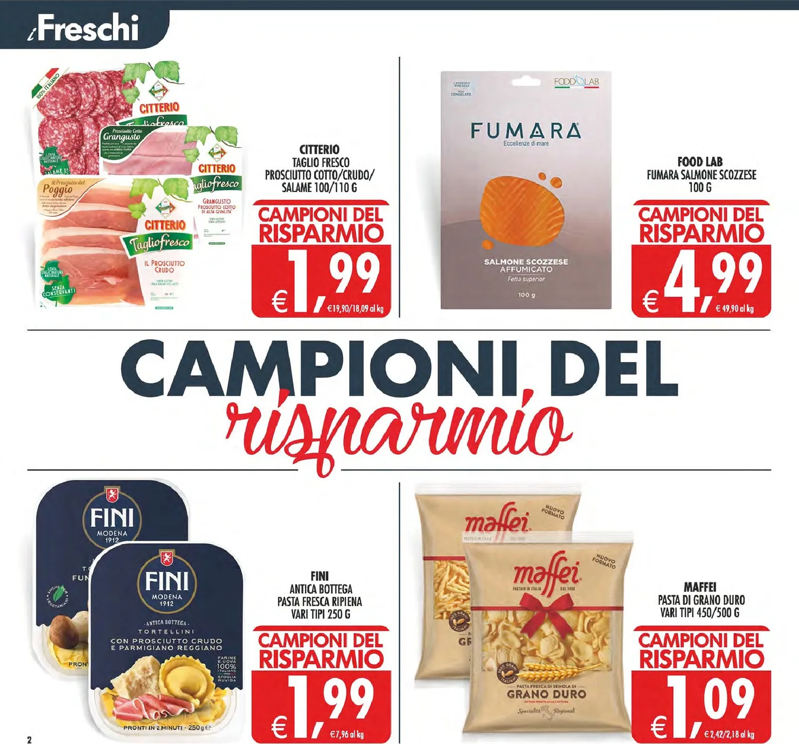 La convenienza prosegue nel reparto freschi. I salumi Citterio, come prosciutto cotto e crudo, sono proposti a 1,99€, perfetti per ogni occasione. Per un tocco di eleganza, il salmone scozzese affumicato Fumara è a 4,99€. Per i primi piatti, la pasta fresca ripiena Fini è a 1,99€, mentre la pasta di grano duro Maffei, in vari formati, è disponibile al nuovo prezzo speciale di soli 1,09€.