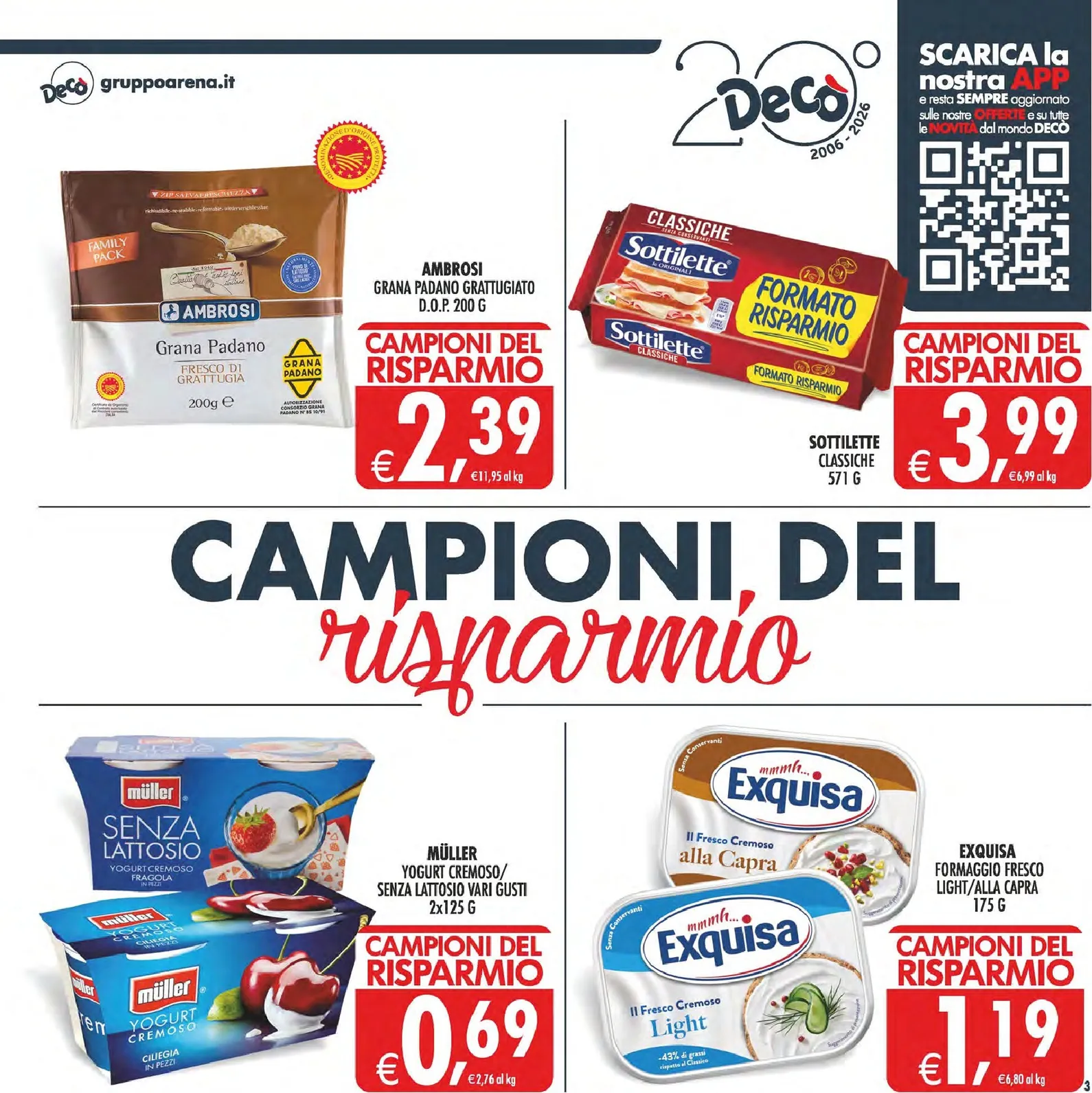 Le offerte Decò continuano con altri prodotti essenziali per la tavola. Il Grana Padano grattugiato Ambrosi (200g) è a 2,39€ e le Sottilette Classiche in formato risparmio a 3,99€. Per una pausa gustosa, lo yogurt cremoso Müller, anche senza lattosio, costa solo 0,69€. Infine, il formaggio fresco Exquisa, nelle varianti Light o alla Capra, è in promozione a 1,19€, ideale per ricette leggere.