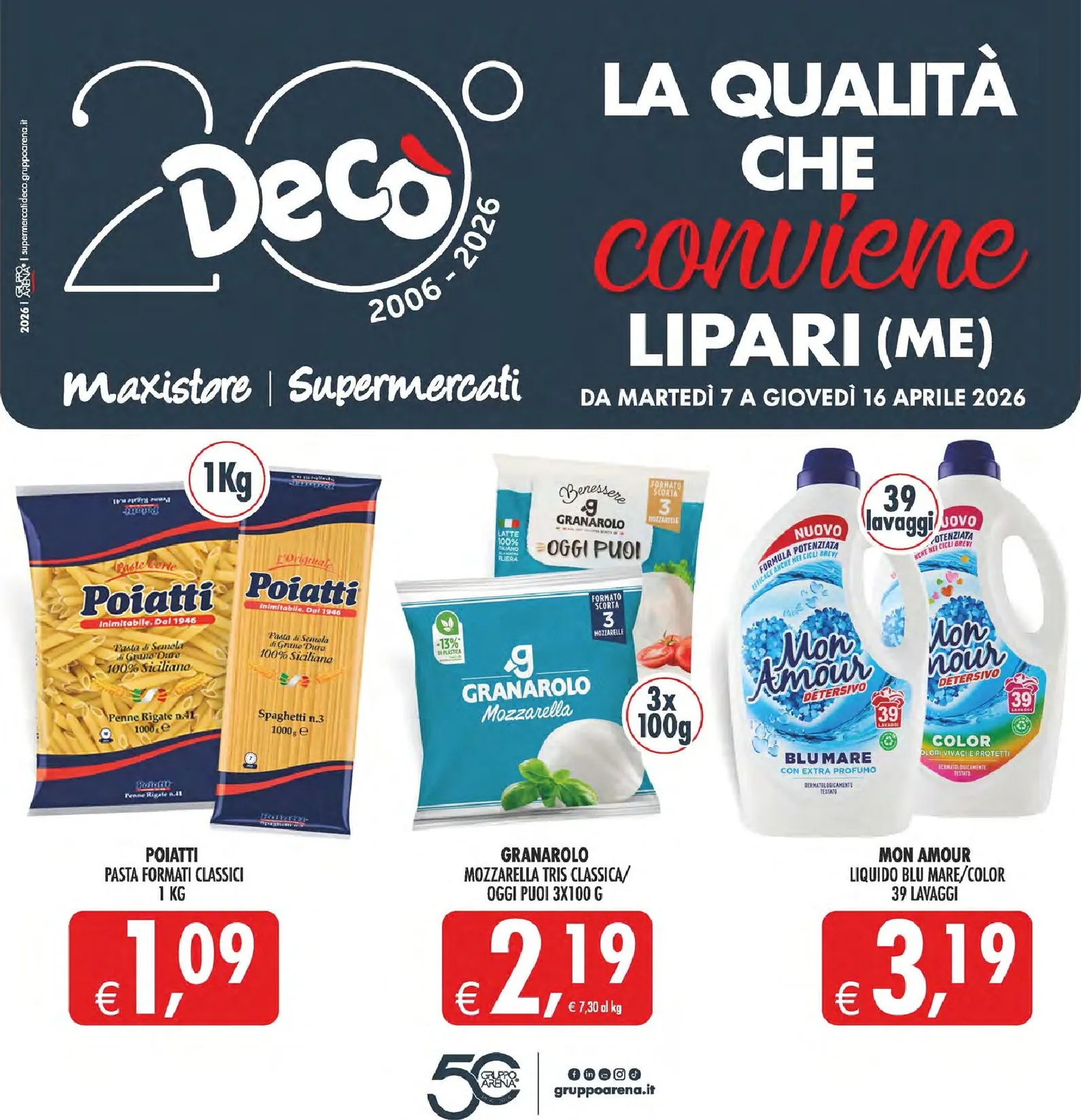 Il nuovo volantino Deco, valido a Lipari dal 7 al 16 aprile 2026, offre una selezione di sconti imperdibili. In copertina spiccano prodotti essenziali come la pasta Poiatti da 1 kg a soli 1,09€ e la mozzarella Tris Granarolo a 2,19€. Anche per la casa c’è convenienza, con il detersivo Mon Amour a 3,19€. Per chi cerca Deco Volantino dal 07/04/2026 queste offerte e sconti sono l’occasione giusta per risparmiare senza rinunciare alla qualità.