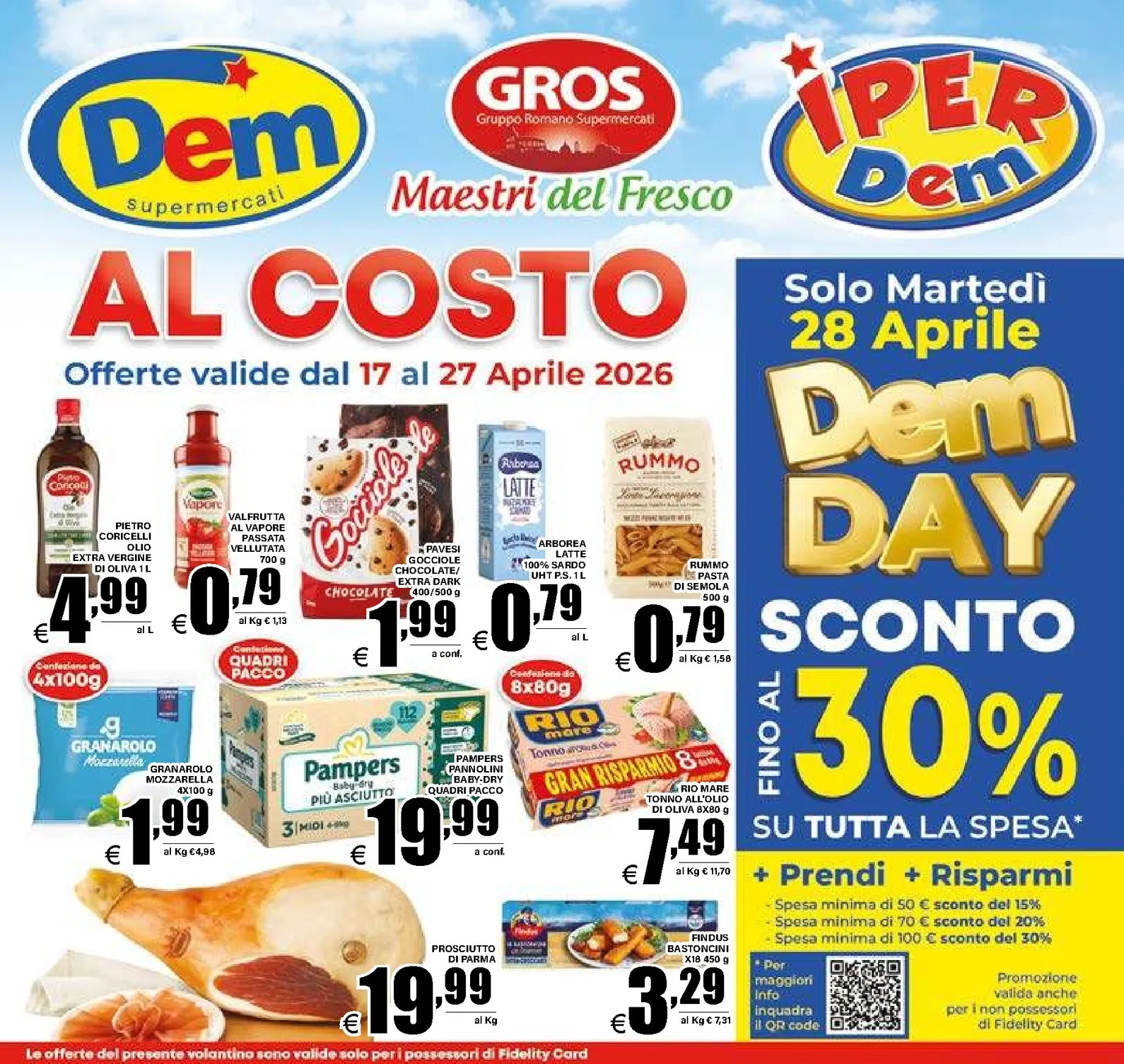Dal 17 al 27 Aprile, i supermercati Dem lanciano la promozione “Al Costo”, un’occasione imperdibile per la spesa di ogni famiglia. Questo nuovo volantino è ricco di prodotti a prezzi bassissimi. Sfogliando le pagine, troverete offerte convenienti e vi consigliamo di approfittare di questo Dem Volantino dal 17/04/2026 per fare scorta. La convenienza culmina il 28 Aprile con il “Dem Day”, che offre uno sconto fino al 30% sulla spesa.