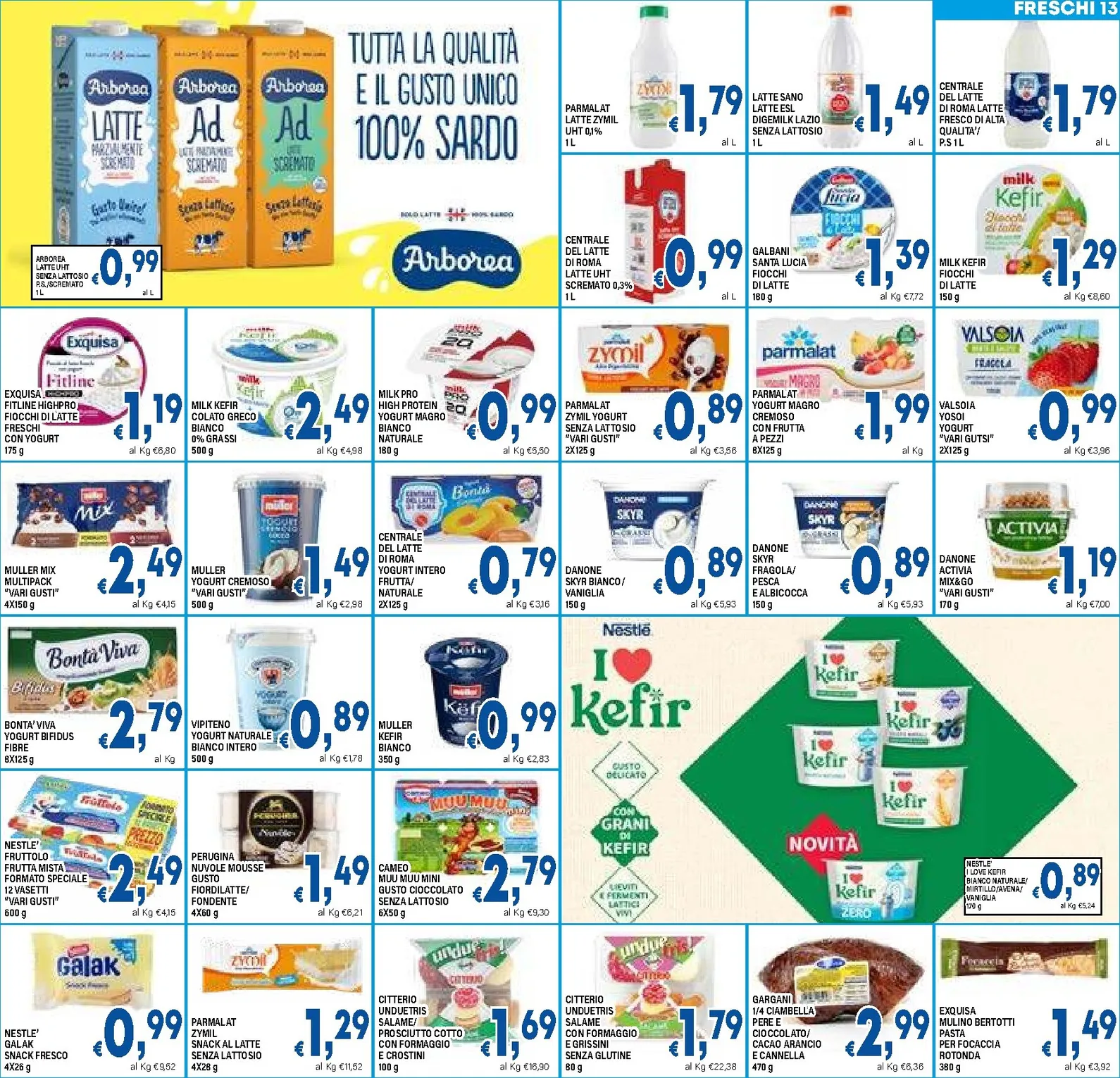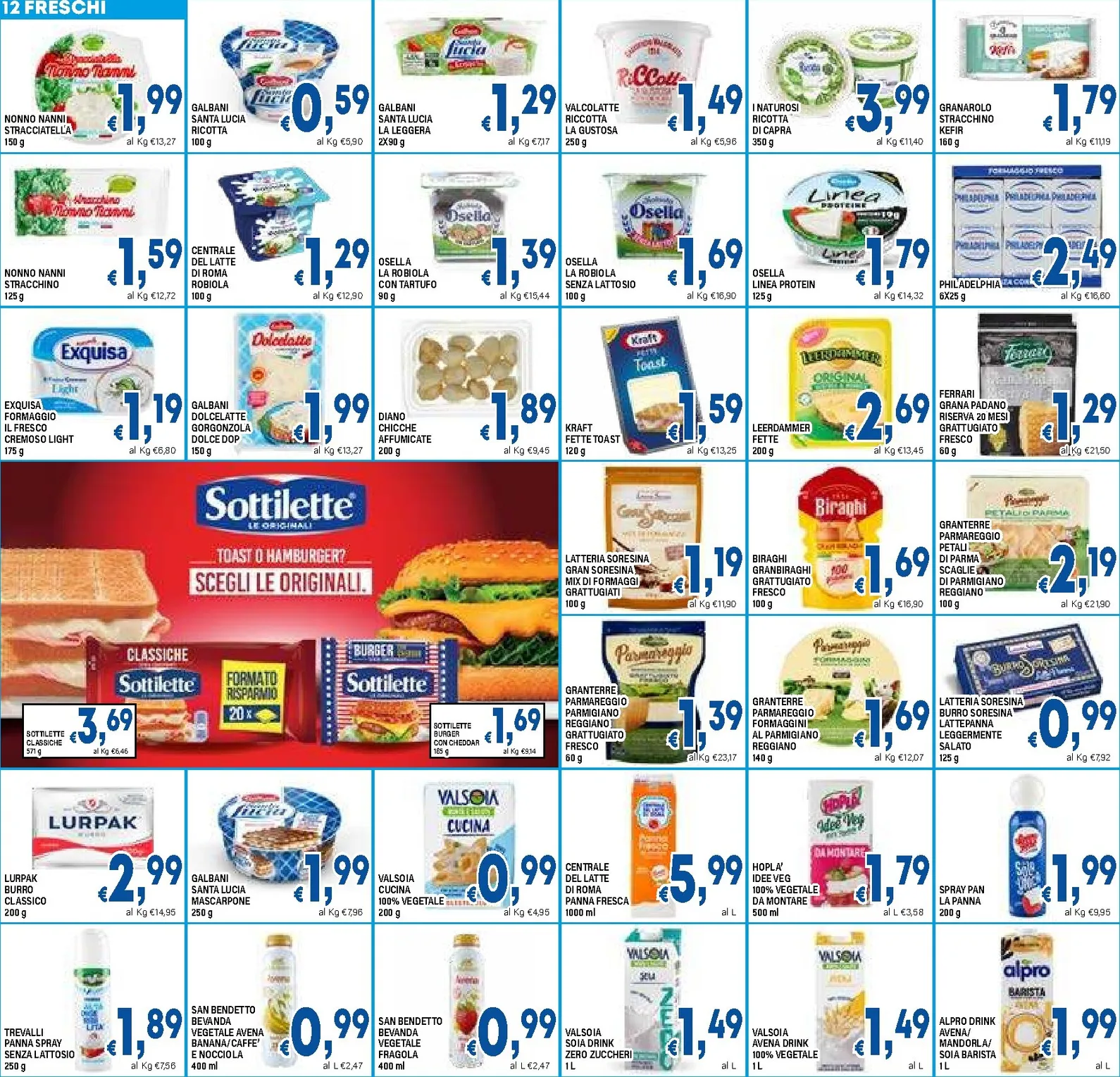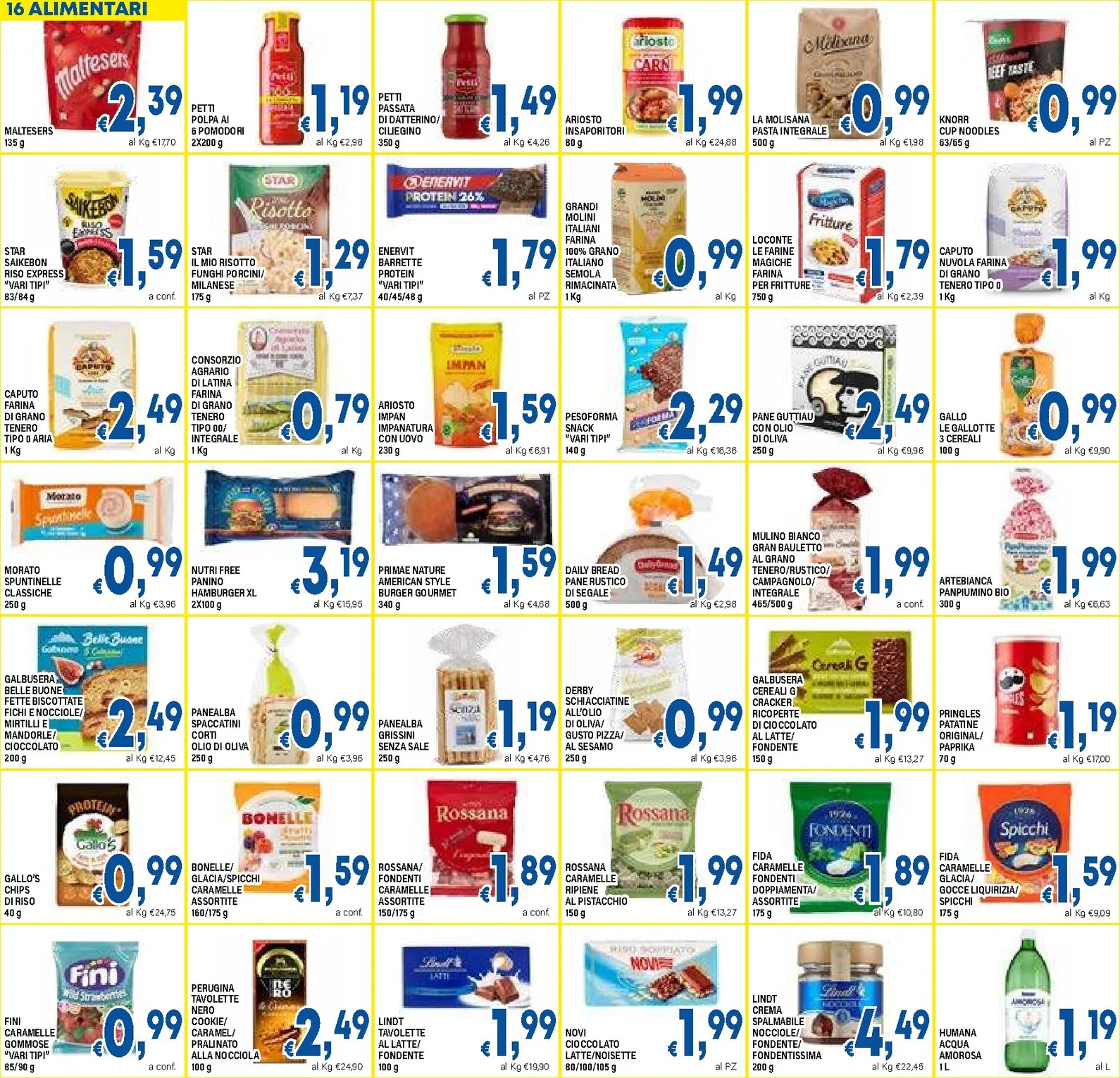 All’interno del volantino la convenienza continua. La dispensa si arricchisce con la pasta Rummo e il riso Gallo a soli 0,79 €. Per la colazione, ci sono i cereali Kellogg’s Extra a 2,49 € e una vasta scelta di biscotti Mulino Bianco. Il banco frigo propone prodotti freschi come lo yogurt Fage Total a 3,99 €, la mozzarella Granarolo a 1,99 € e il formaggio Philadelphia a 1,49 €.