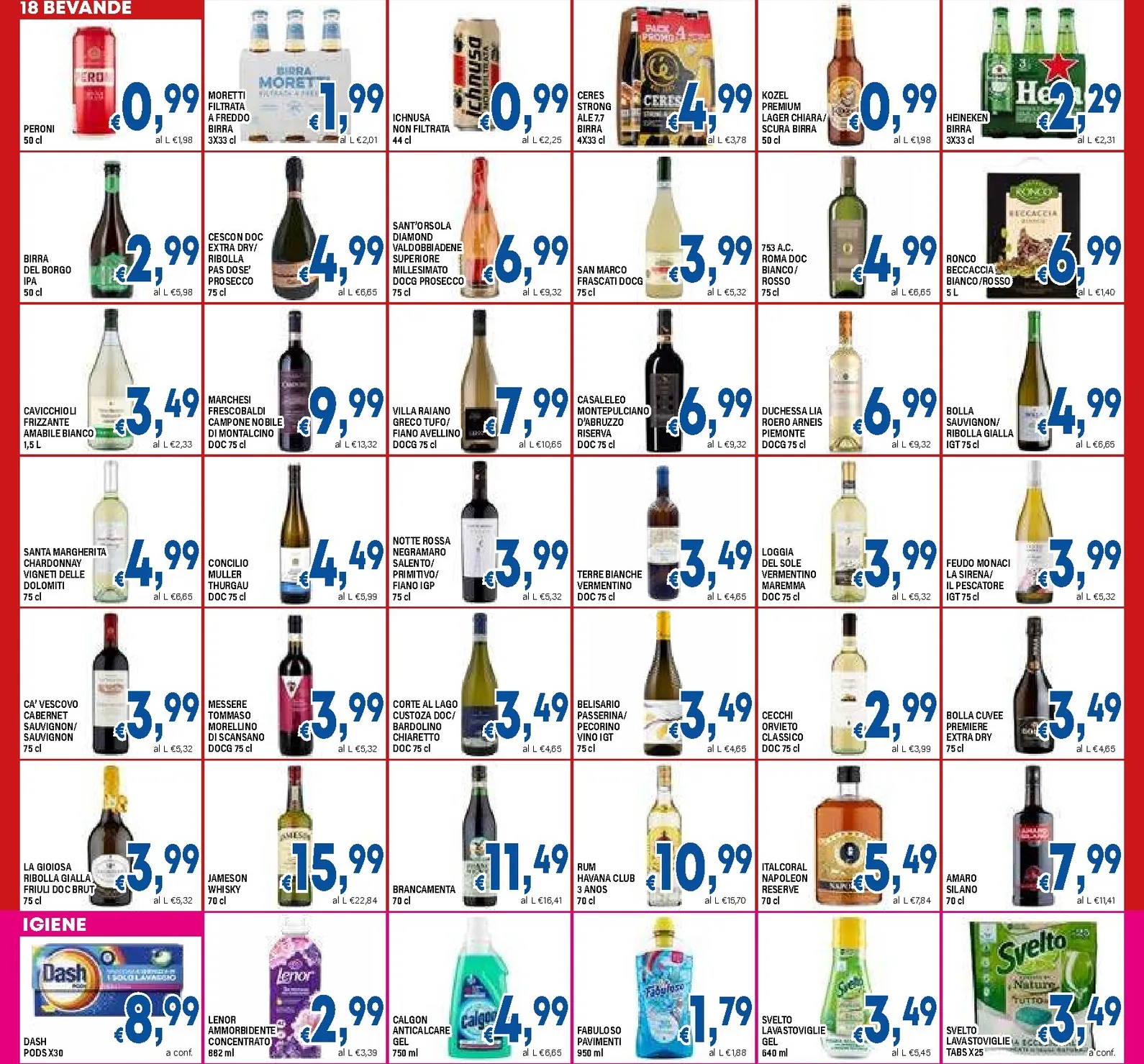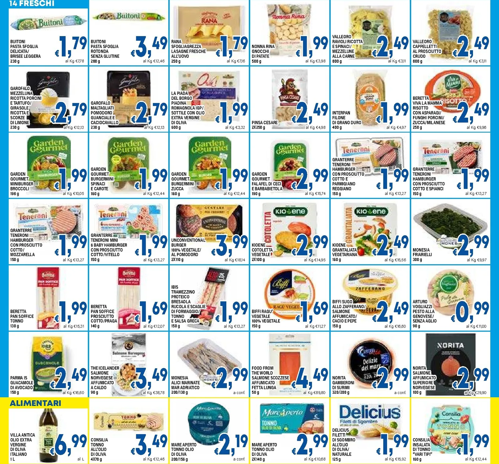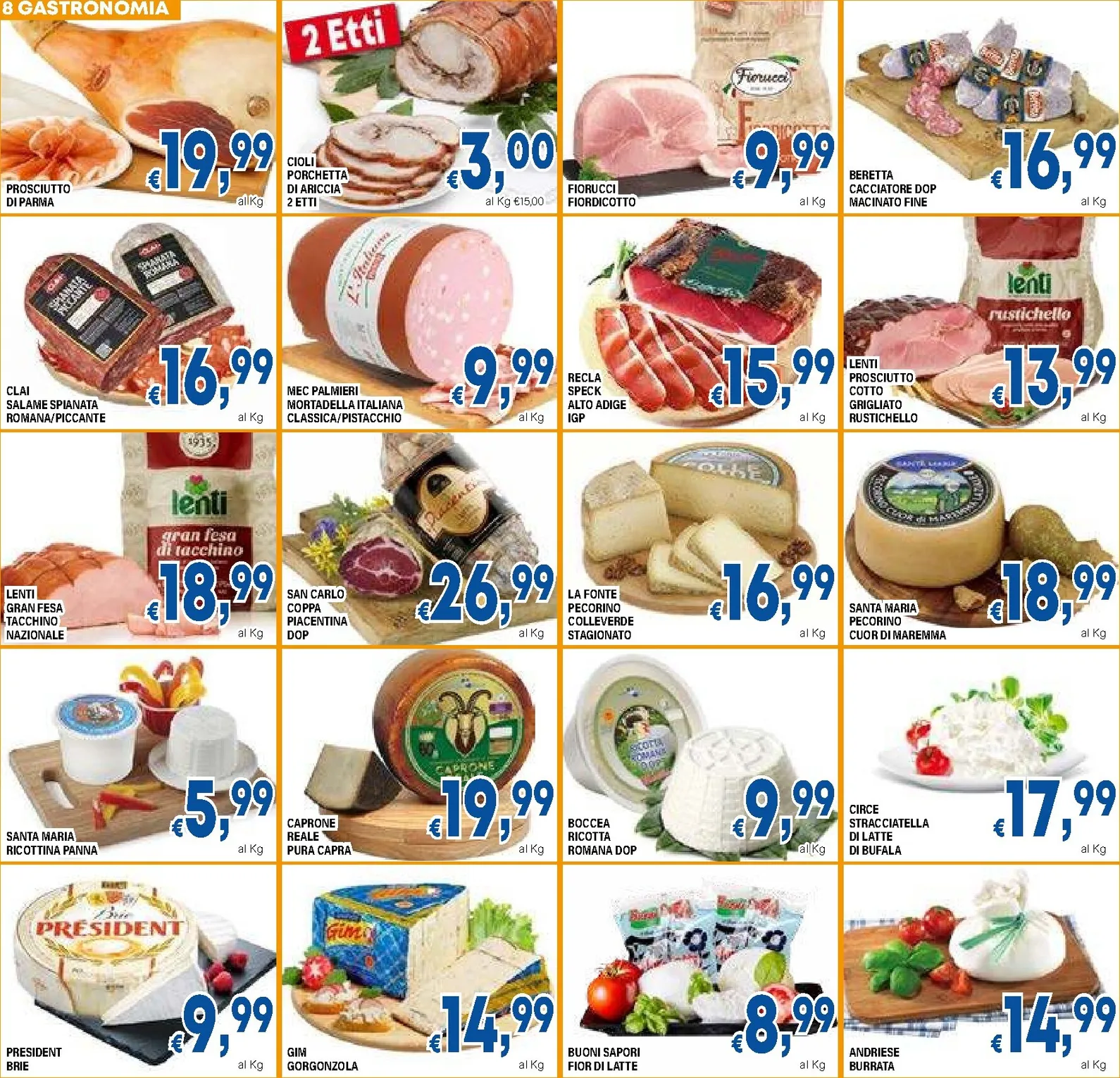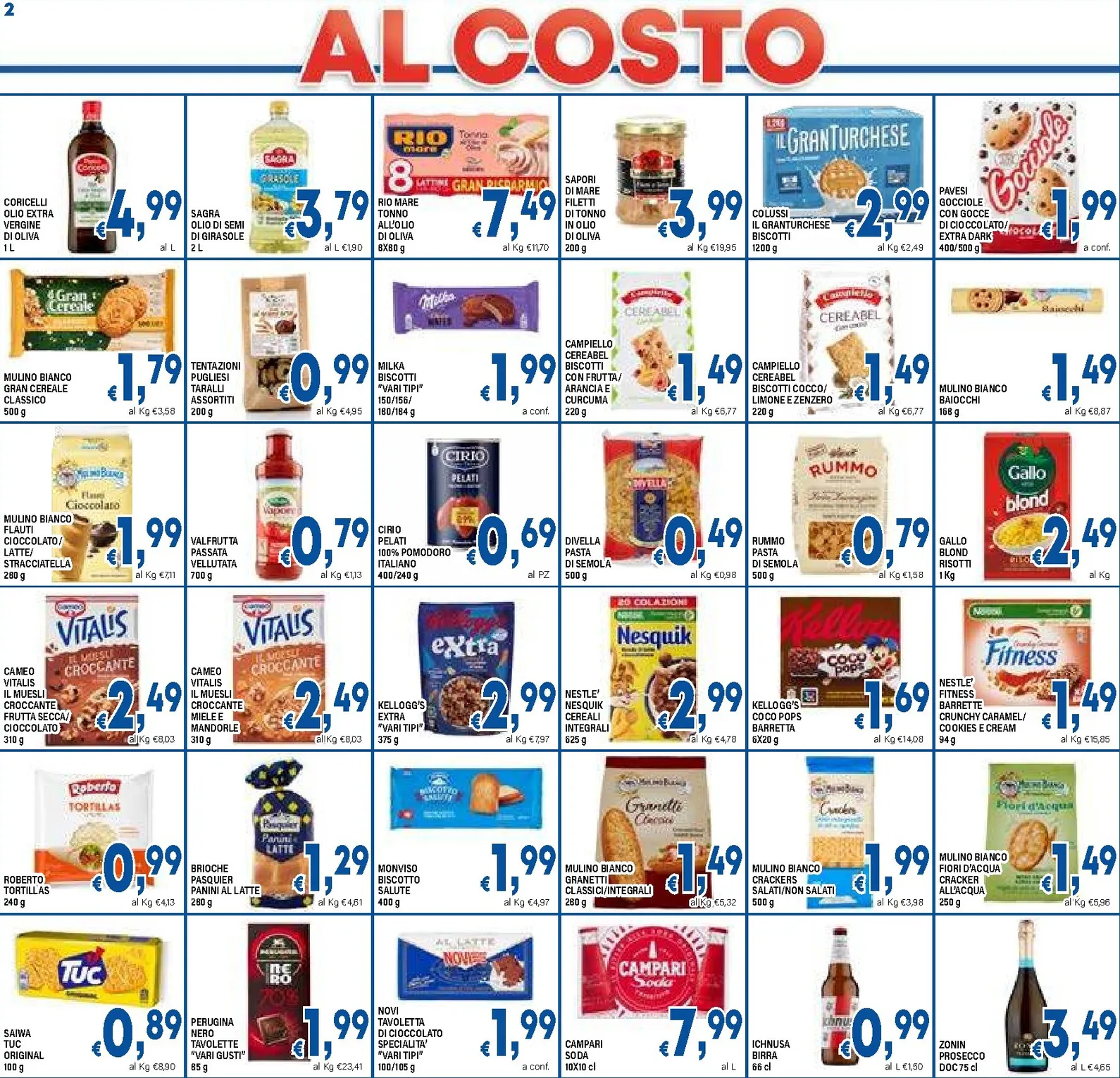 Le offerte in copertina sono un ottimo esempio del risparmio. L’Olio Extra Vergine Coricelli da 1L è proposto a 4,99 €, mentre la Passata Valfrutta a 0,79 €. Per chi cerca la qualità, il Prosciutto di Parma è a 19,99 € al kg. Attenzione alle famiglie con il maxi pacco di pannolini Pampers a 19,99 € e la confezione di Tonno Rio Mare a 7,49 €. Per la colazione, i frollini Gocciole Pavesi sono a 1,99 €.