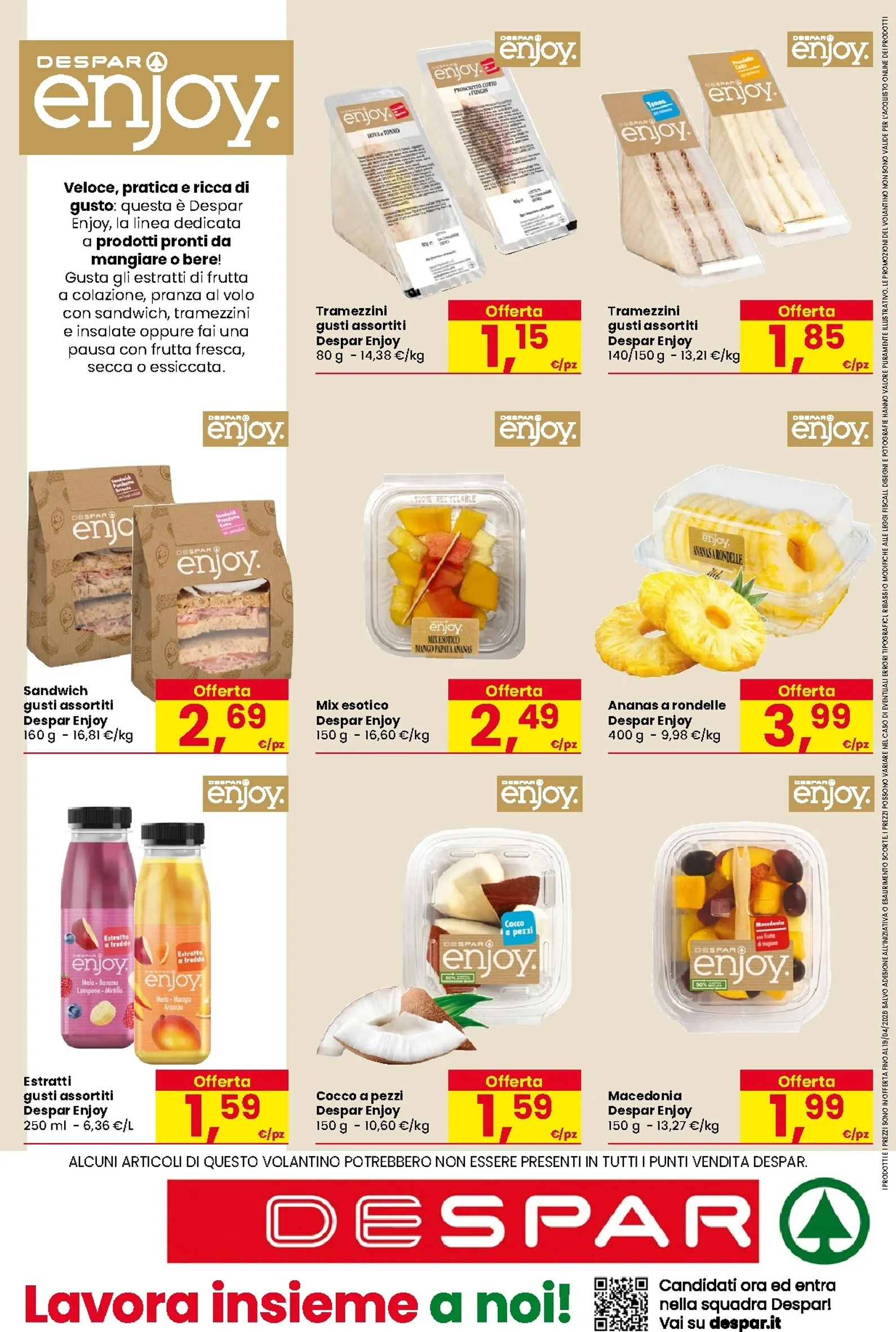 Per chi ha poco tempo, la linea Despar Enjoy è la soluzione perfetta. Sono in offerta tramezzini e sandwich assortiti a partire da 1,15€, ideali per una pausa pranzo veloce. La gamma include anche frutta fresca già pronta come macedonia e ananas. Per scoprire tutte le nuovo offerte, consultate il nuovo Despar Volantino online. Lì troverete ogni Despar Volantino dal 09/04/2026 studiata per offrire il massimo risparmio e qualità ai clienti.