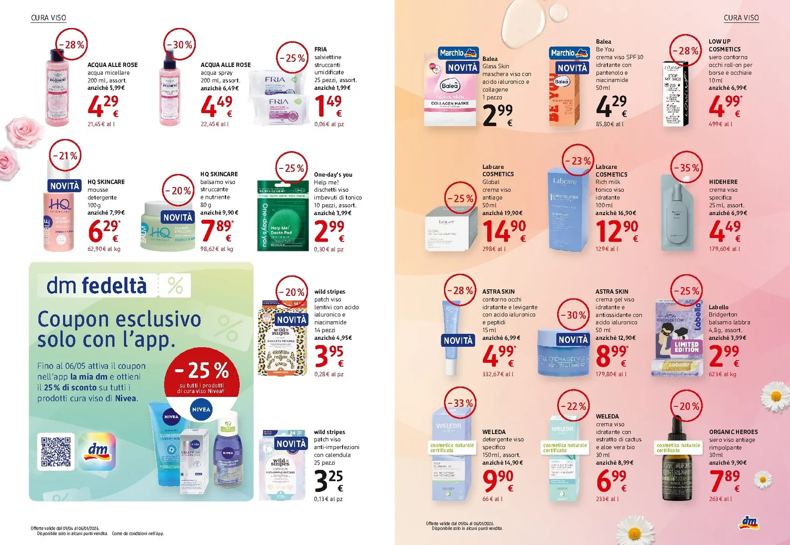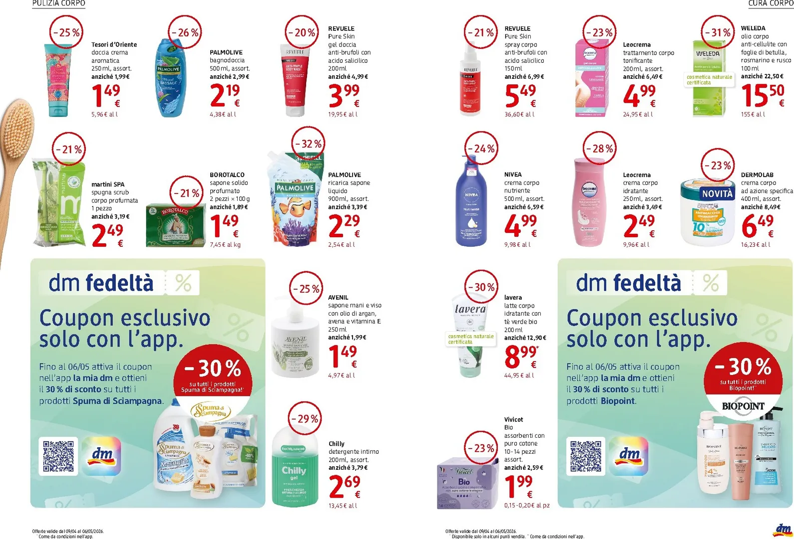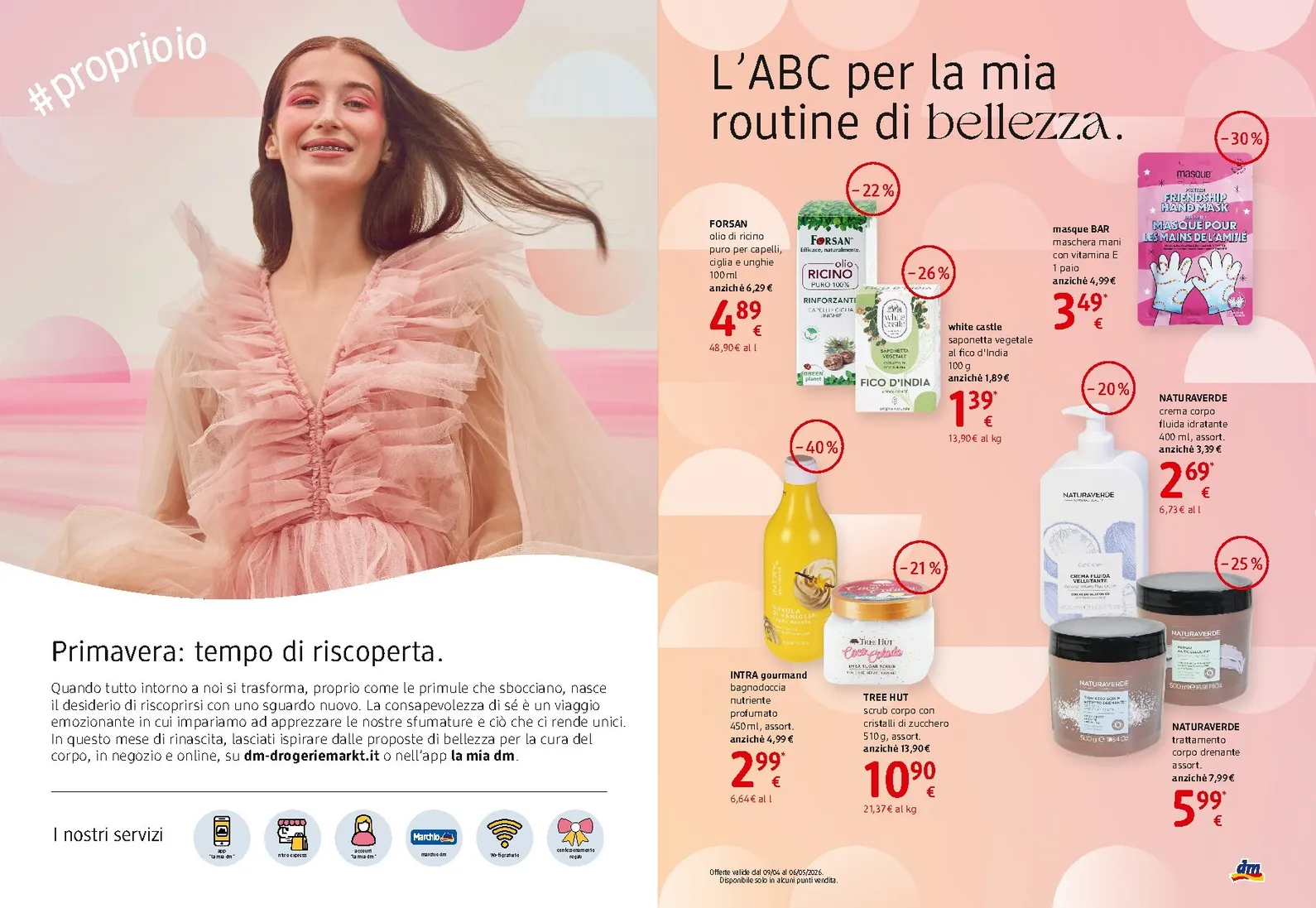 La primavera sboccia da DM con un nuovo volantino ricco di offerte per la bellezza, valide fino al 6 maggio. Il catalogo “Il bello di essere me” invita a rinnovare la routine di cura personale. Questo è il momento giusto per scoprire le DM Drogerie Markt Volantino dal 09/04/2026 e approfittare di sconti notevoli. Tra le nuovo offerte di punta, troviamo l’olio corpo Weleda al -31%, il bagnodoccia Intra Gourmand al -40% e lo scrub corpo Tree Hut al -21%.