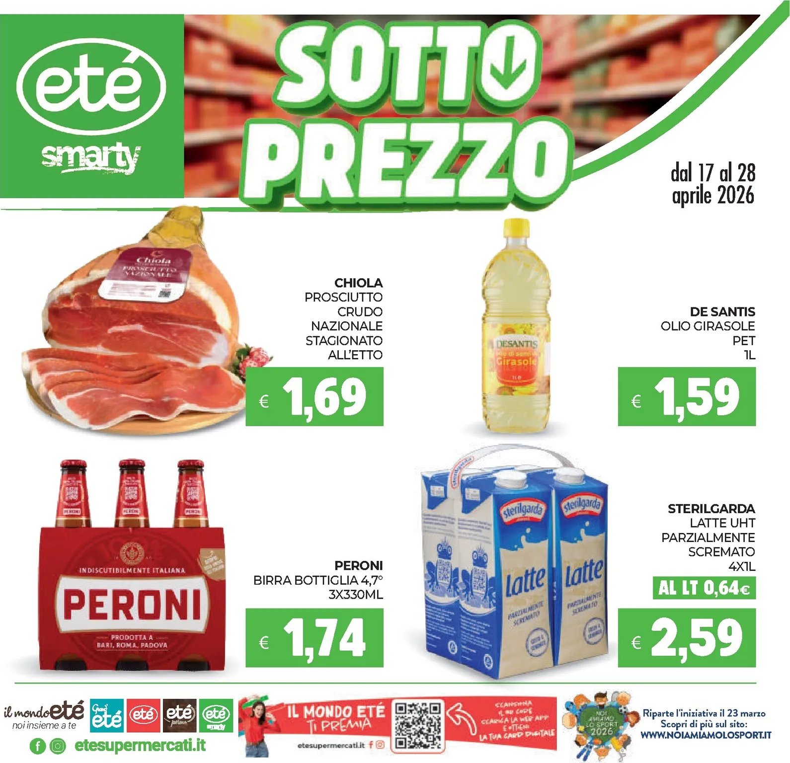 Dal 17 al 28 aprile 2026, Ete lancia la promozione “Sotto Prezzo”, un’occasione unica per una spesa di qualità a costi ridotti. Tra le migliori offerte spiccano il Prosciutto Crudo Chiola a 1,69€ e l’Olio De Santis a 1,59€. È il momento ideale per fare scorta di prodotti essenziali. Grazie al nostro Ete Volantino dal 17/04/2026 è possibile pianificare gli acquisti e massimizzare il risparmio su una vasta selezione di articoli, garantendo la convenienza che cerchi ogni giorno.