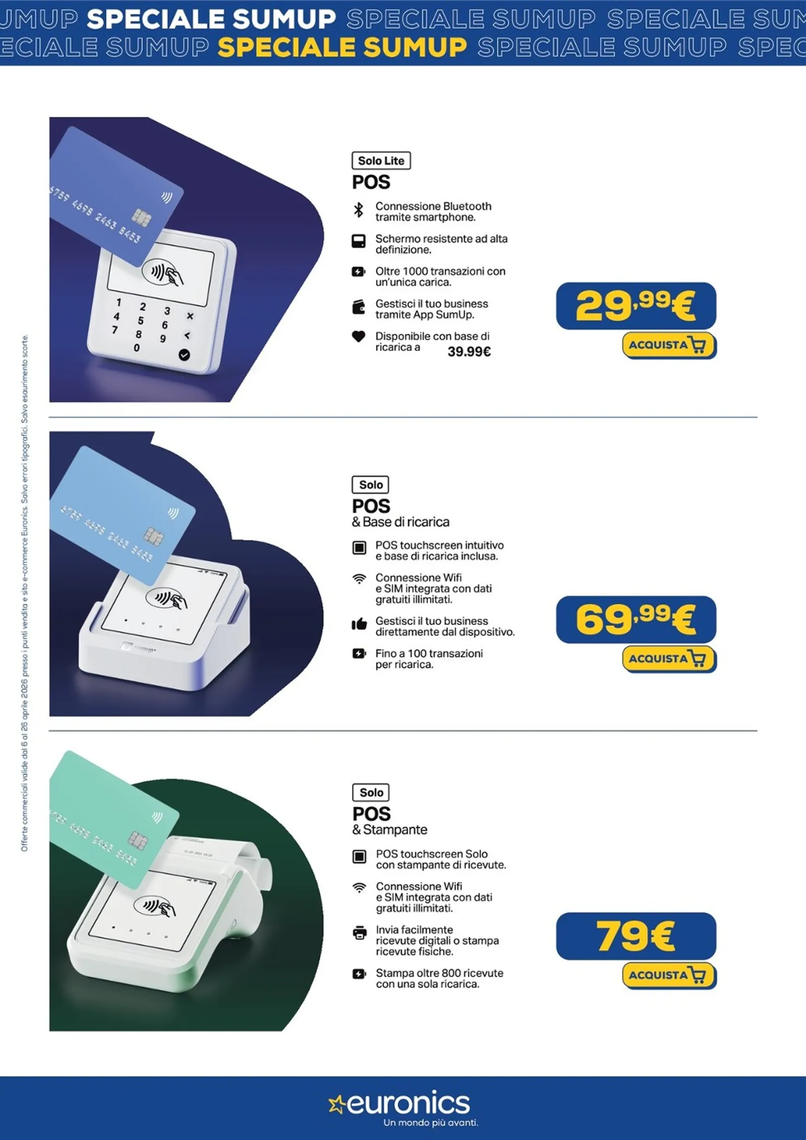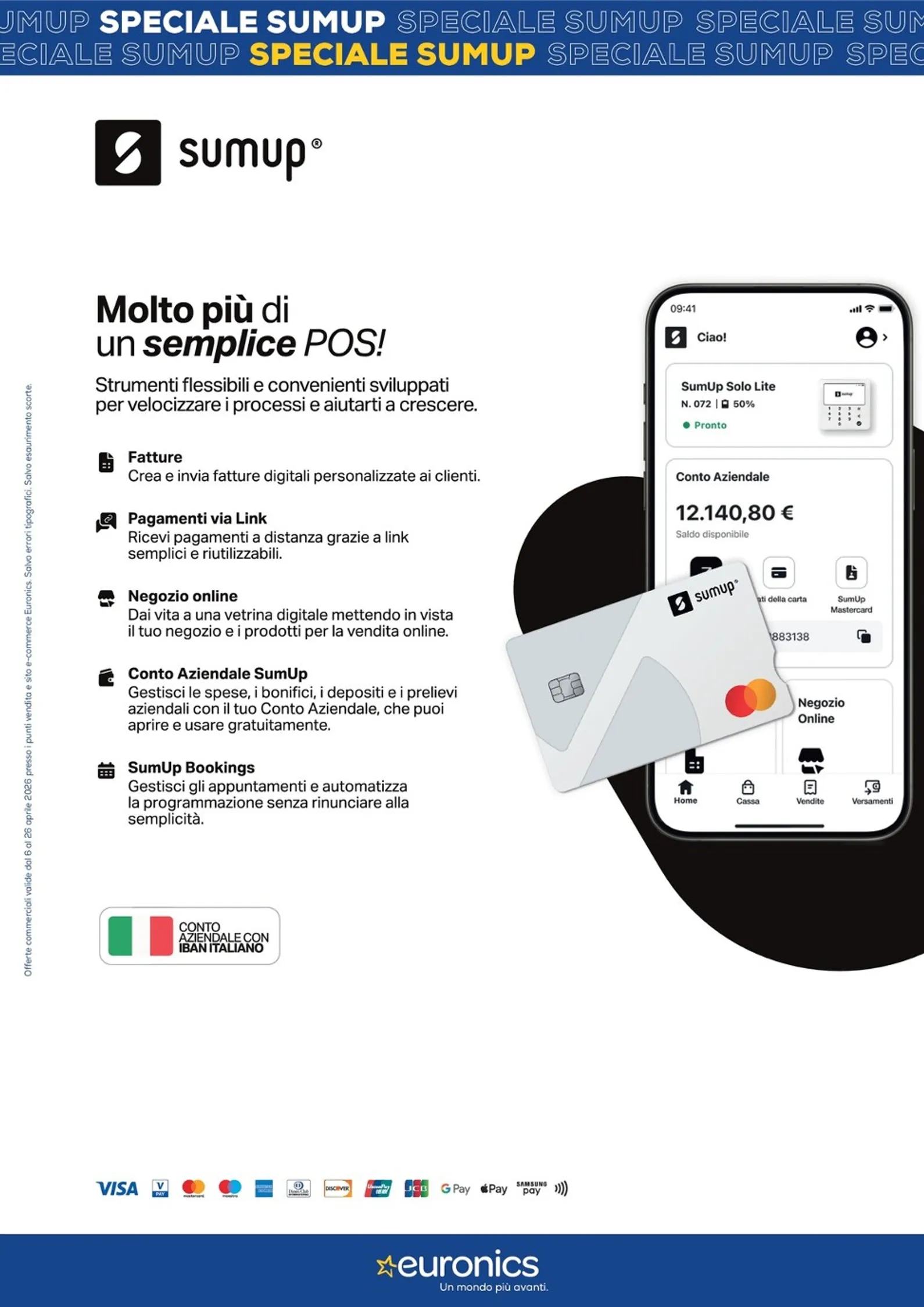Il nuovo volantino Euronics presenta lo “Speciale SumUp”, con offerte imperdibili per modernizzare la gestione dei pagamenti. In copertina spicca il Terminal SumUp a 149,99€, un dispositivo portatile all-in-one per gestire cassa, ordini e catalogo prodotti. È la soluzione ideale per chi cerca efficienza. Grazie a Euronics Volantino dal 06/04/2026 potrai finalmente portare la tua attività nel futuro digitale con estrema semplicità.