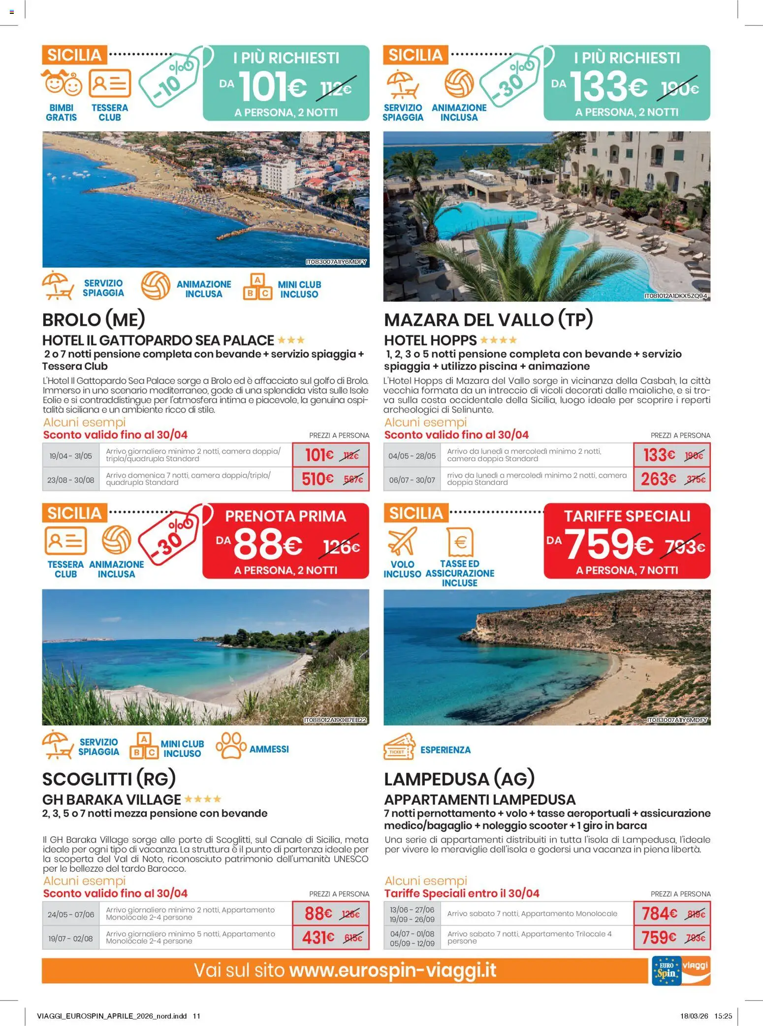 La primavera è alle porte e con essa la voglia di evasione e di nuove scoperte. Eurospin Viaggi risponde a questo desiderio con un catalogo ricco di proposte imperdibili per il mese di aprile. Il nuovo volantino Eurospin dal 01 aprile al 30 aprile 2026 è la guida perfetta per pianificare le prossime vacanze, che siano un breve weekend di relax o un’avventura estiva prenotata in anticipo. L’offerta di copertina è un invito irresistibile a scoprire le meraviglie della Sicilia, con un soggiorno di 2 notti per 2 persone a partire da soli 88€. Un’occasione unica per immergersi nelle acque cristalline e nei paesaggi mozzafiato di una delle isole più belle del Mediterraneo.