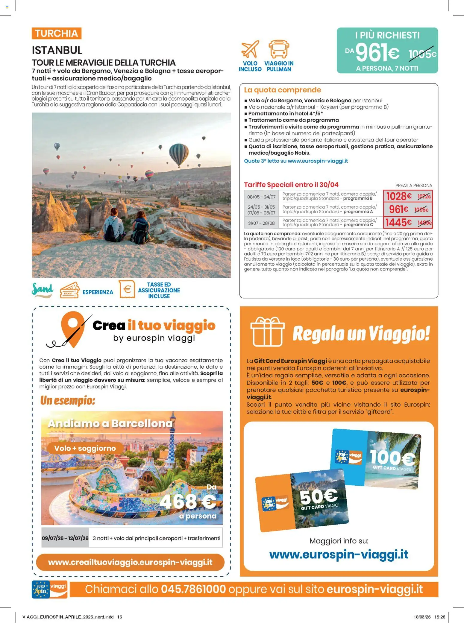 Per chi sogna un’avventura più esotica, il volantino Eurospin dal 01 aprile al 30 aprile 2026 propone un affascinante tour in Turchia. Un viaggio di 7 notti alla scoperta di Istanbul e delle meraviglie della Cappadocia, con volo incluso, a partire da 961€. Un’esperienza culturale completa, organizzata nei minimi dettagli per un’immersione totale nelle tradizioni e nei paesaggi lunari turchi. E se siete indecisi sulla meta, perché non regalare un viaggio? Con le Gift Card Eurospin da 50€ e 100€, potrete donare un’esperienza indimenticabile a chi amate.