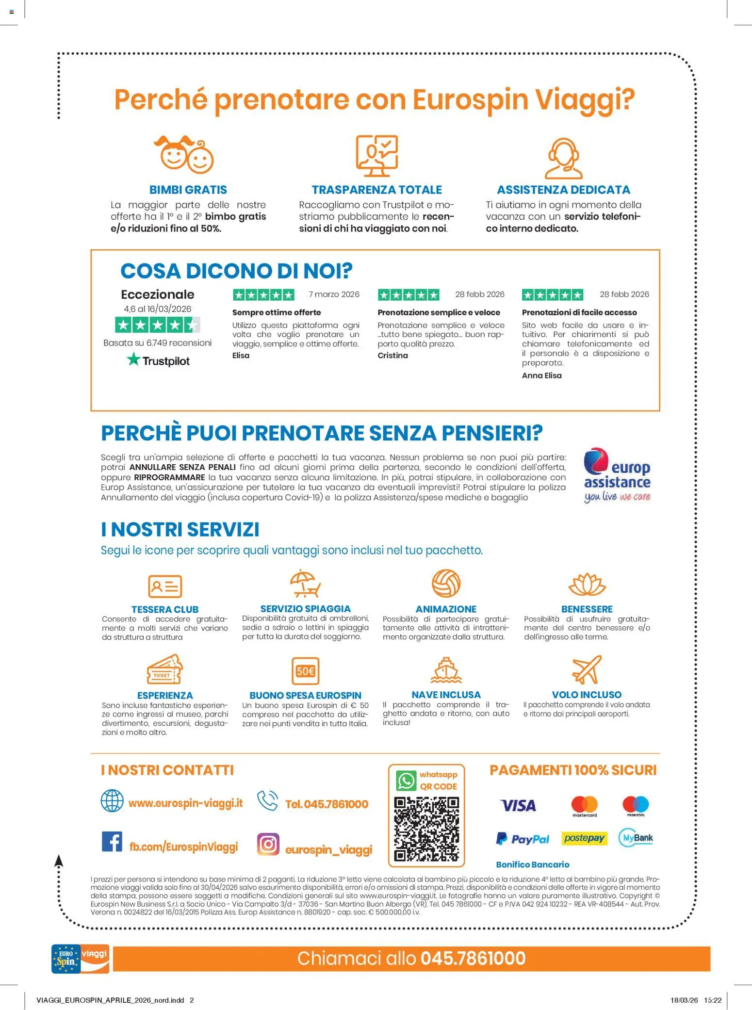 Scegliere Eurospin Viaggi significa affidarsi a un partner che garantisce trasparenza e convenienza. Le numerose recensioni positive su Trustpilot confermano l’affidabilità del servizio, che include vantaggi esclusivi come l’opzione “Bimbi Gratis” in molte strutture, l’assistenza dedicata e pacchetti completi di servizi inclusi come tessera club, servizio spiaggia e animazione. Inoltre, la possibilità di stipulare un’assicurazione viaggio offre quella serenità in più per partire senza pensieri, coprendo eventuali imprevisti e garantendo un’esperienza di viaggio sicura e protetta.