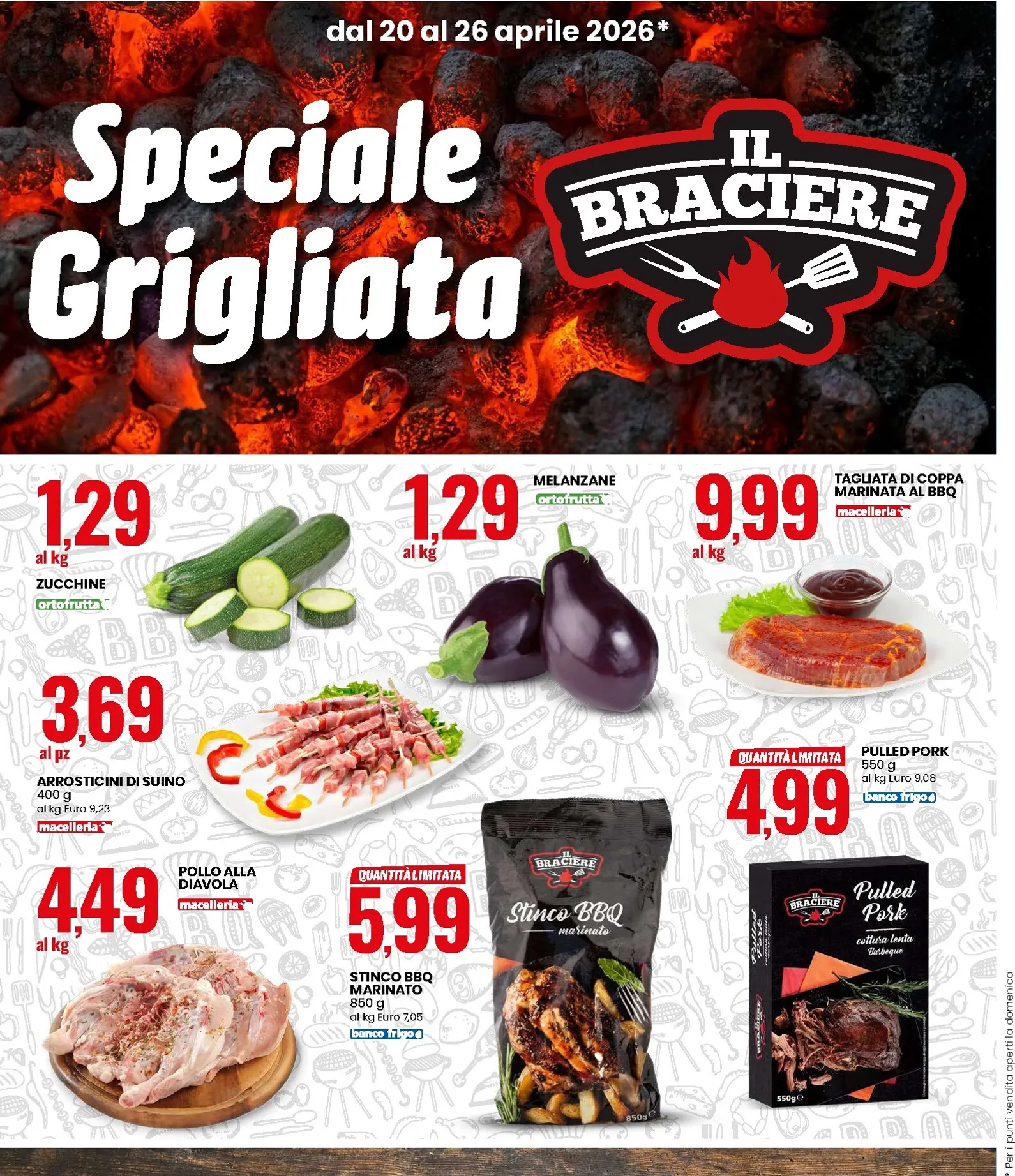 Le nuovo offerte continuano con tagli di carne selezionati come la gustosa Tagliata di coppa marinata (9,99 €/kg) e il Pollo alla diavola (4,49 €/kg). Non mancano gli sfiziosi Arrosticini di suino a 3,69 euro. Per i contorni, Zucchine e Melanzane fresche sono disponibili a 1,29 euro al kg. Un nuovo assortimento che arricchisce la vostra tavola con freschezza e gusto.