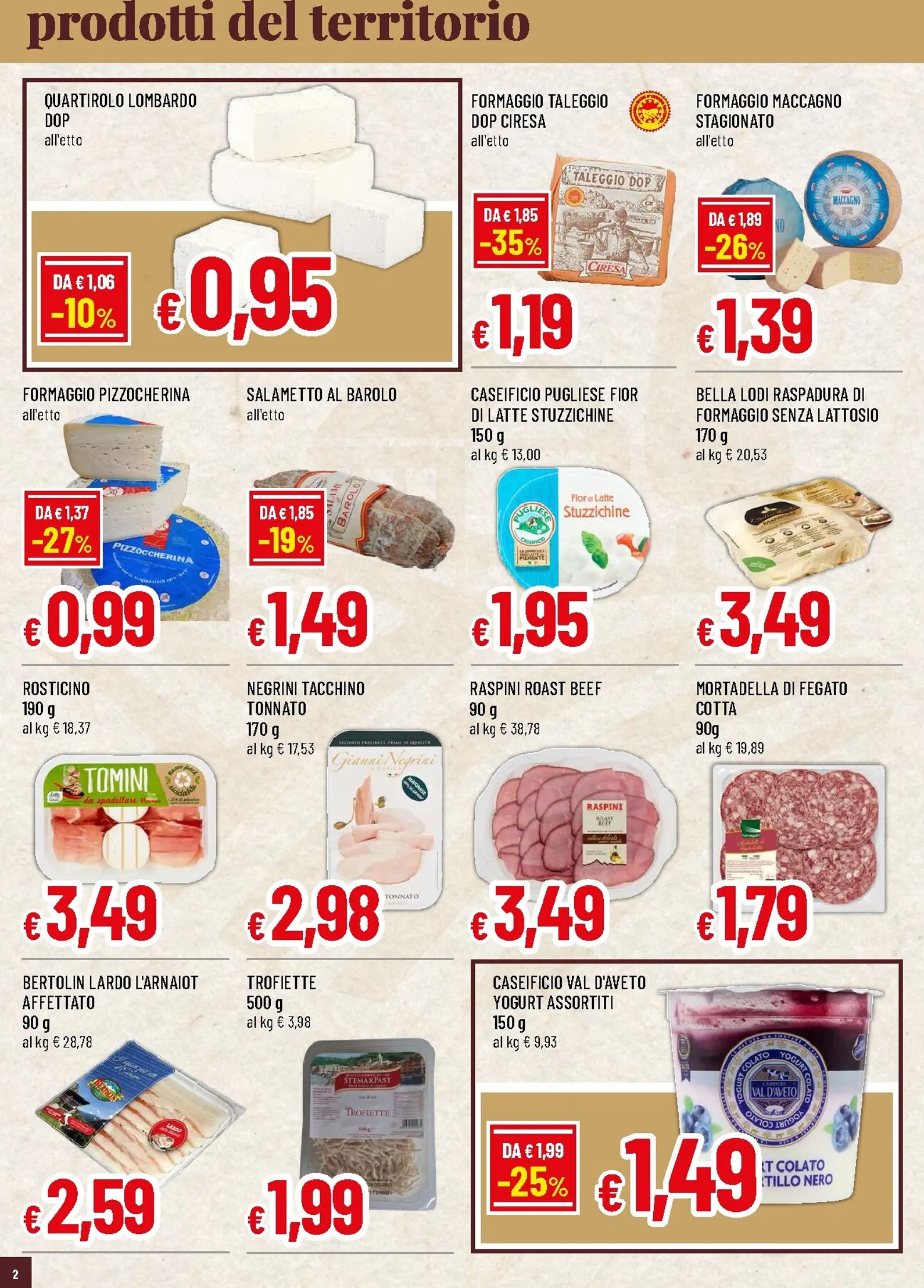 Il banco frigo si riempie di specialità casearie e salumi che raccontano una storia. Potrete trovare formaggi DOP come il Quartirolo Lombardo a 0,95€ e il Taleggio Ciresa a 1,19€. Per gli amanti dei salumi, il Salame al Barolo a 1,49€ rappresenta una vera delizia. Questa settimana, la selezione include anche il Lardo d’Arnaiot affettato e il Formaggio Pizzocherina, offrendo un’ampia scelta per comporre taglieri ricchi di gusto e tradizione. Ogni prodotto è un pezzo della nostra cultura culinaria, proposto a un prezzo vantaggioso.