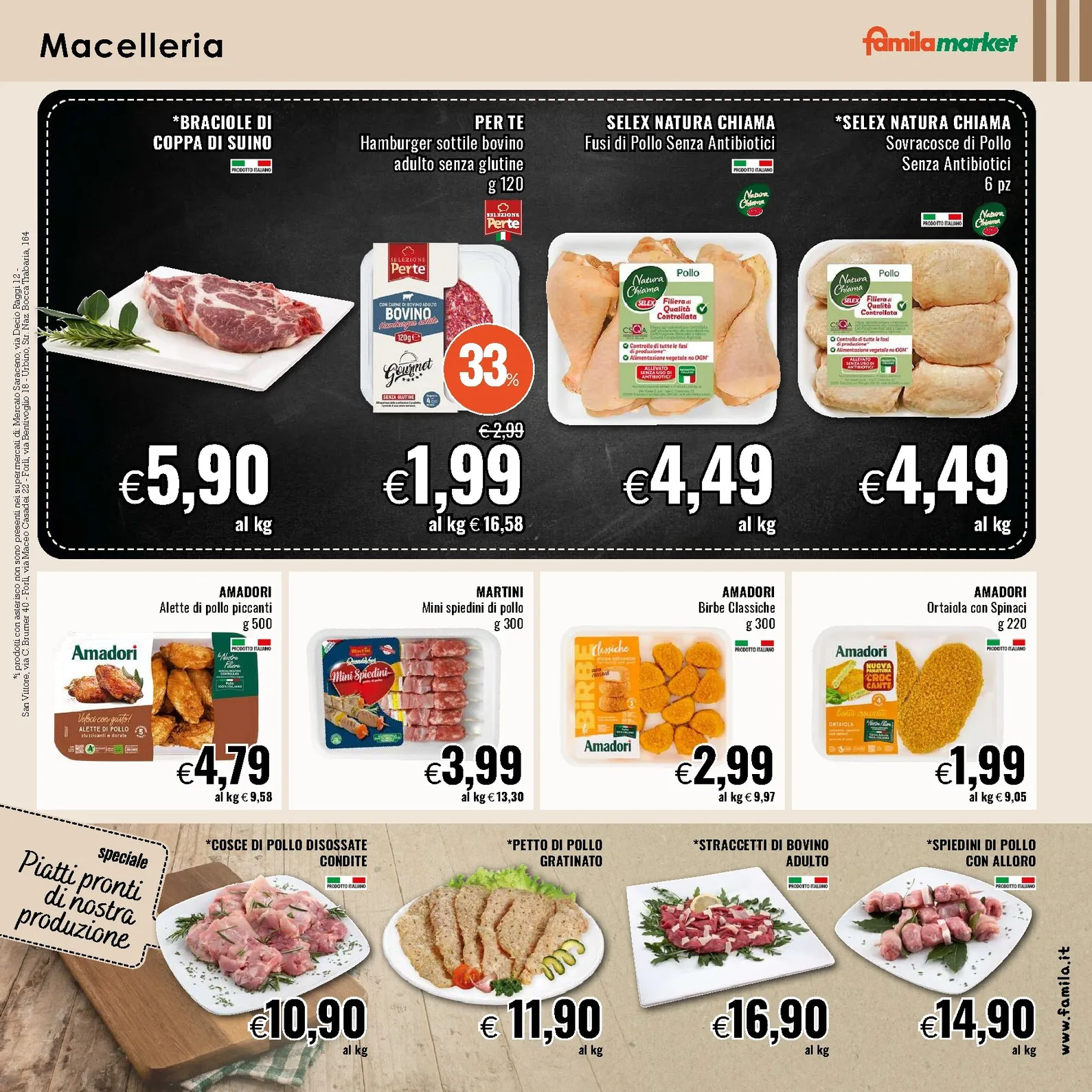 La macelleria risponde con una selezione di carni di prima scelta a prezzi competitivi. Le braciole di coppa di suino e gli hamburger di bovino sono ideali per pasti saporiti. Per chi preferisce le carni bianche, il volantino propone fusi e sovracosce di pollo Selex Natura Chiama, allevati senza uso di antibiotici. La gamma di preparati Amadori, come le birbe classiche, offre soluzioni rapide per la cena.