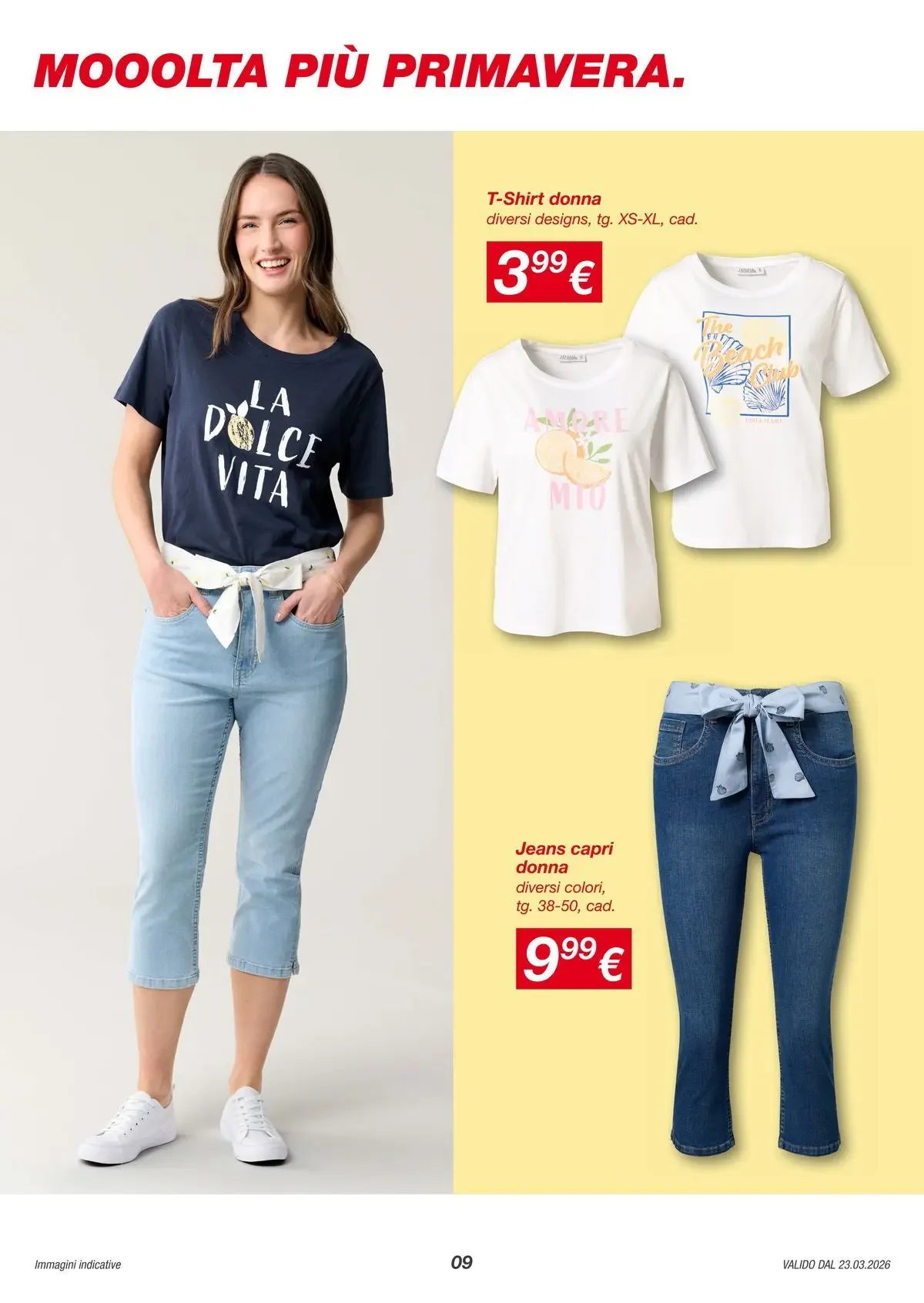Per l'uomo, spicca l'eleganza e la freschezza della Camicia uomo in misto lino, disponibile a soli 9,99€, ideale per le giornate più calde. Le donne troveranno un'ampia e variegata scelta: dalle versatili camicie in misto lino, proposte sia nelle taglie 40-52 a 9,99€ che nelle taglie forti a 14,99€, ai comodi pantaloni donna in misto lino a 14,99€. Non mancano gli accessori per completare ogni outfit, come la pratica borsa a tracolla donna a 5,99€ e le imperdibili Sneaker donna a un prezzo eccezionale di soli 4,99€. Anche i più piccoli potranno vestirsi alla moda con la T-Shirt bambina a 3,99€ e i pantaloni bambina in misto lino a 7,99€.